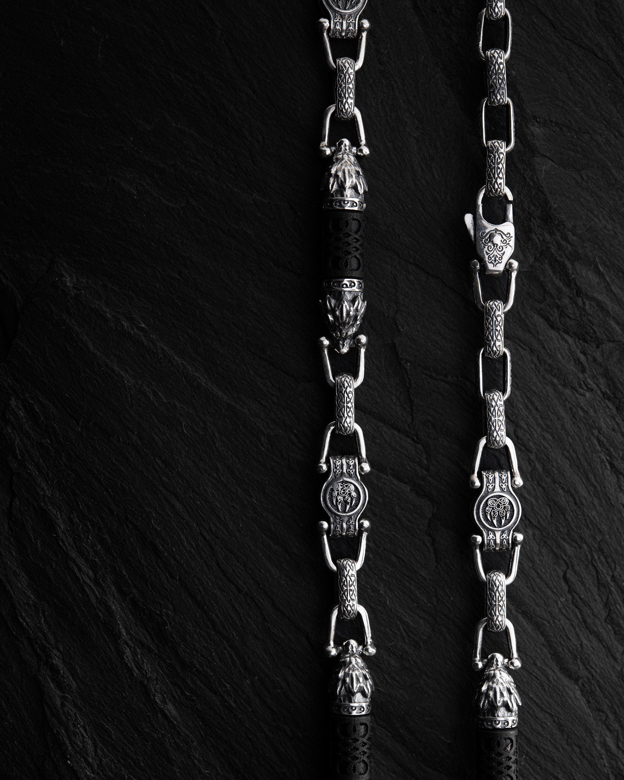 The silver chain WOLVES with ebony wood embodies strength, loyalty, and a deep connection to natural instinct. The image of the wolf symbolizes leadership, freedom, and the readiness to protect the pack — those closest to you. Ebony wood, known for its durability and rich color, highlights inner resilience, endurance, and self-confidence.