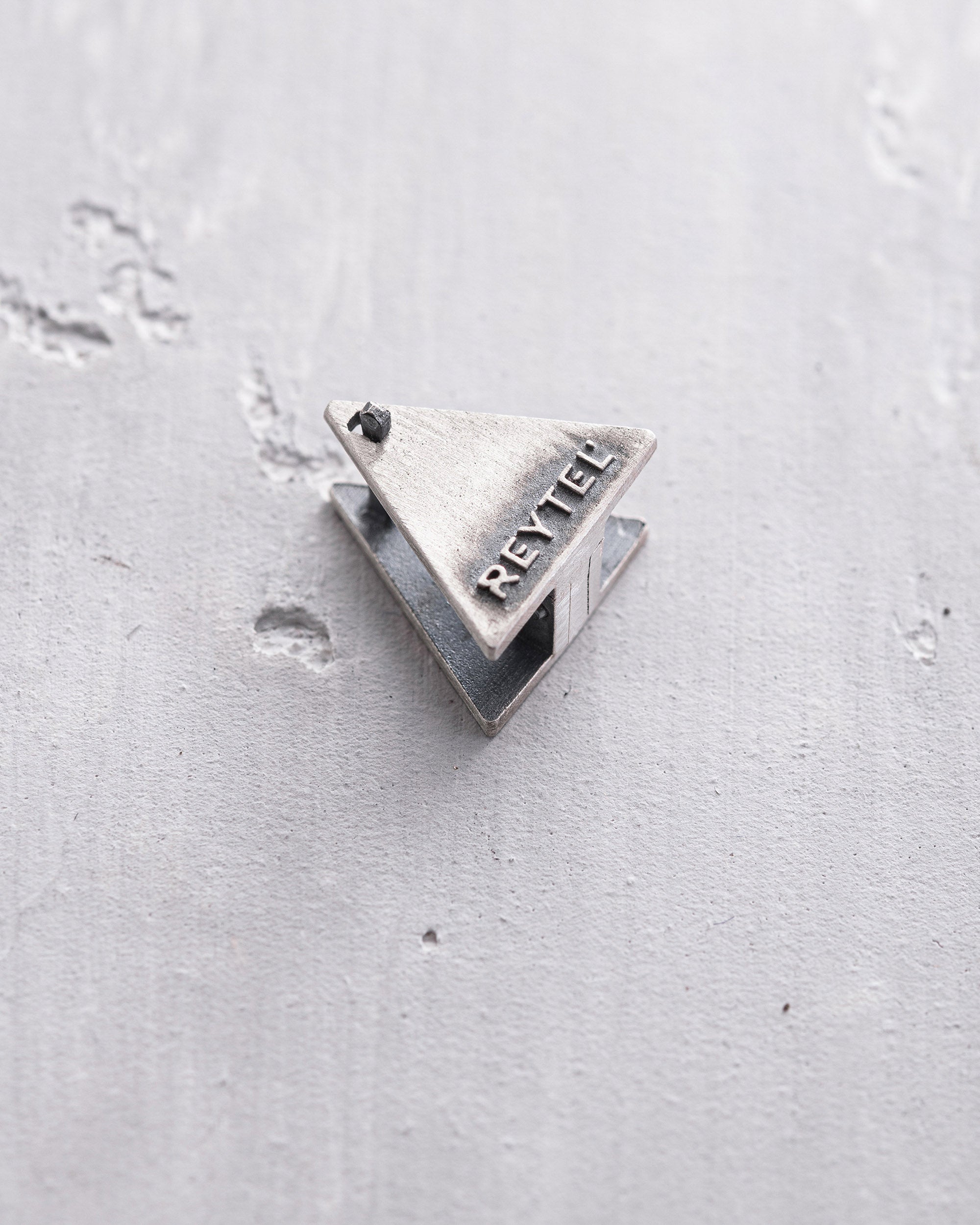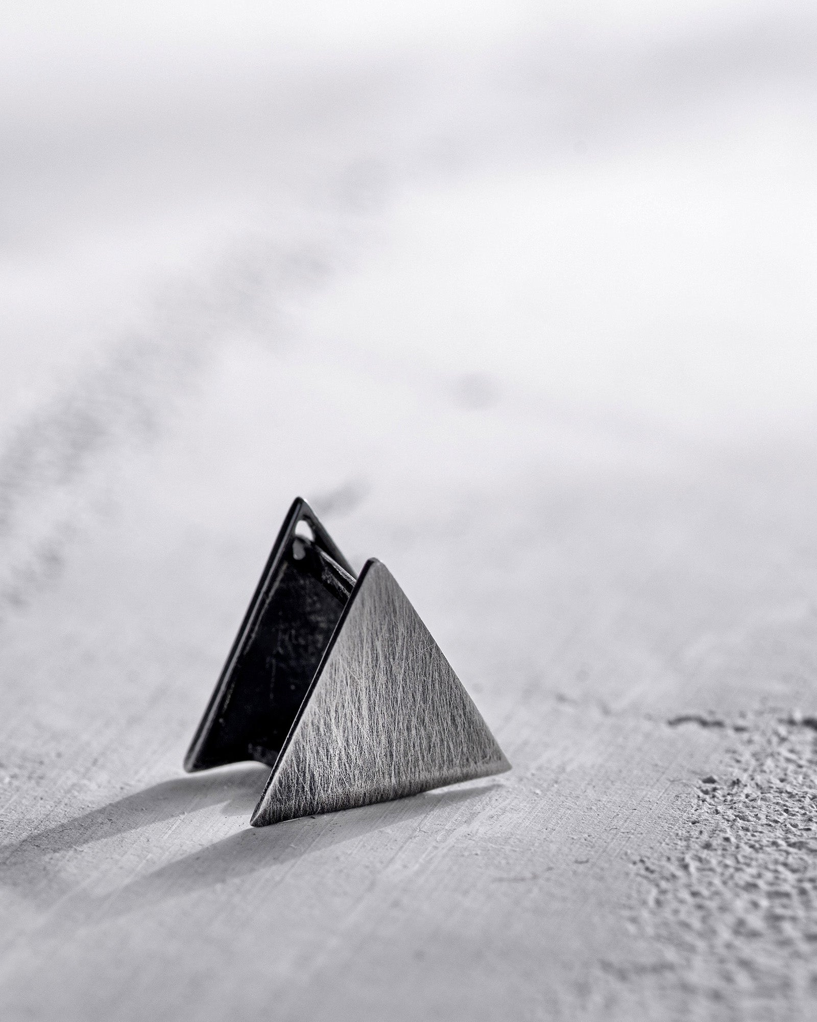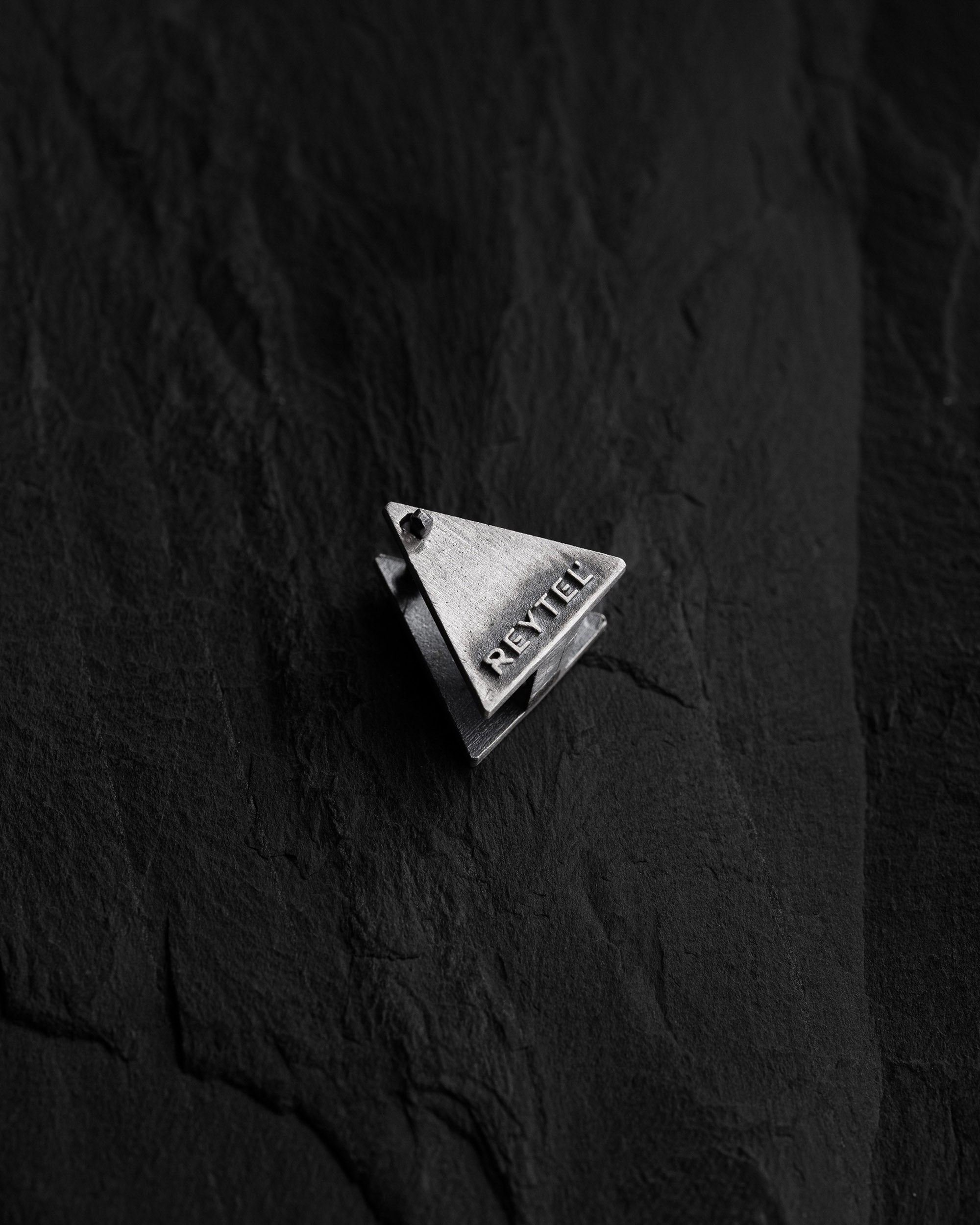 This unique silver earring with a matte black finish catches the eye with its simple geometric triangle shape. "THE ROCK" symbolizes strength, stability, and resilience, reminding us of the solidity of stone in the face of life's challenges. This earring embodies the force of character and confidence, making it perfectly suited for the modern man. Its minimalist design and clean lines make this ornament the ideal choice for those who prefer understatement but still wish to express their individuality.