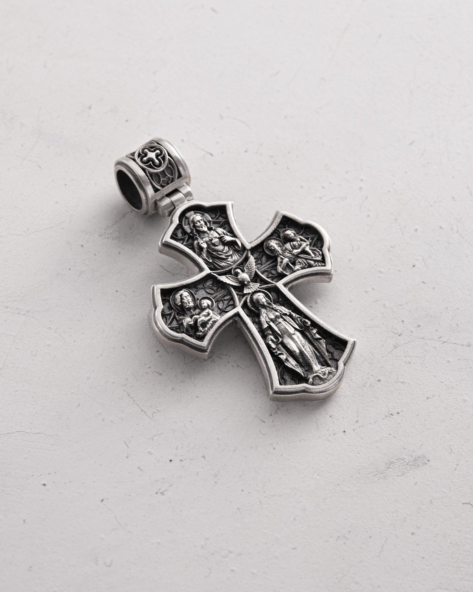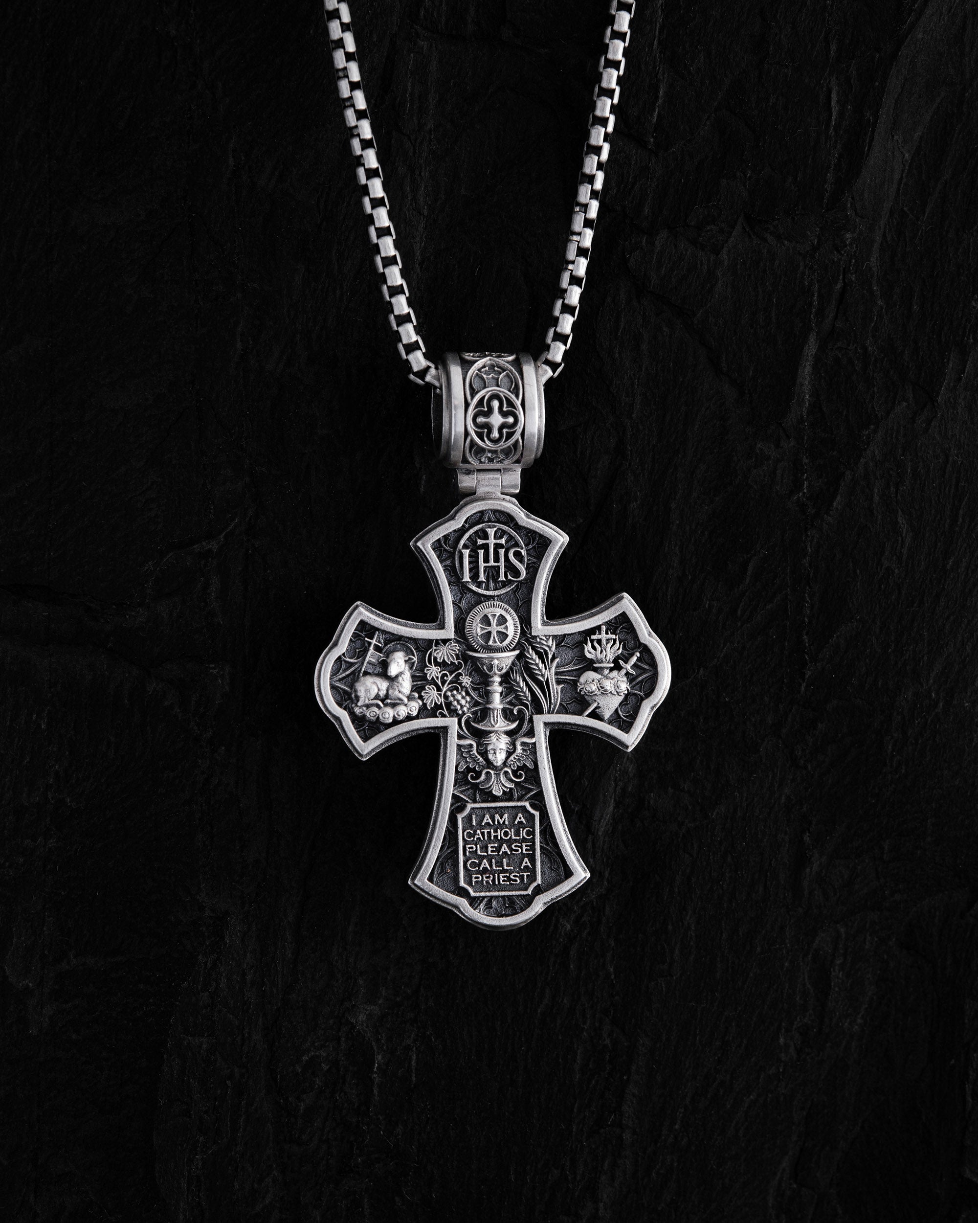 Silver cross “FOUR WAY CROSS MEDALS” — a unique cross combining four holy medals that symbolize protection, faith, mercy, and salvation. On the front side are depicted Jesus Christ with the Blessed Virgin Mary, Archangel Michael, and Saint Joseph with the Infant Jesus — four sacred figures reminding us of God’s presence and care. On the reverse side is engraved the phrase “I am a Catholic, please call a priest” — a traditional Catholic expression meaning faith, readiness for spiritual purification, and a plea for blessing in a moment of need. FOUR WAY CROSS MEDALS is a cross of faith, prayer, and divine protection — a reminder of the power of spiritual light in one’s life.