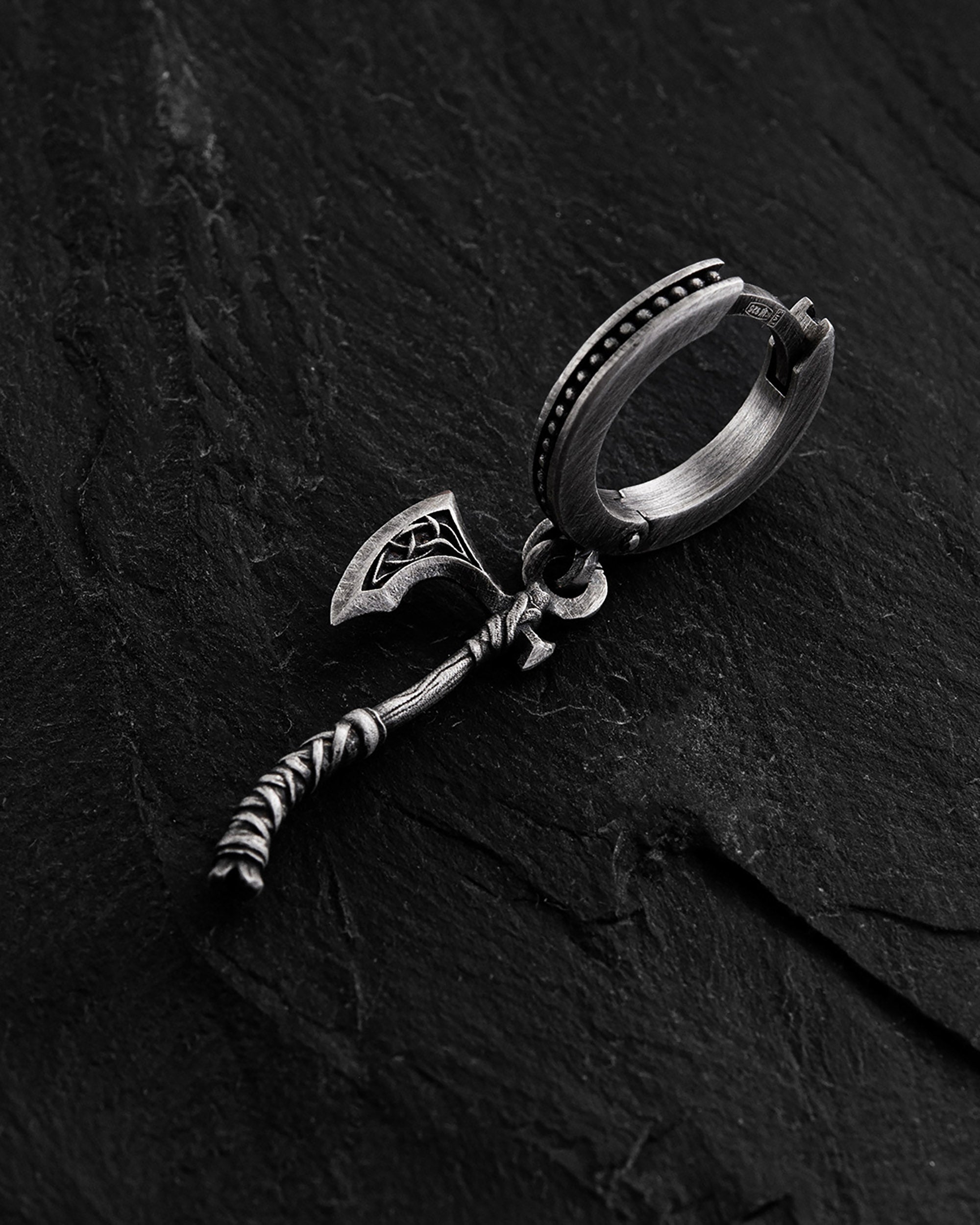 The silver hoop earring "PERUN'S AXE" is a powerful symbol of strength, courage, and protection, inspired by Perun, the god of thunder and war in Slavic mythology. The earring design echoes the shape of Perun’s axe, embodying the determination and resilience needed to overcome life’s challenges.