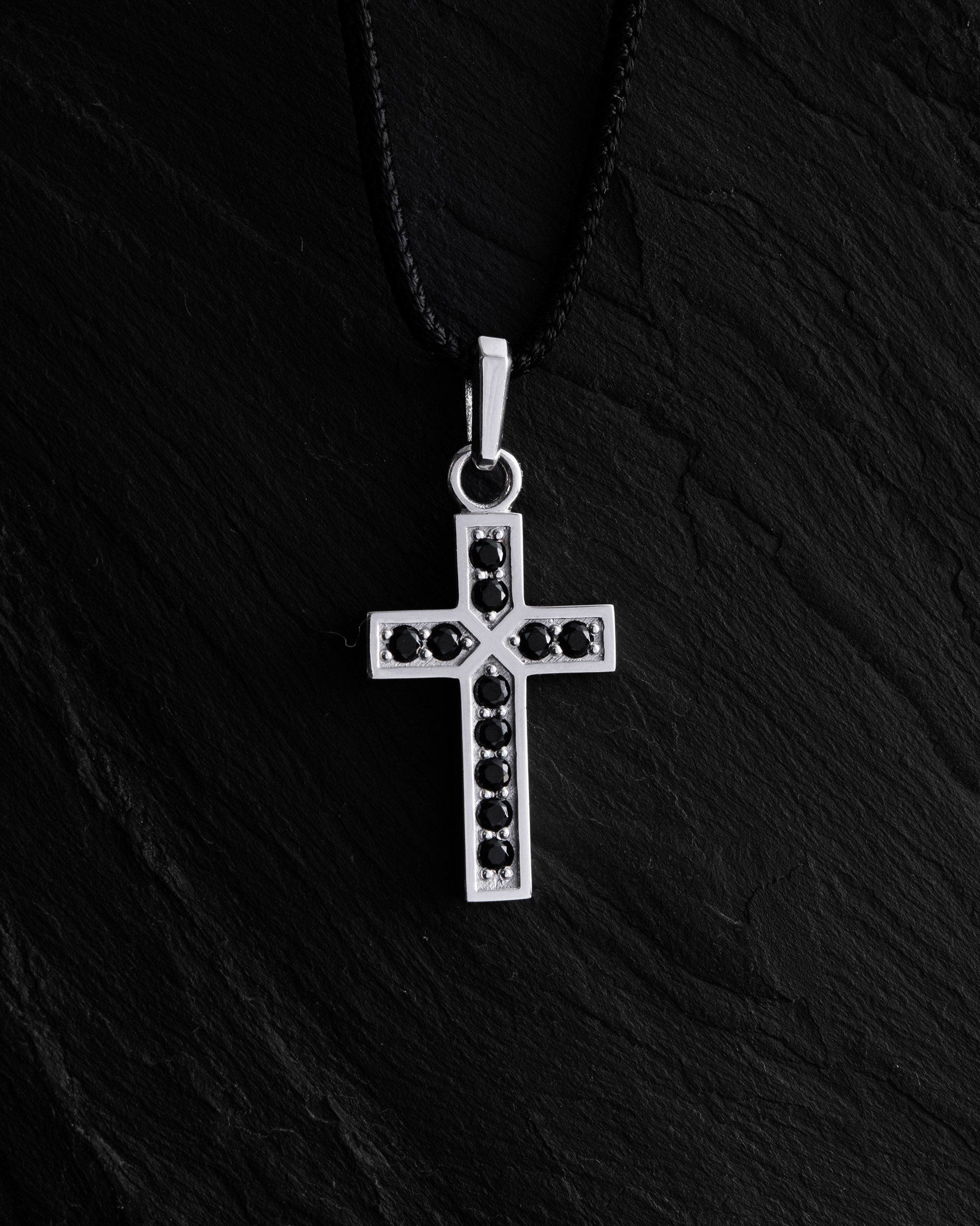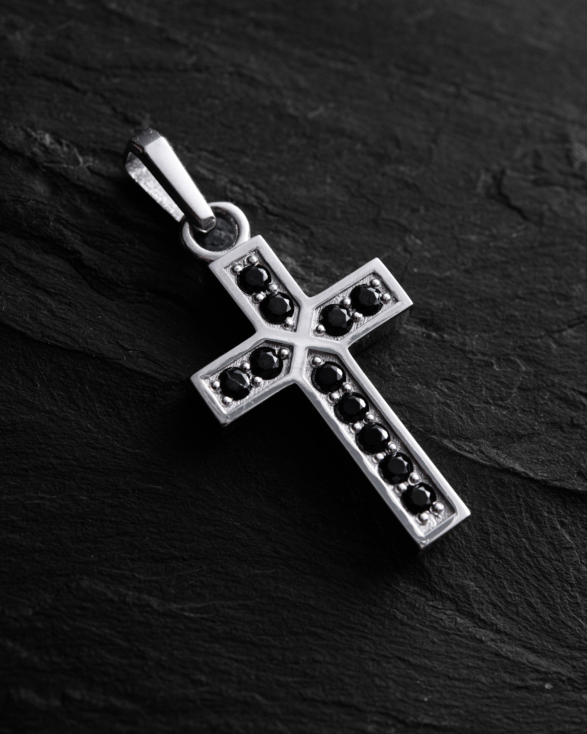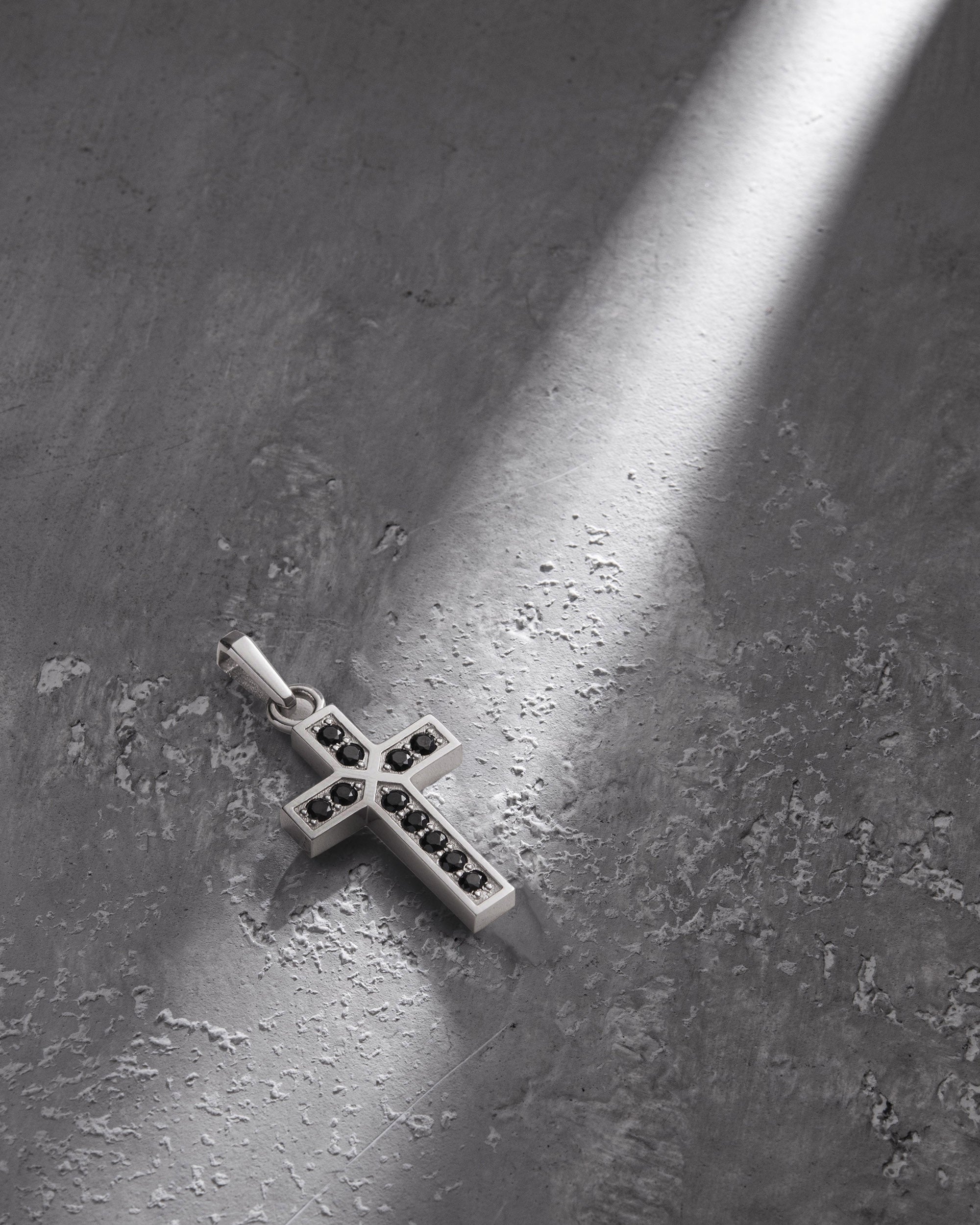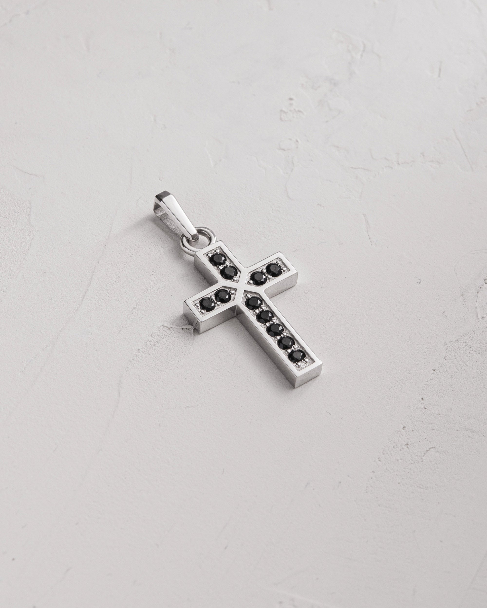 The white gold cross FAITH. BLACK STONES is a piece that combines spirituality, strength, and depth. The clean silhouette of the cross is accentuated by a line of black stones, symbolizing inner resilience, protection, and the silence from which faith is born. White gold represents light, truth, and the path, while black stones stand for calm and stability that needs no show.