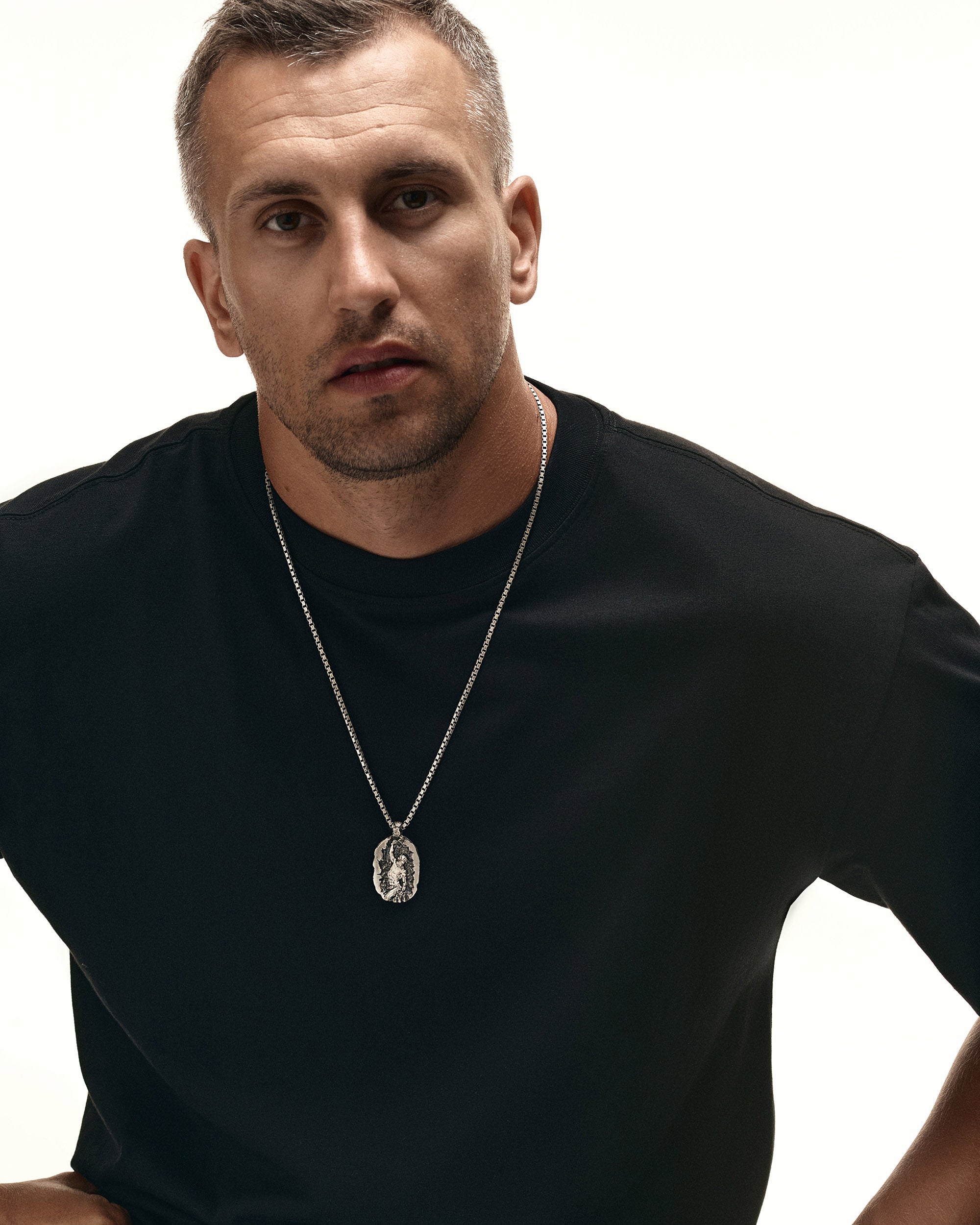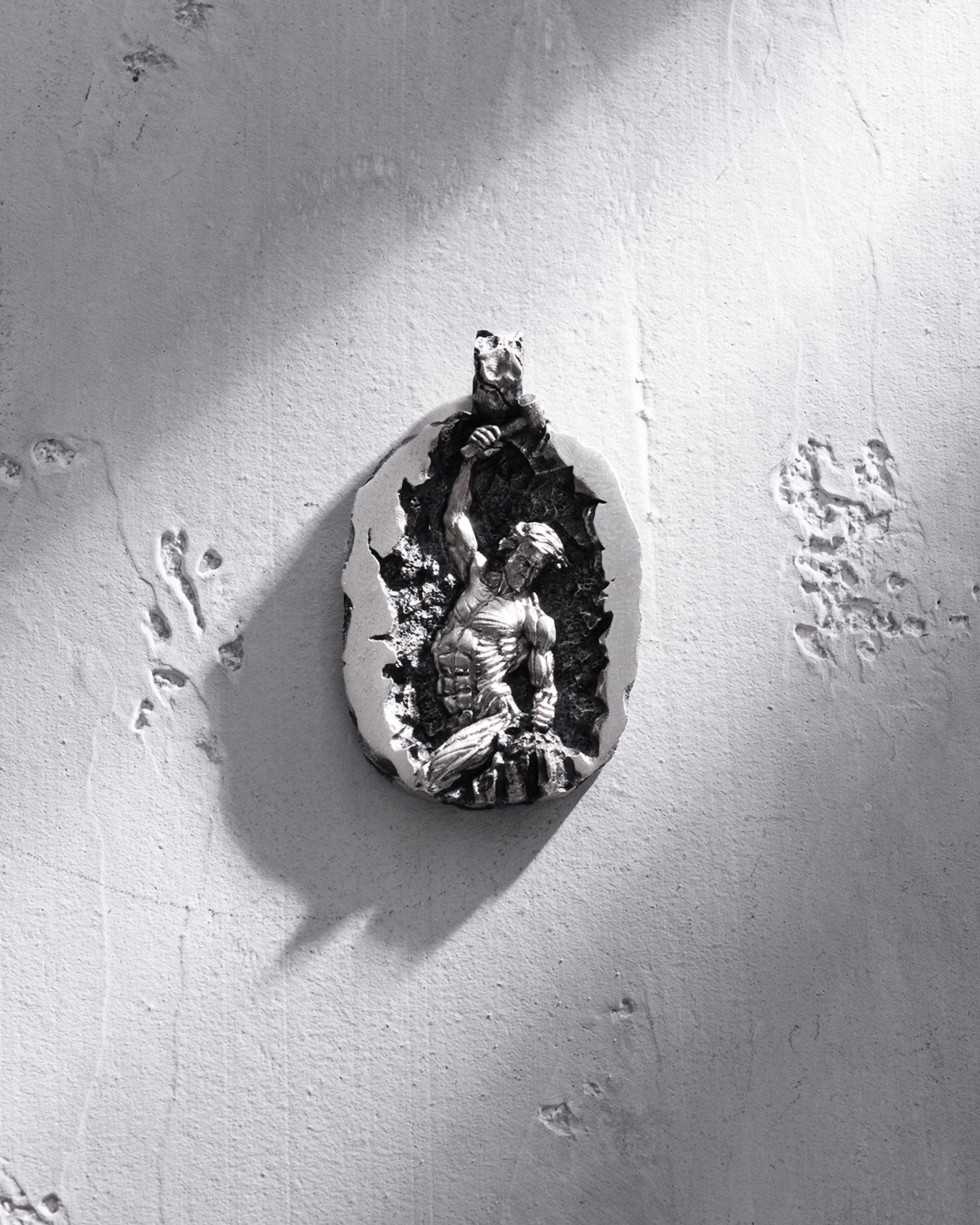 The silver pendant "SELFMADE" is a symbol of independence, perseverance, and willpower. On the front of the pendant, a man is depicted sculpting himself from stone, symbolizing the process of self-creation and self-improvement. This image conveys the idea that everyone is the creator of their own destiny and is responsible for their life's path.