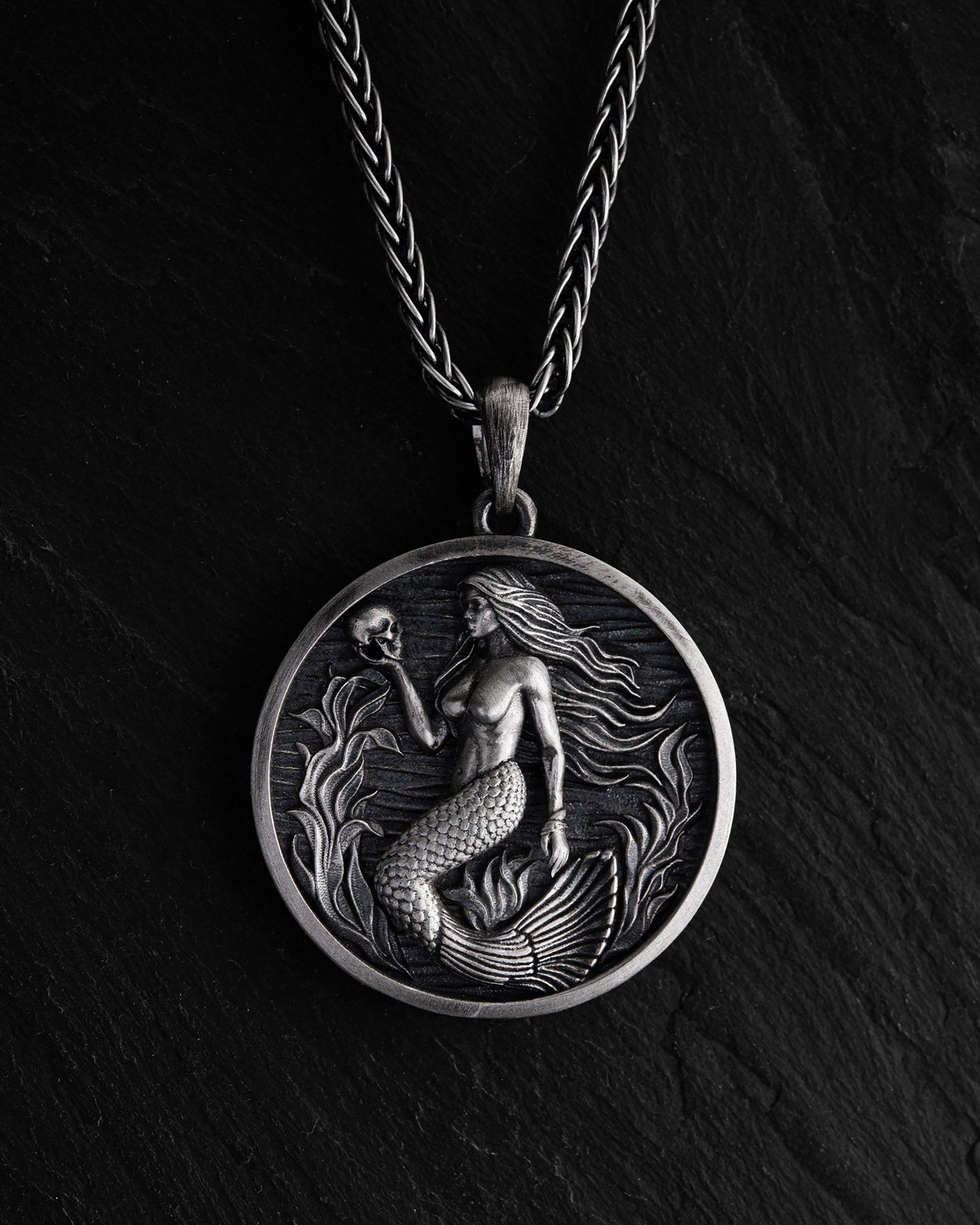 The pendant depicts a mermaid holding a skull, representing two opposing forces—life and death, temptation and the inevitability of fate. It is a reminder of the deep nature of human desires, the choice between illusion and reality.