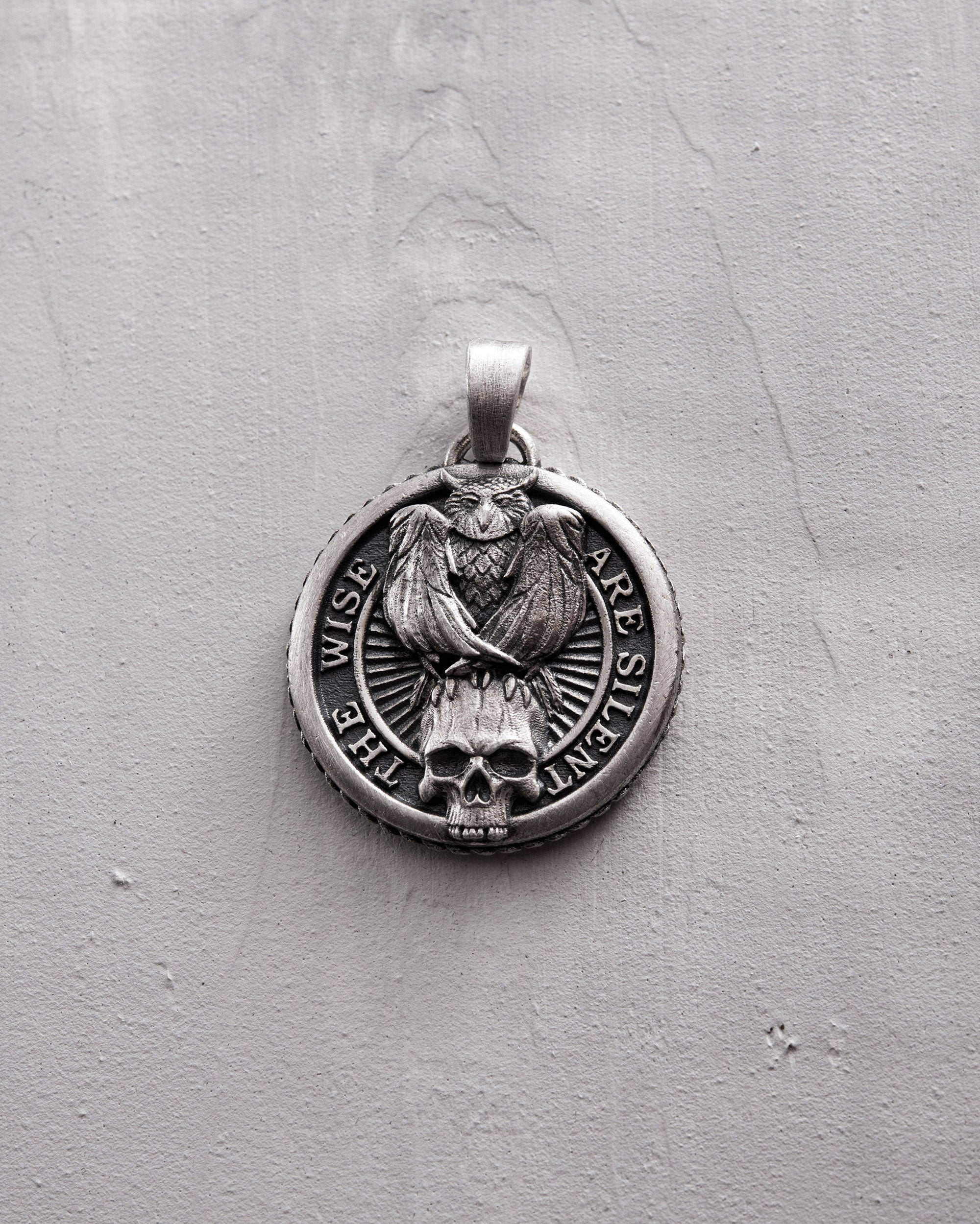 The silver pendant "THE WISE ARE SILENT" depicts an owl perched on a skull, combining two powerful symbols: wisdom and mortality. The owl, known in many cultures as a symbol of wisdom and knowledge, embodies understanding, observation, and the ability to find truth through silence and calmness. It also represents inner strength and the ability to grasp the deeper aspects of life.