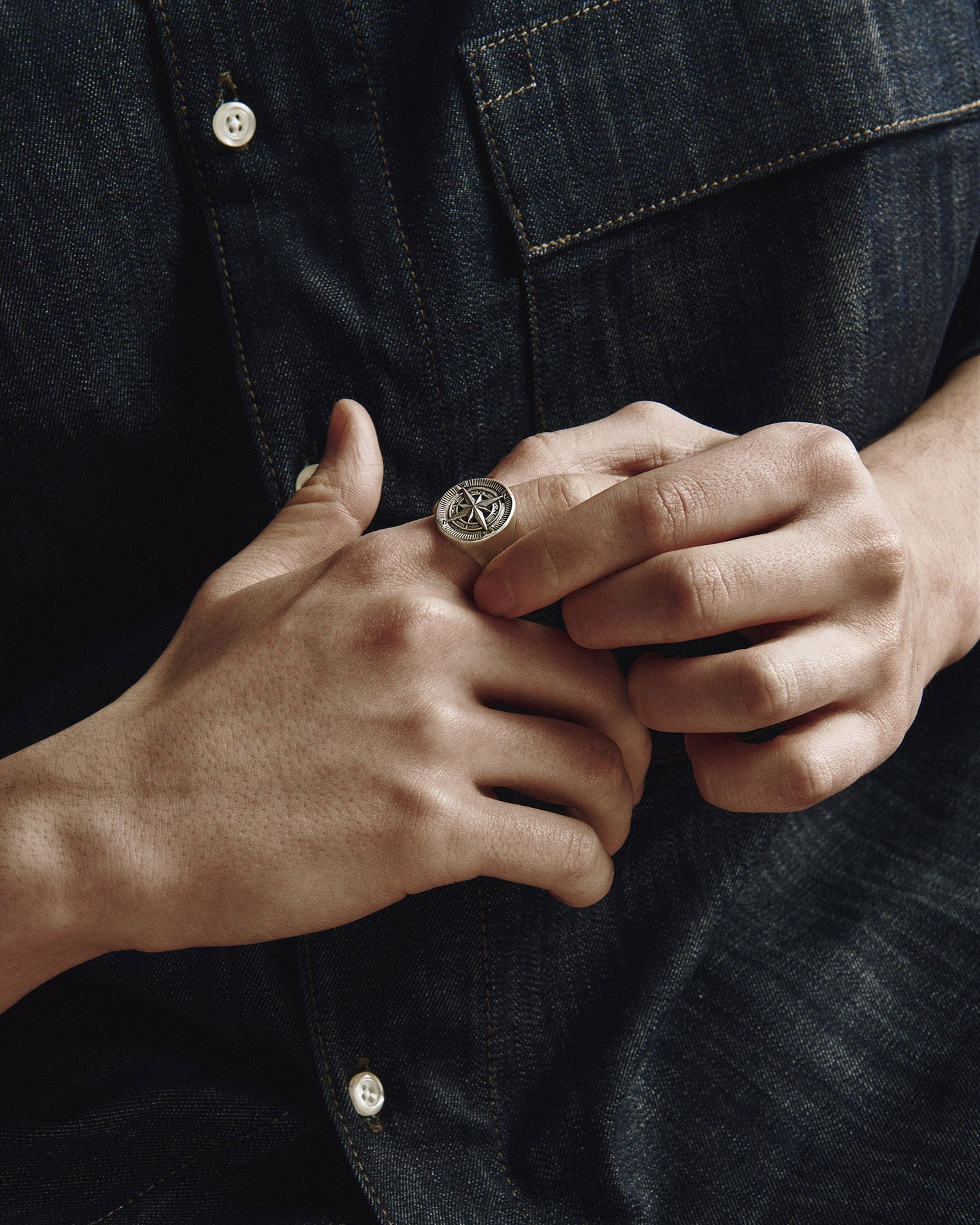 The silver ring "COMPASS. POLAR STAR" symbolizes direction, orientation, and reliability. The ring features images of a compass and the Polar Star — navigation tools that have long been used to determine the path. The compass embodies the constant search for the right path and life course, while the Polar Star, which always points north, symbolizes reliability and steadfastness. Wearing this ring reminds one of the importance of staying true to one's goals and principles, regardless of circumstances.