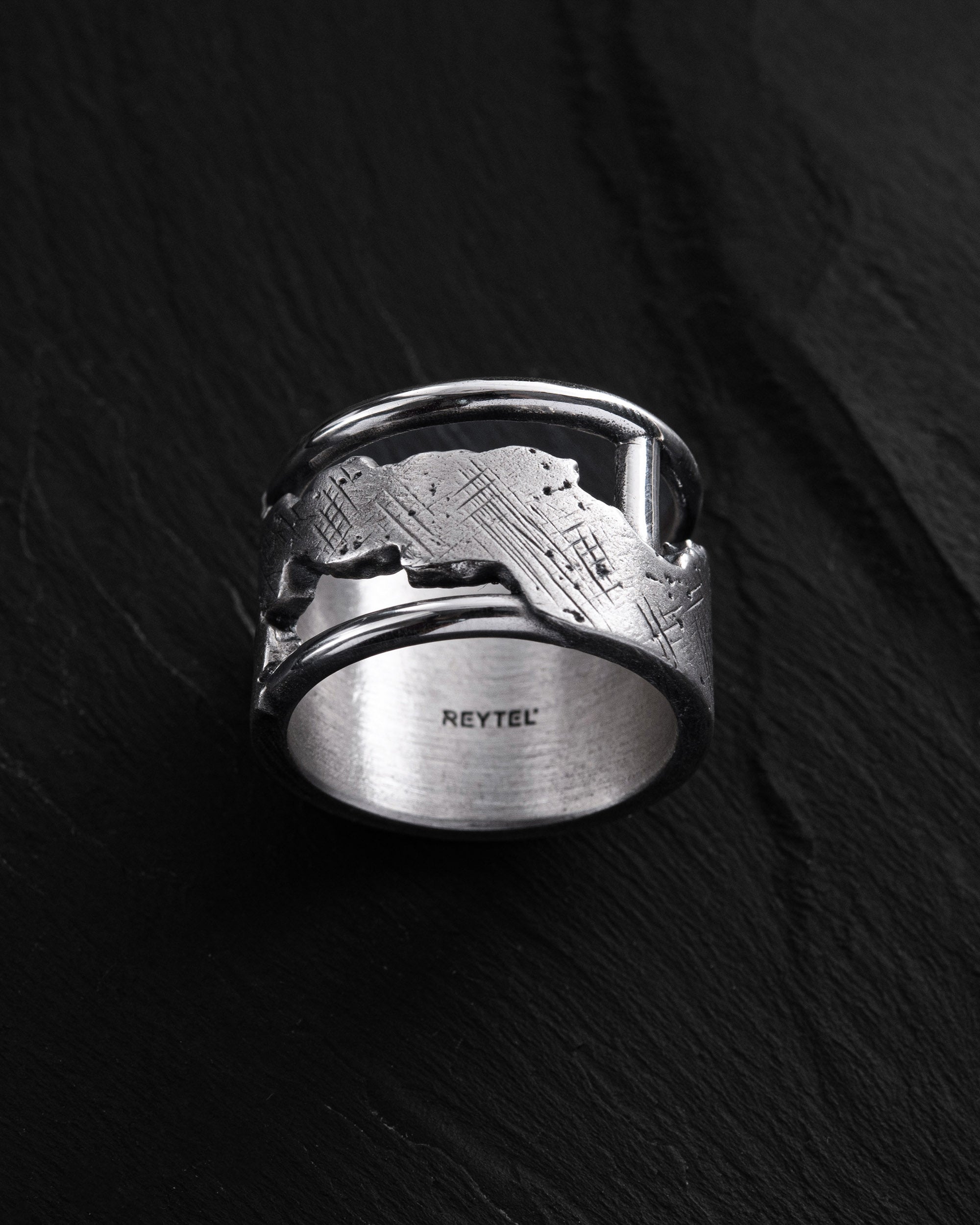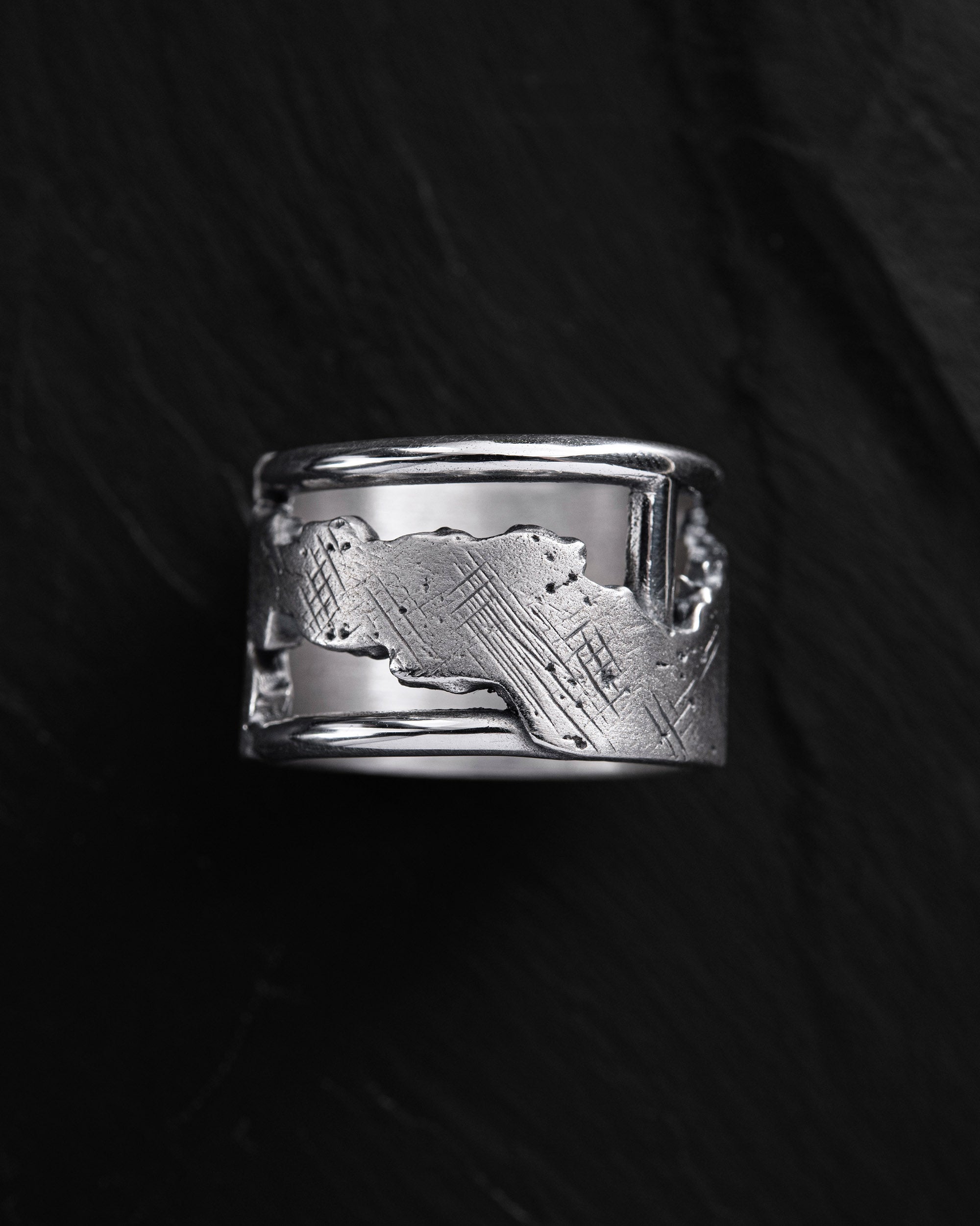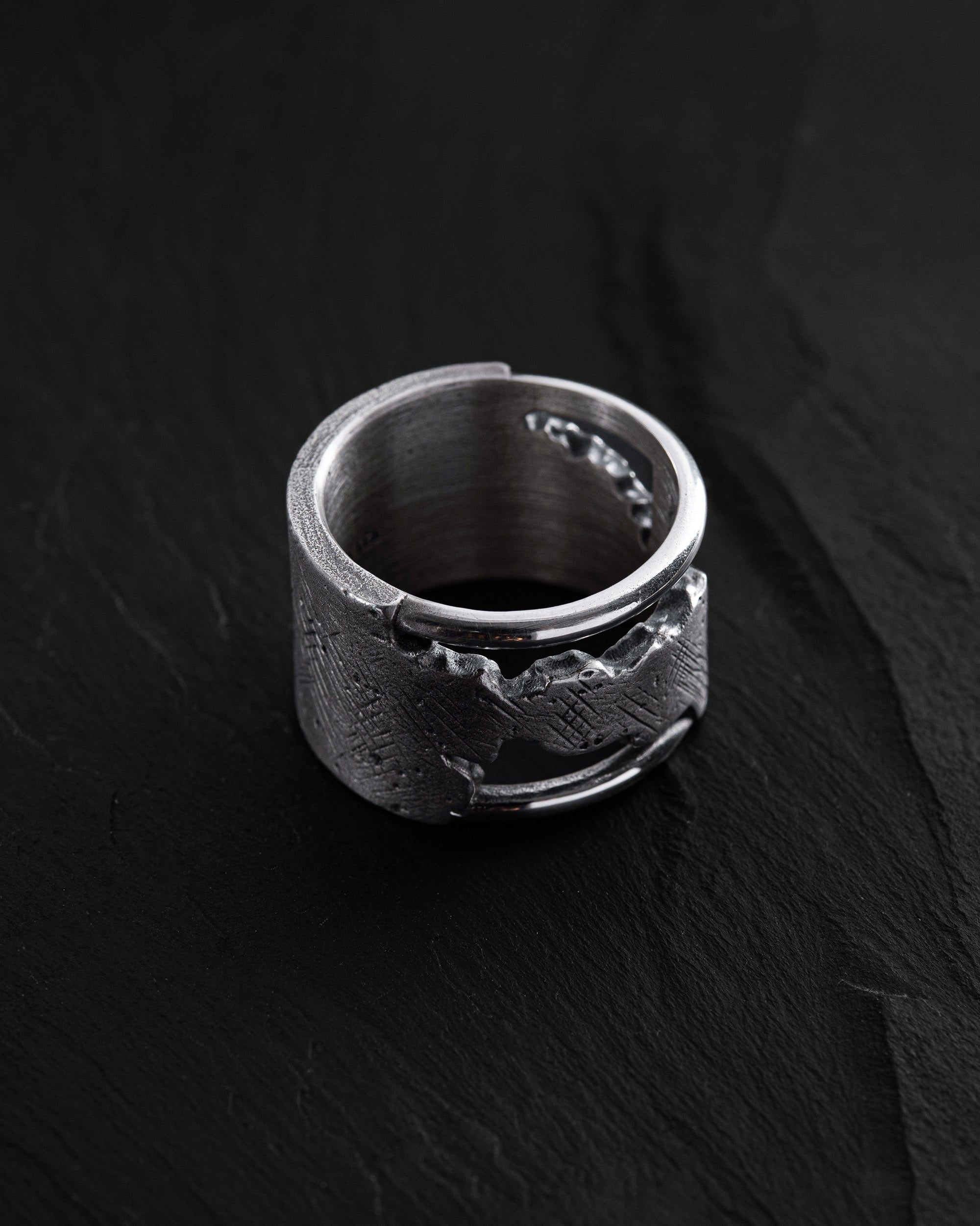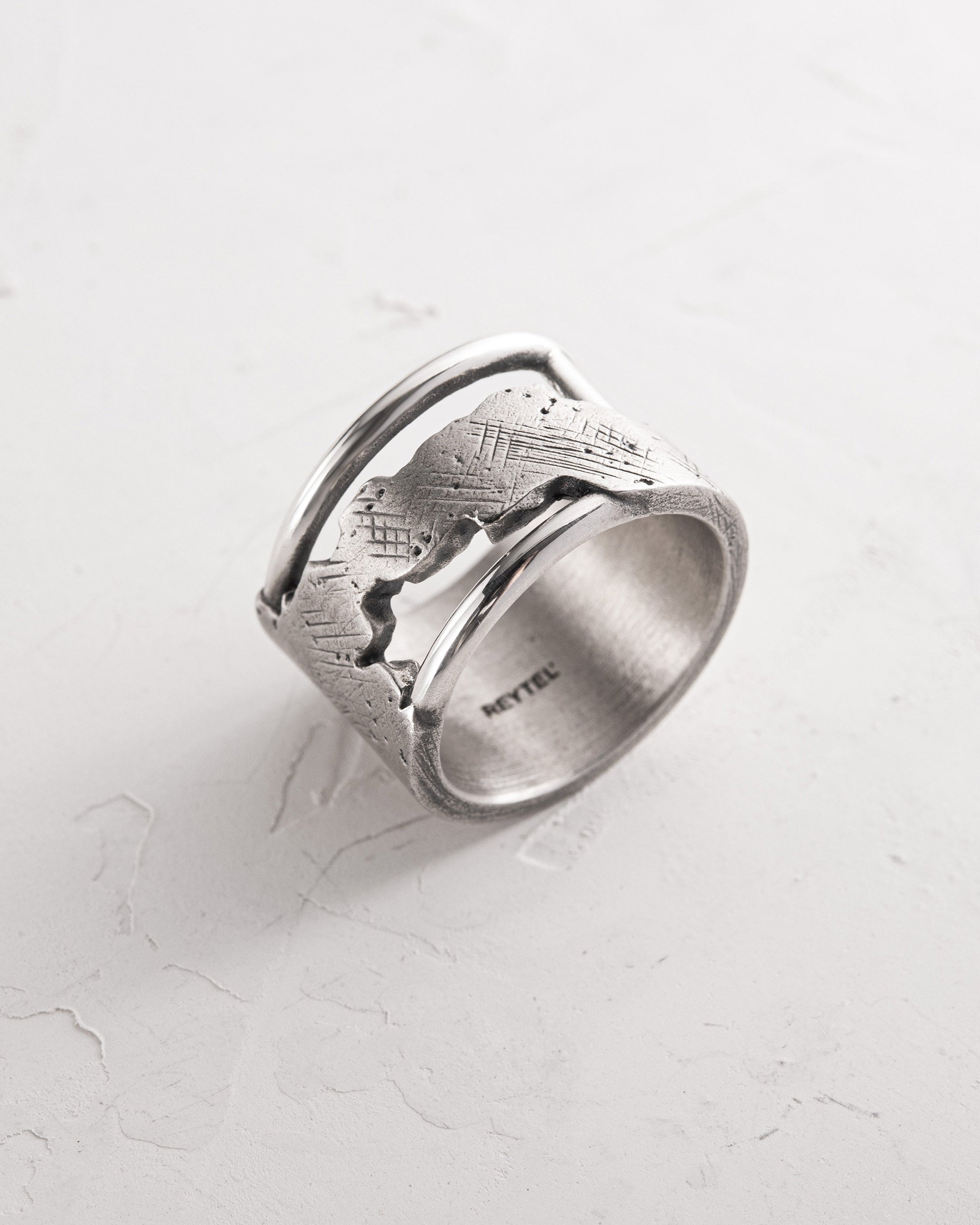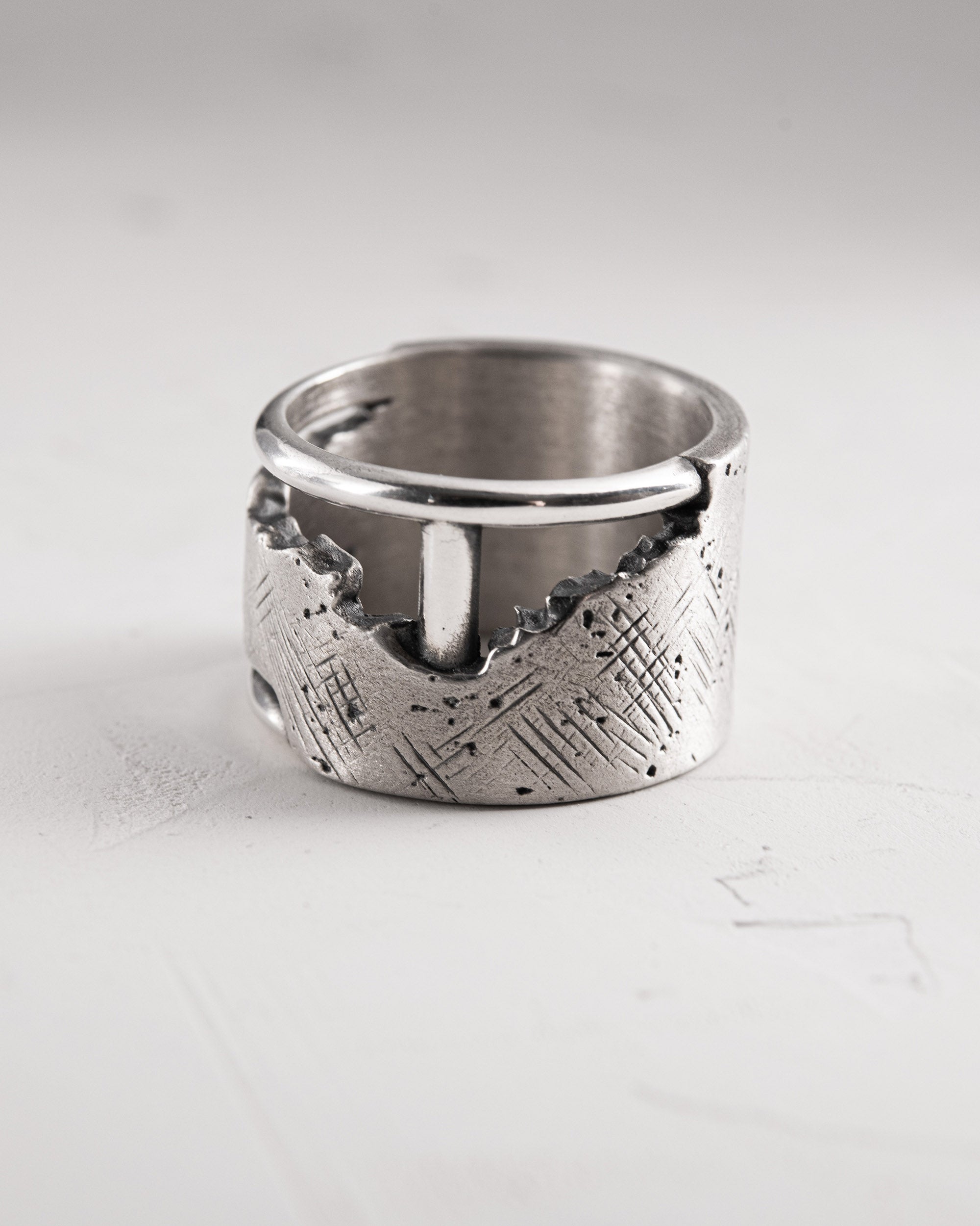 The silver ring LEISTUNG (German for “achievement”, “result”, “efficiency”) is a manifesto of strength forged through trials. Its textured surface resembles the scars of effort, while the central vertical bar serves as the support that holds the structure together.