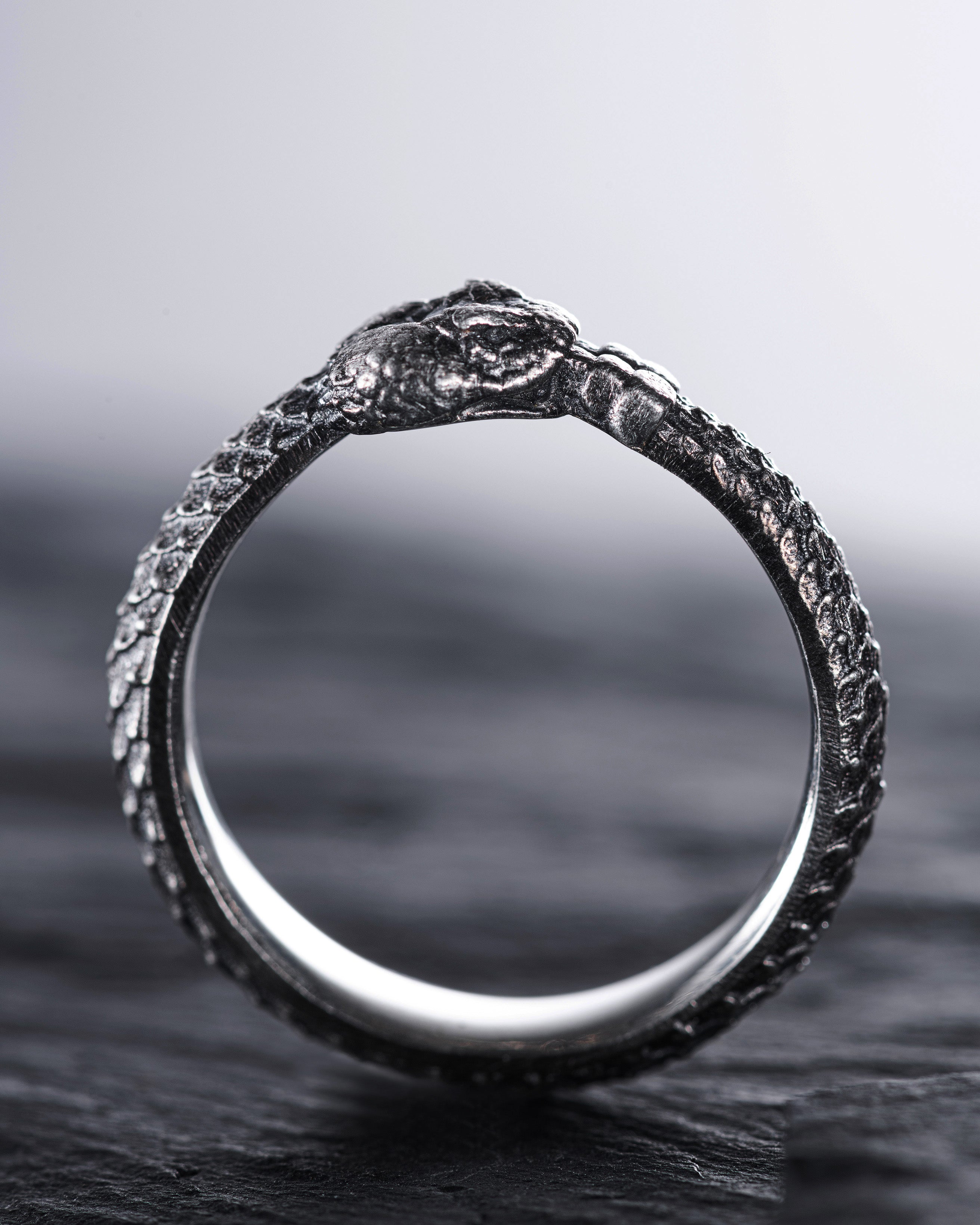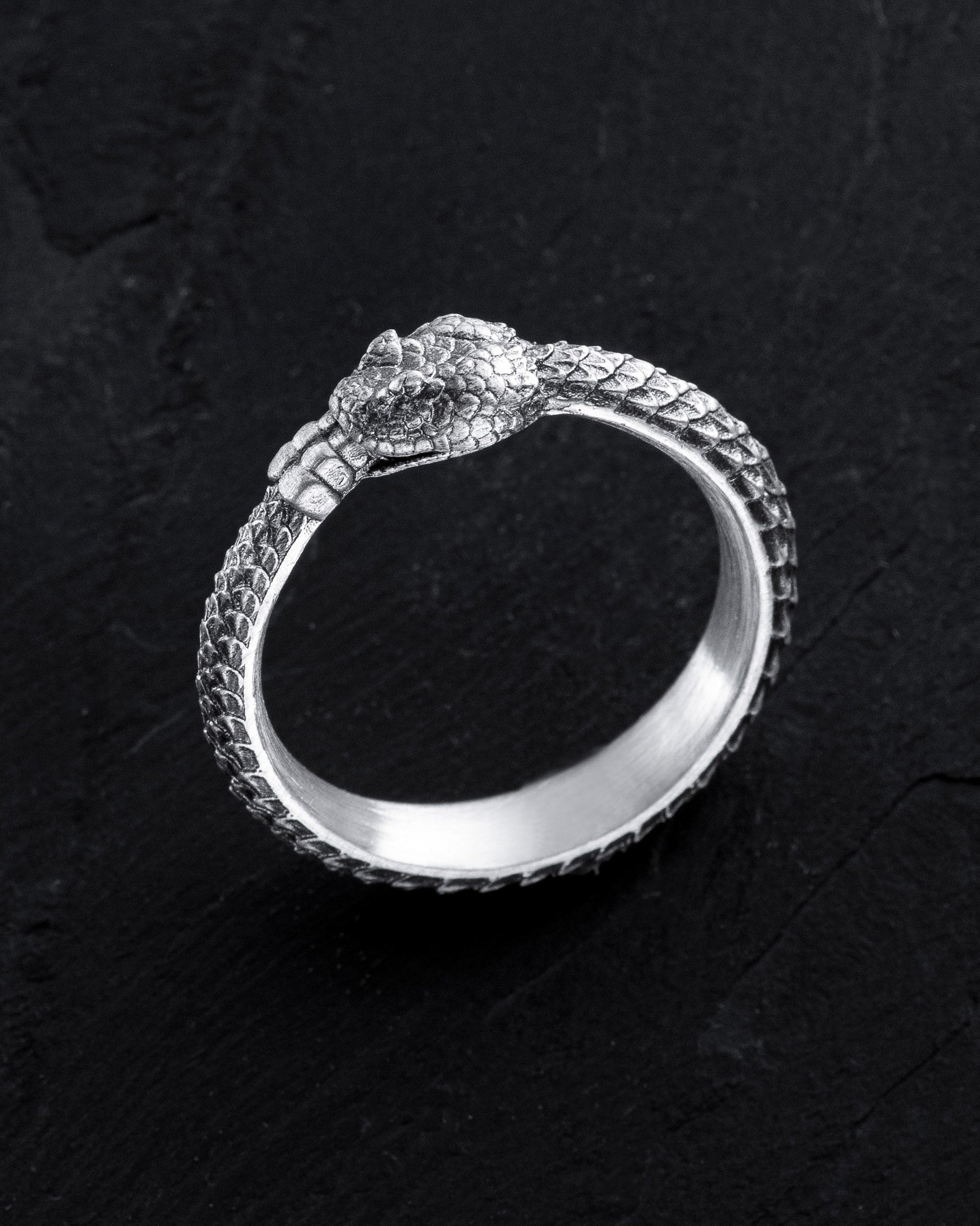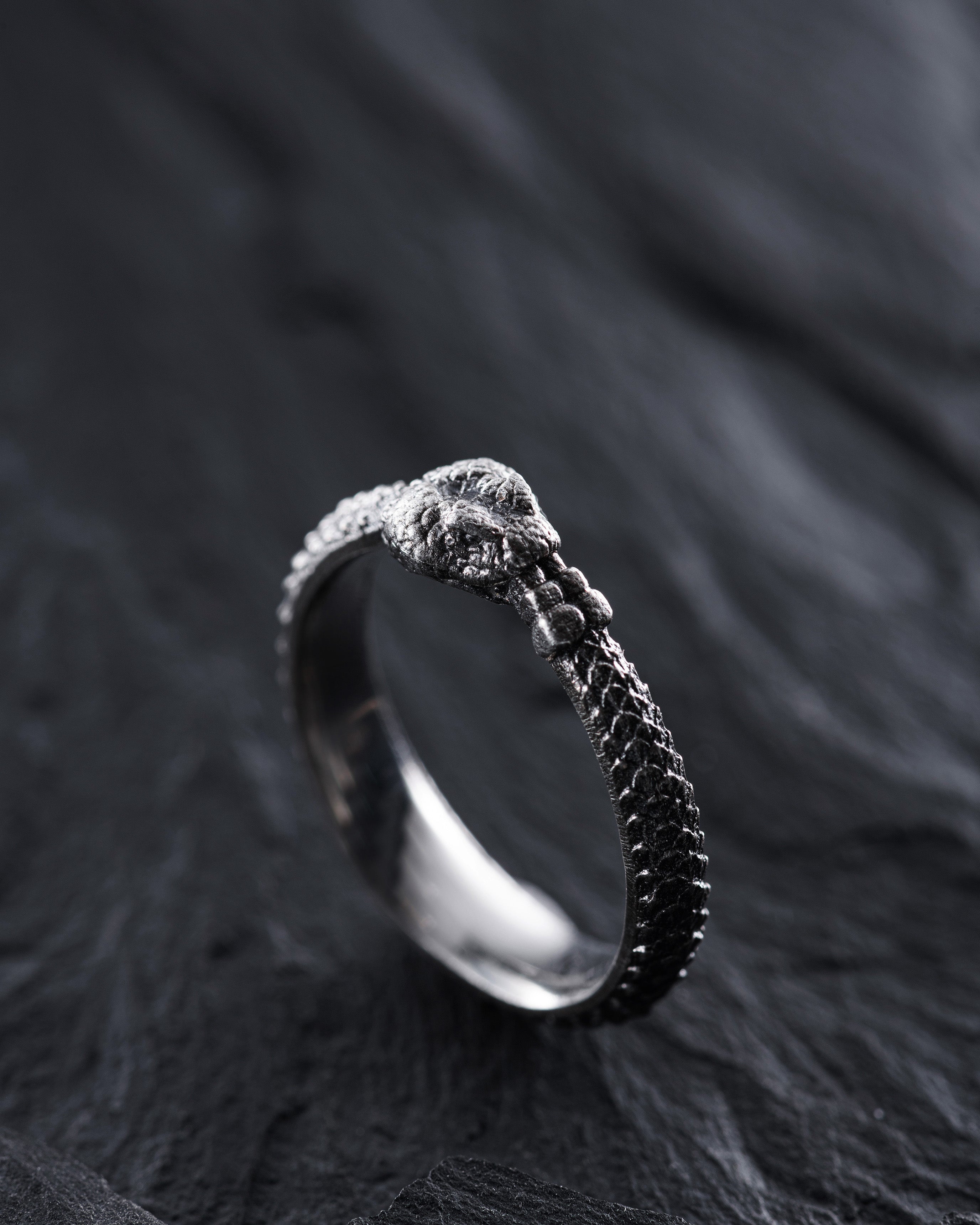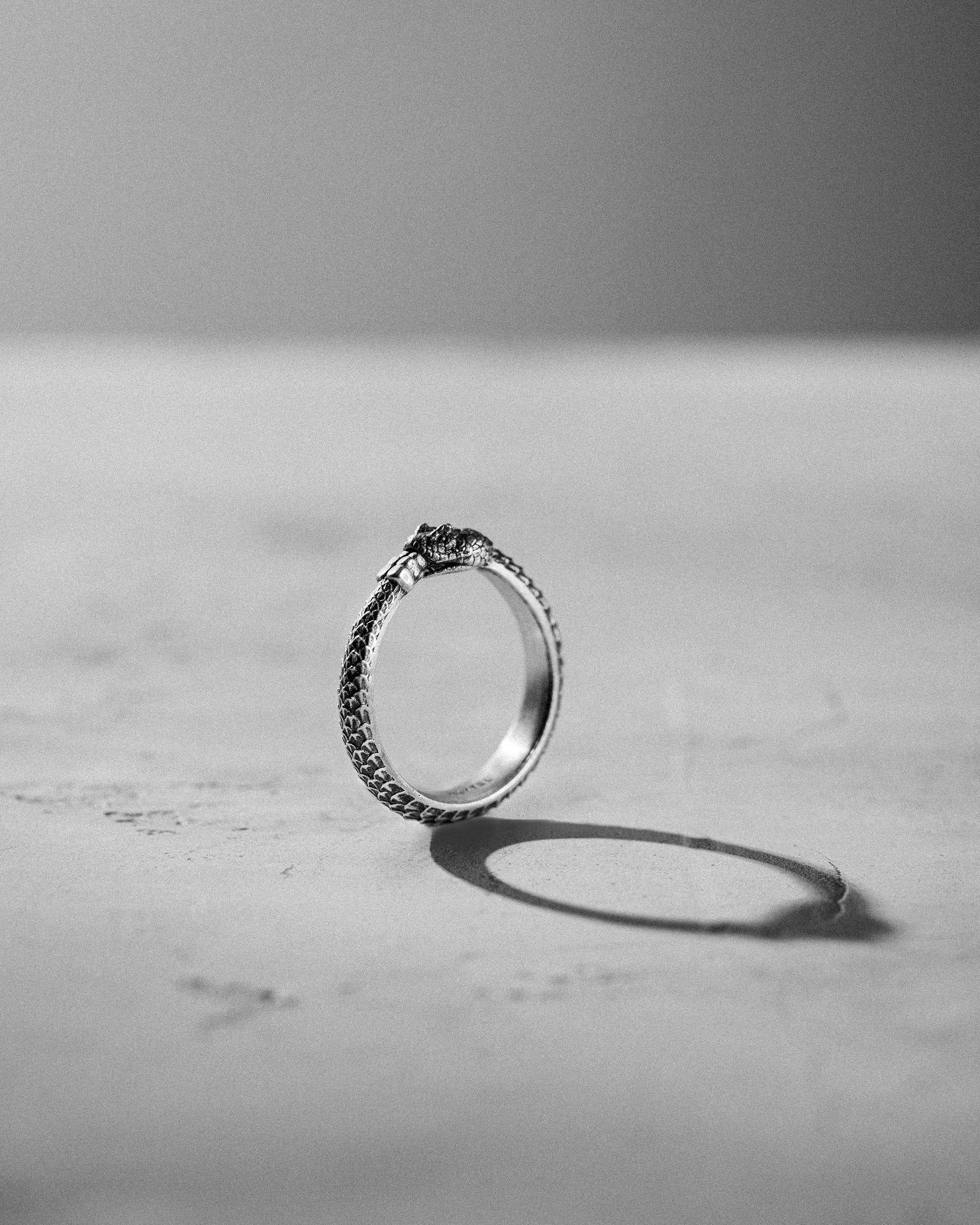 Silver Ring "OUROBOROS" is a symbol of infinity, cyclicality, and constant renewal. The design of the ring depicts a snake biting its own tail, forming a closed circle that symbolizes the eternal cycle of life, death, and rebirth. The ouroboros is an ancient symbol that reminds us of the inseparable connection between beginnings and endings, the perpetual movement and changes in life. This ring inspires its wearer to embrace change and development, helping to find harmony and balance in every life cycle. Development is essential as it ensures growth, adaptation, and the evolution of personality, allowing one to reach new heights and realize their potential.
