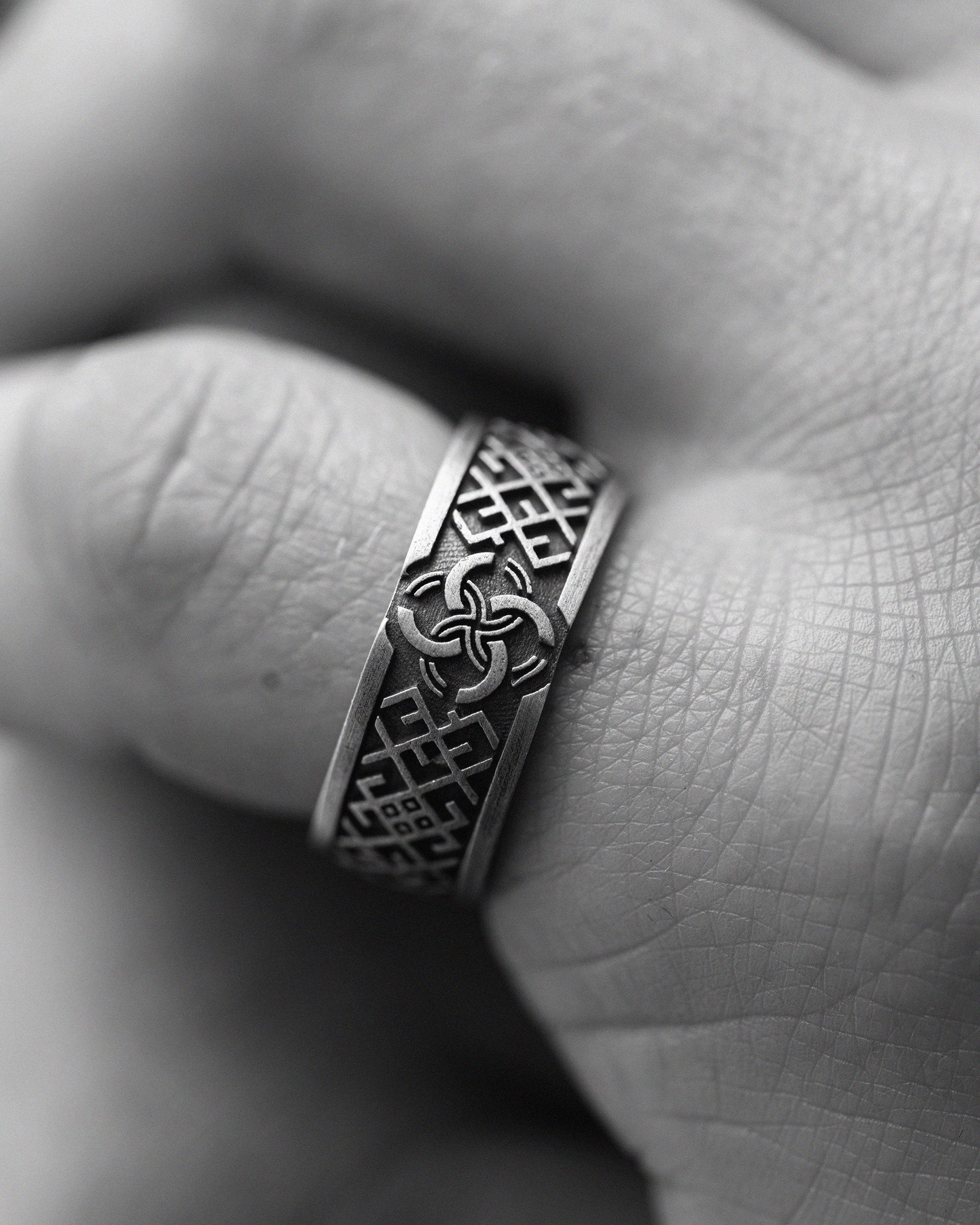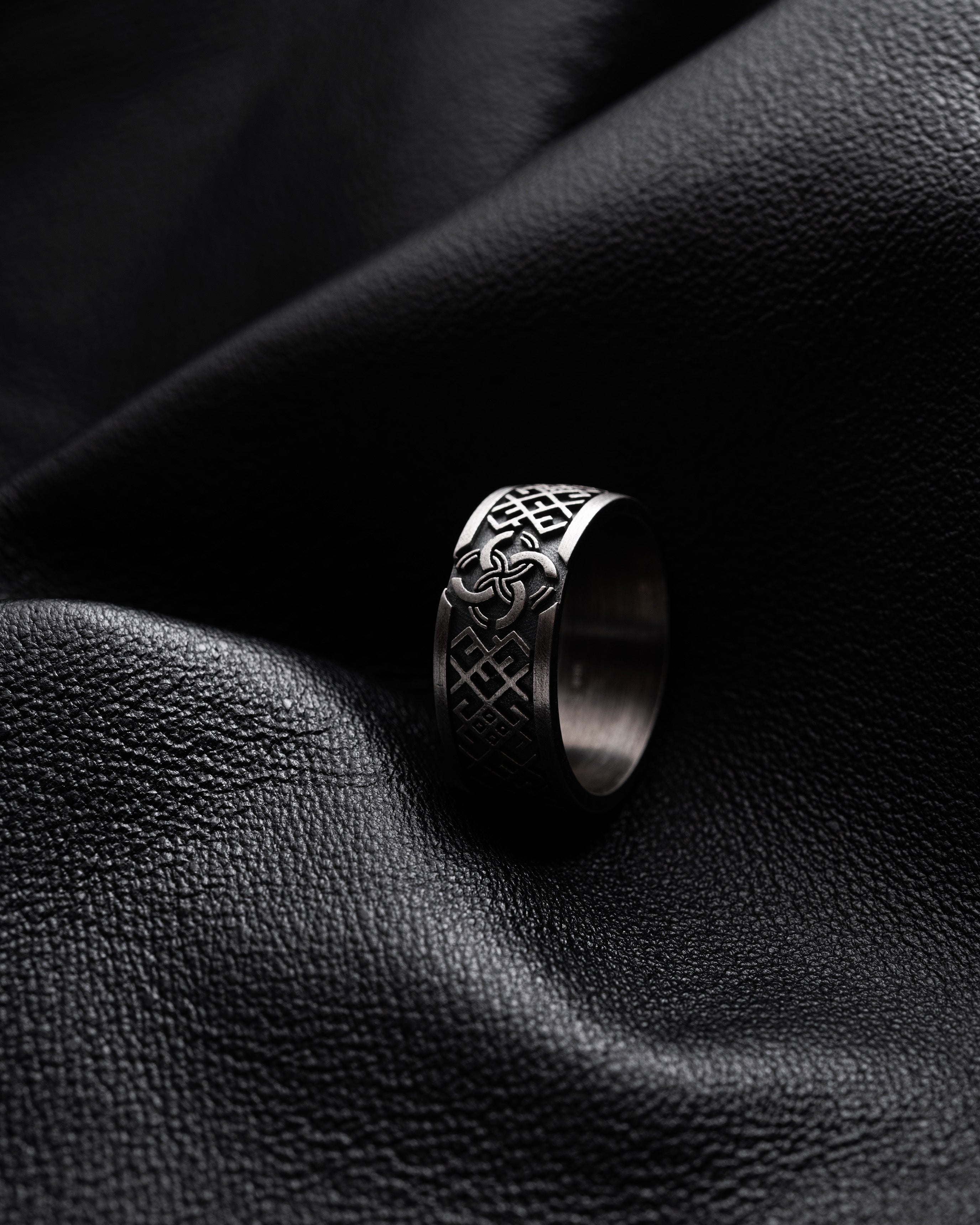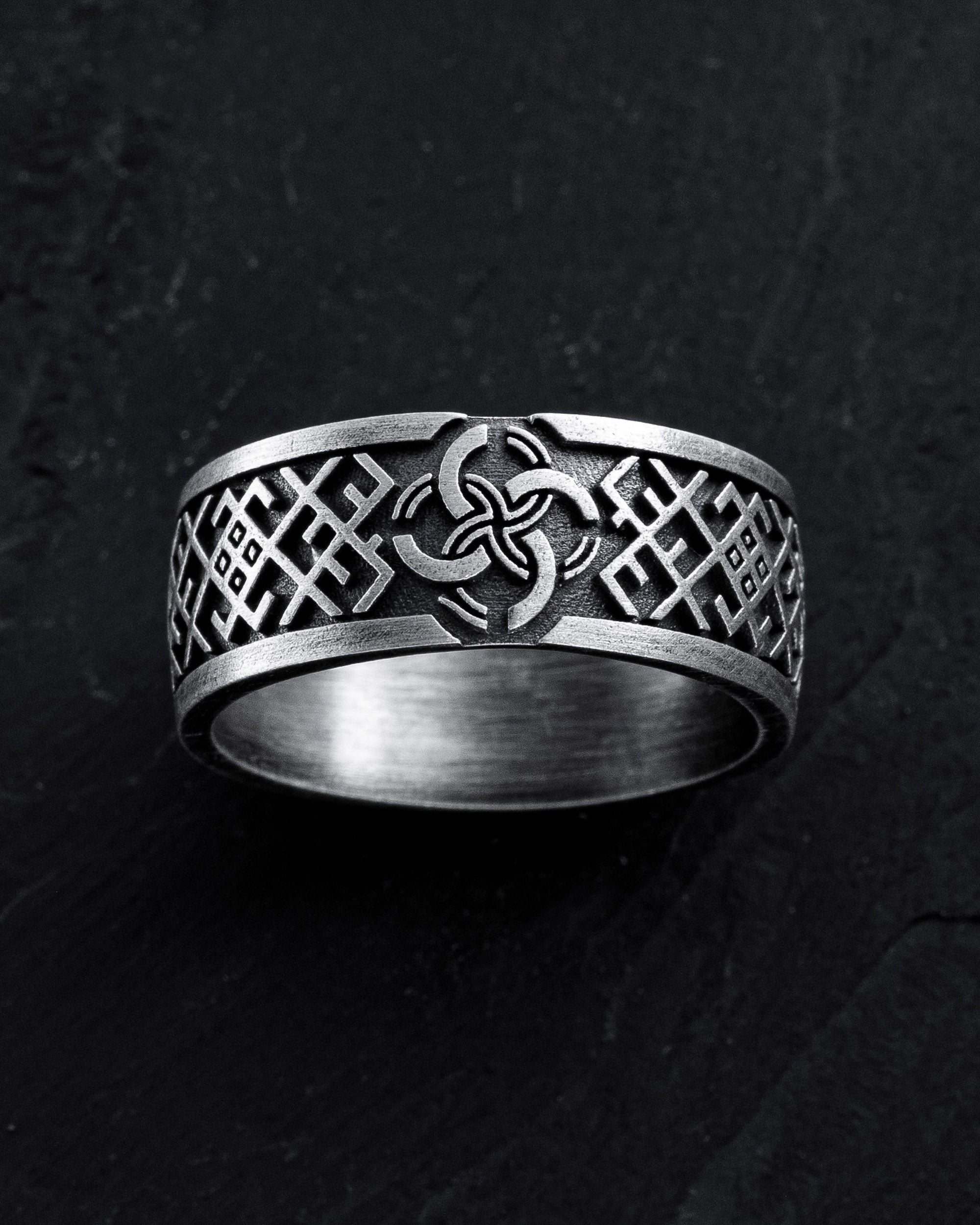 The silver ring "VESILNIK" embodies deep Slavic traditions and protective symbolism. The name "Vesilnik" comes from an ancient Slavic symbol that represents not only the union of two people in marriage but also the merging of two families, creating a new unity. The four interwoven circles depicted on the ring have profound meaning—they symbolize the Body, Soul, Spirit, and Conscience, reminding us of the harmony between the physical and spiritual in every person’s life.