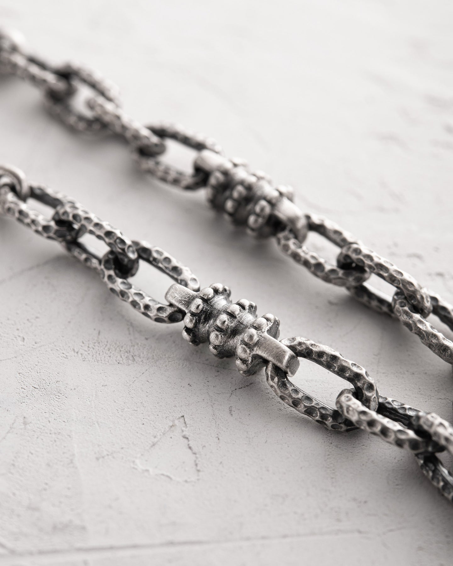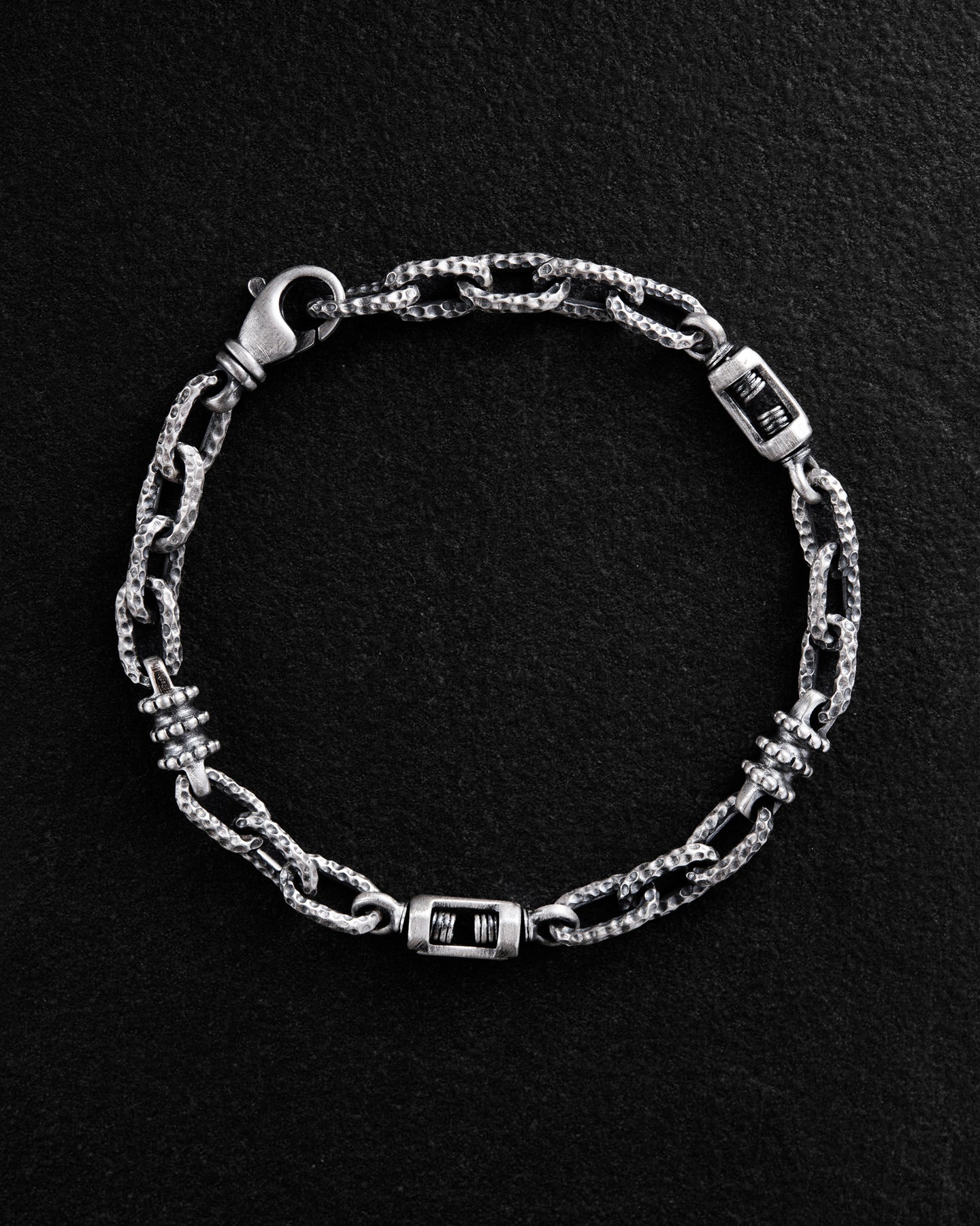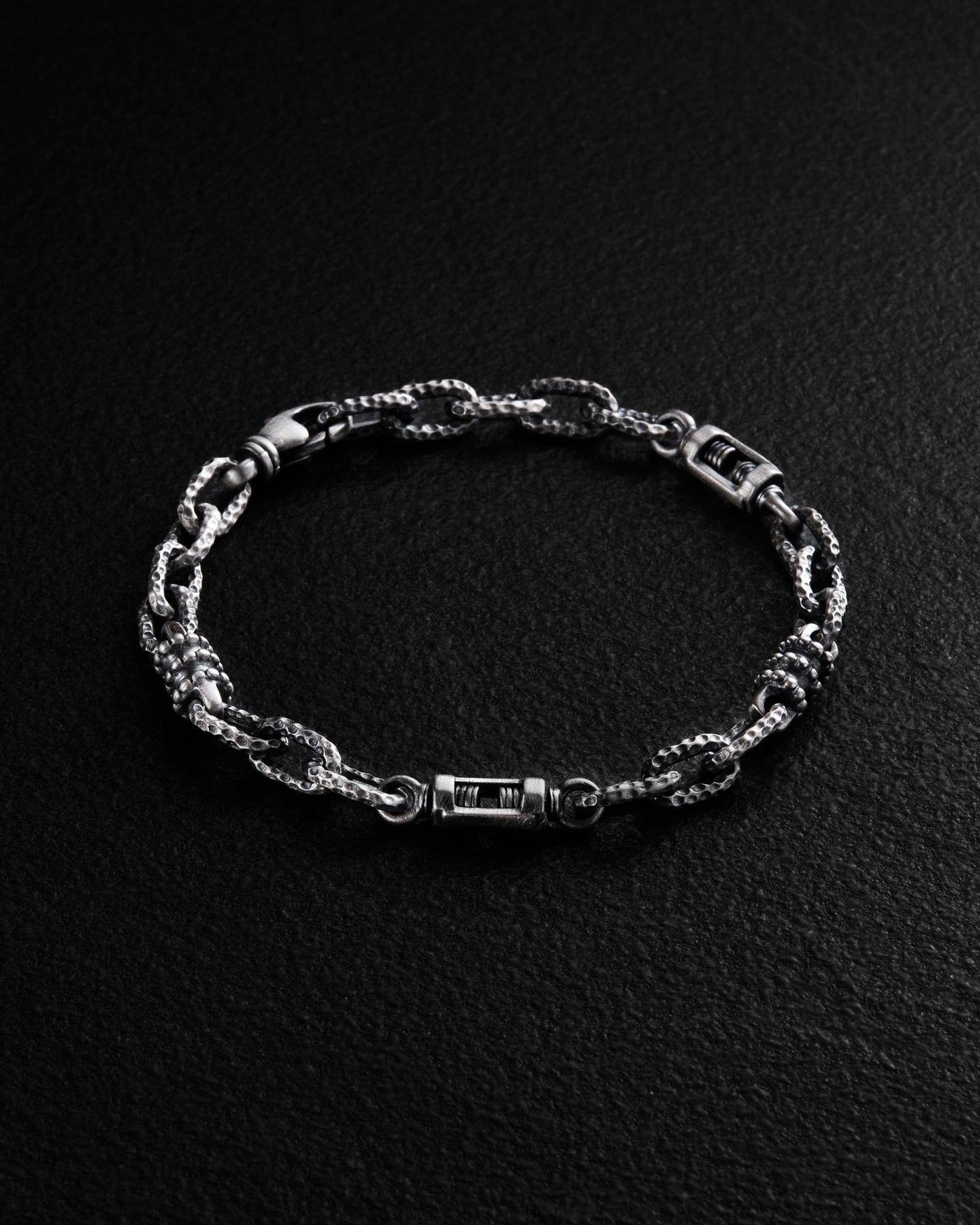 Silver bracelet “FRAGMENT” — a part that forms the whole. A bold bracelet with textured links and decorative inserts inspired by mechanical details. Each fragment symbolizes a piece of one’s personal story — the experiences that shape integrity. This design reminds us that even the broken pieces of the past can create a strong structure when carried with pride.
