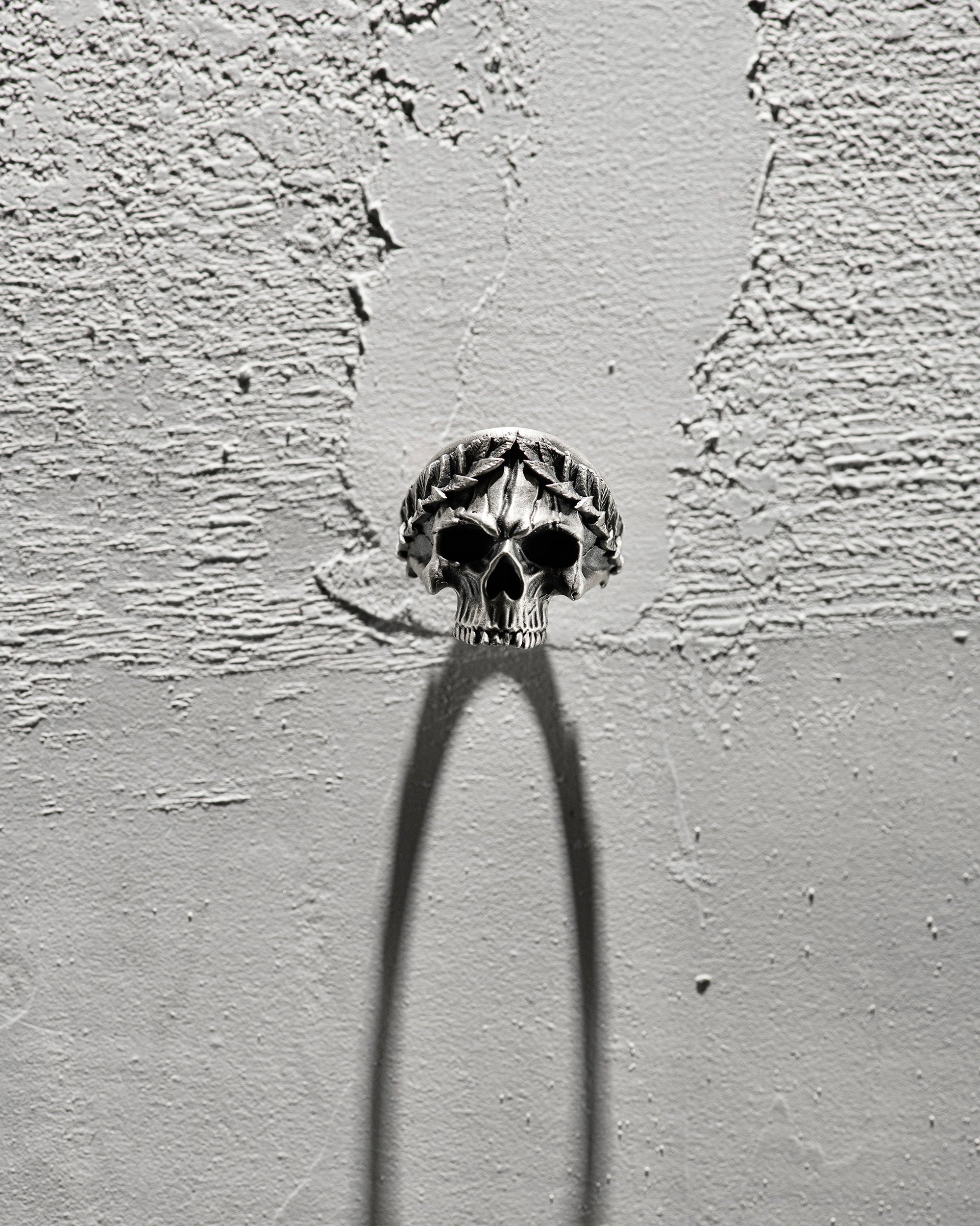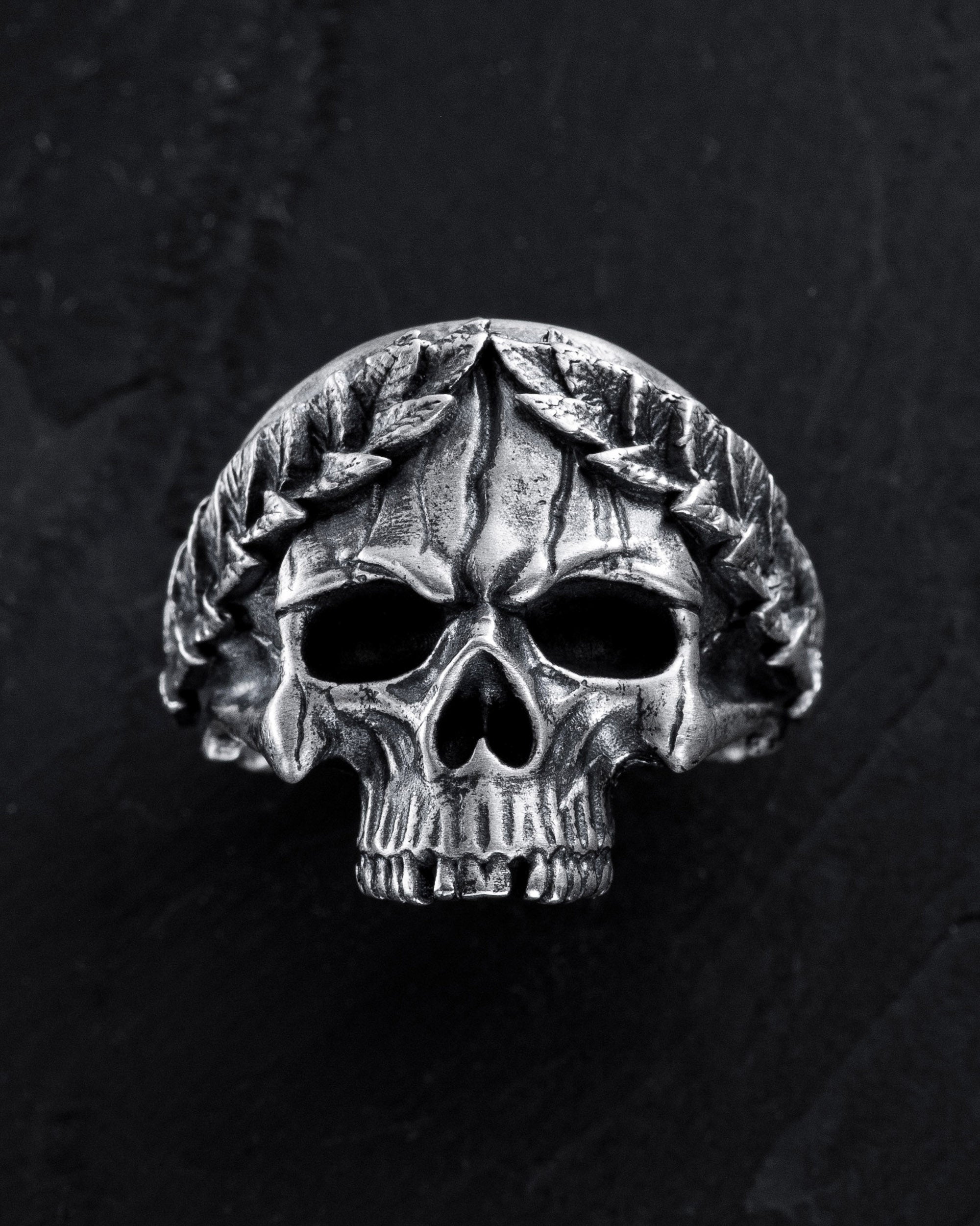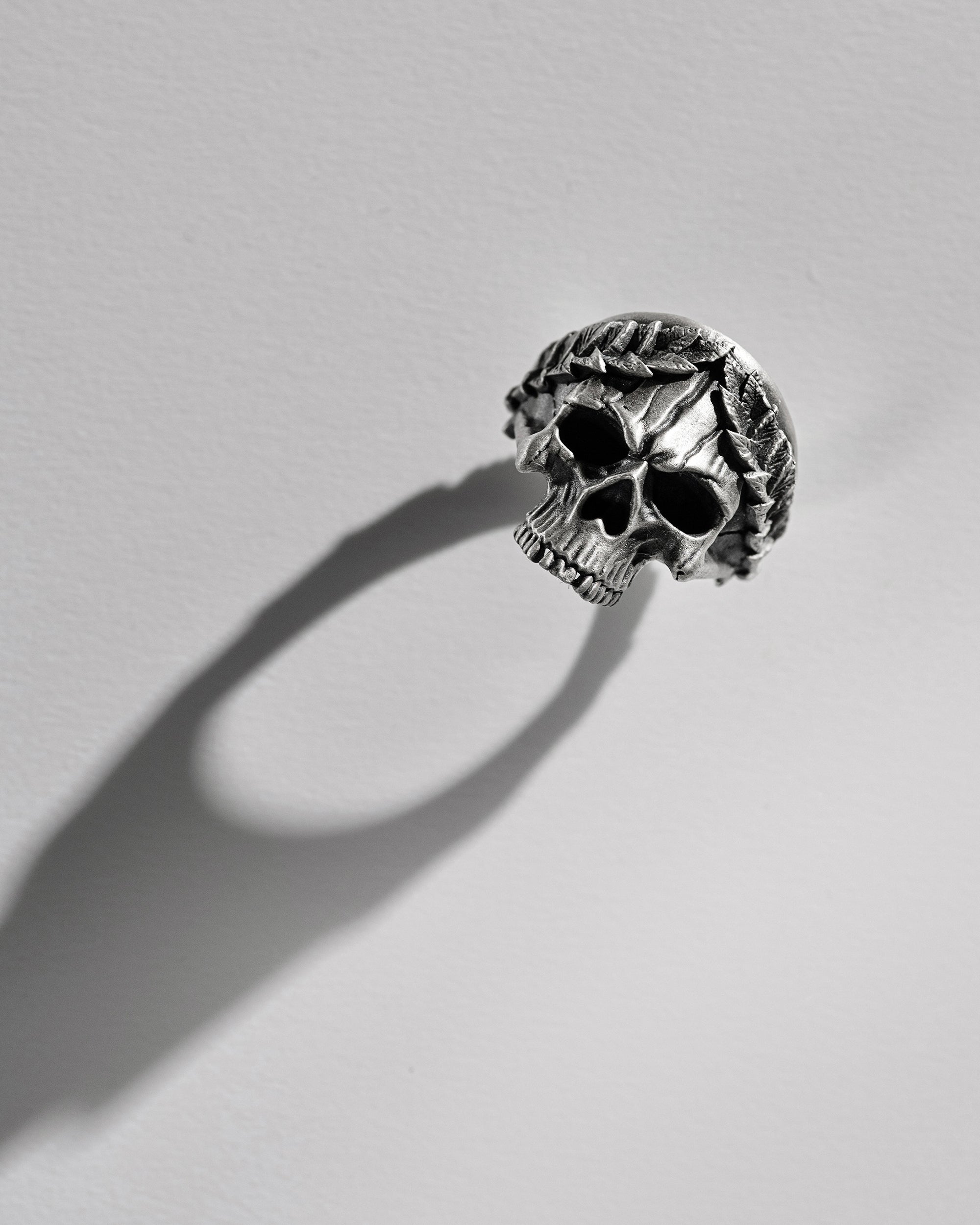 Der Totenkopf im Kranz symbolisiert Wiedergeburt und Transformation, Respekt vor der Vergangenheit und das Verständnis für die Bedeutung jedes Augenblicks im Leben. Der mystische und exzentrische Ring erinnert an die Vergänglichkeit und die Kontraste des Lebens.