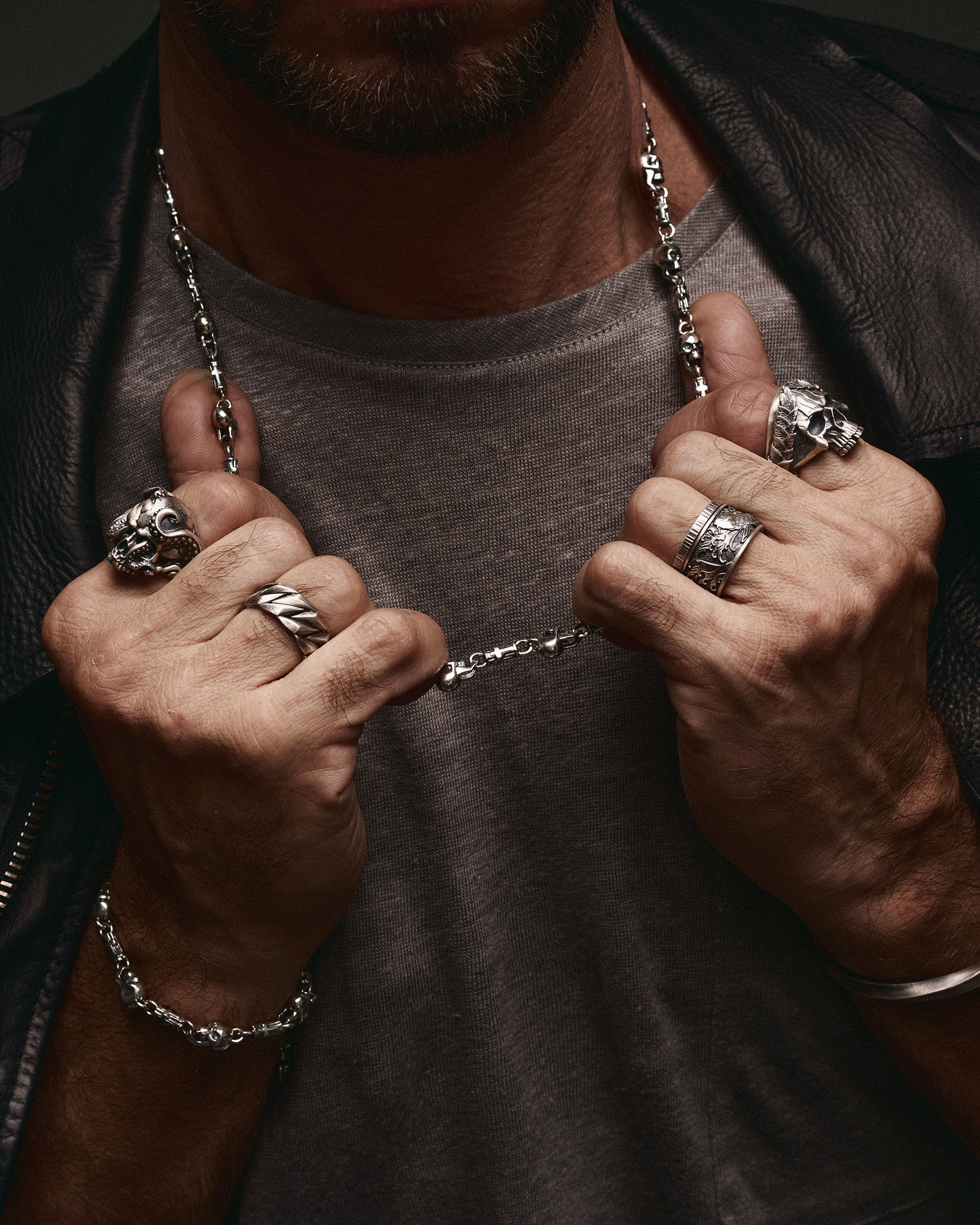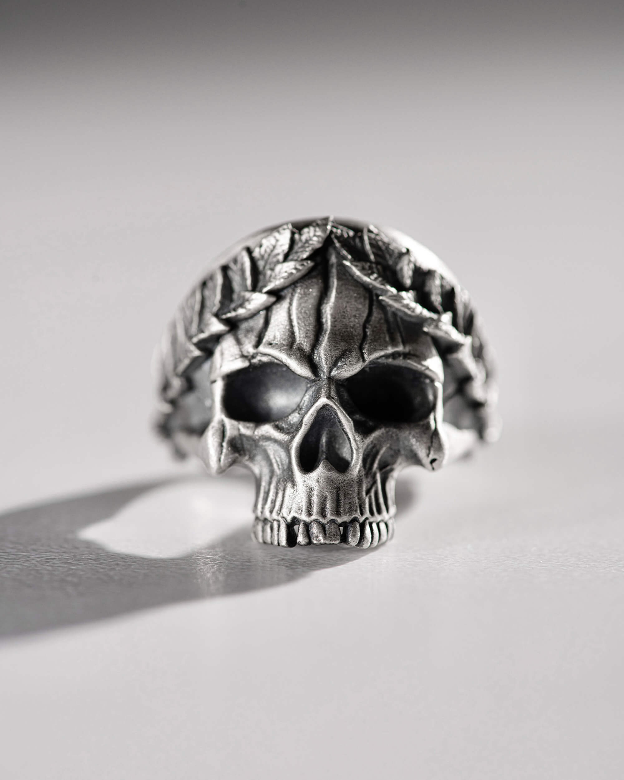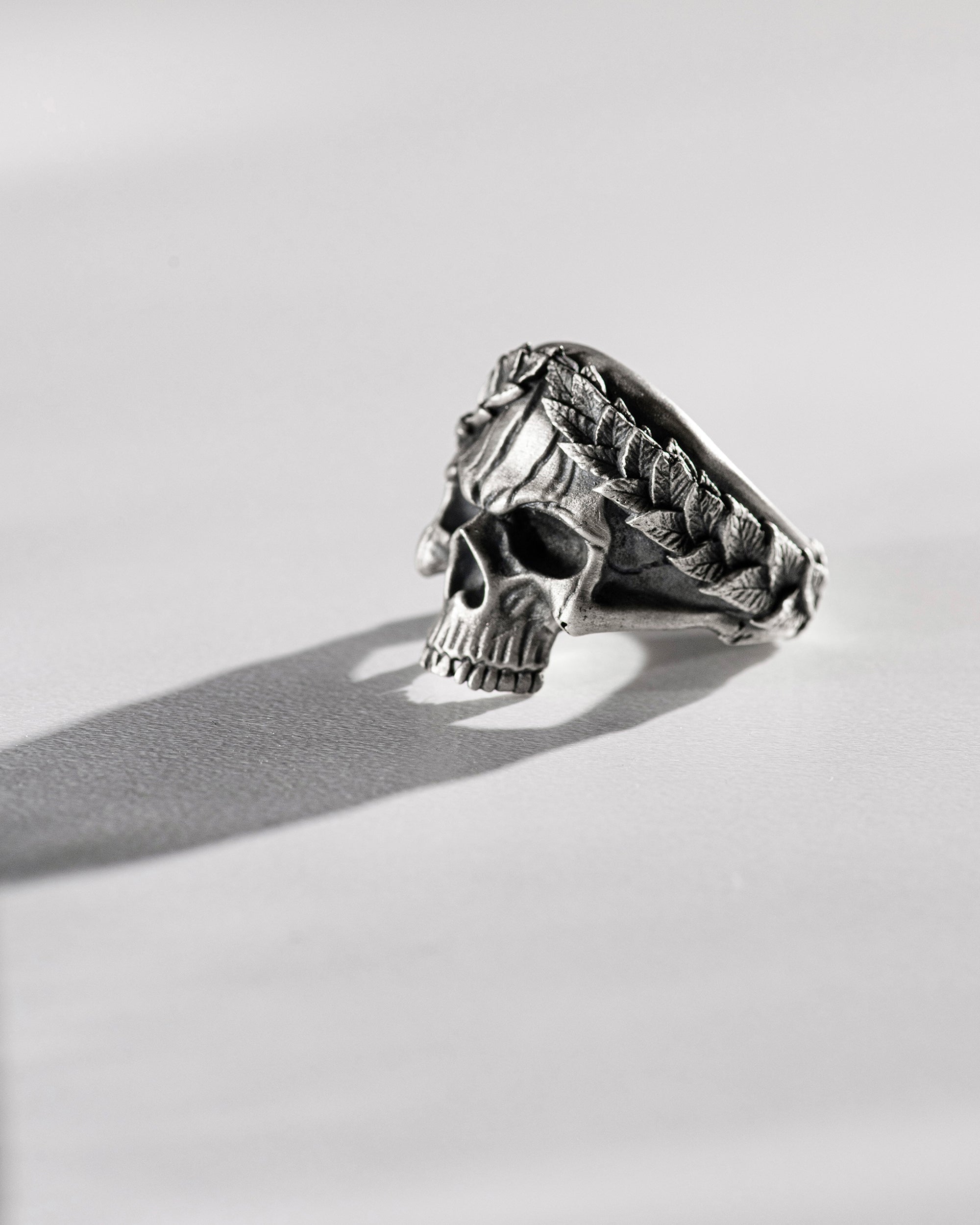 Der Totenkopf im Kranz symbolisiert Wiedergeburt und Transformation, Respekt vor der Vergangenheit und das Verständnis für die Bedeutung jedes Augenblicks im Leben. Der mystische und exzentrische Ring erinnert an die Vergänglichkeit und die Kontraste des Lebens.