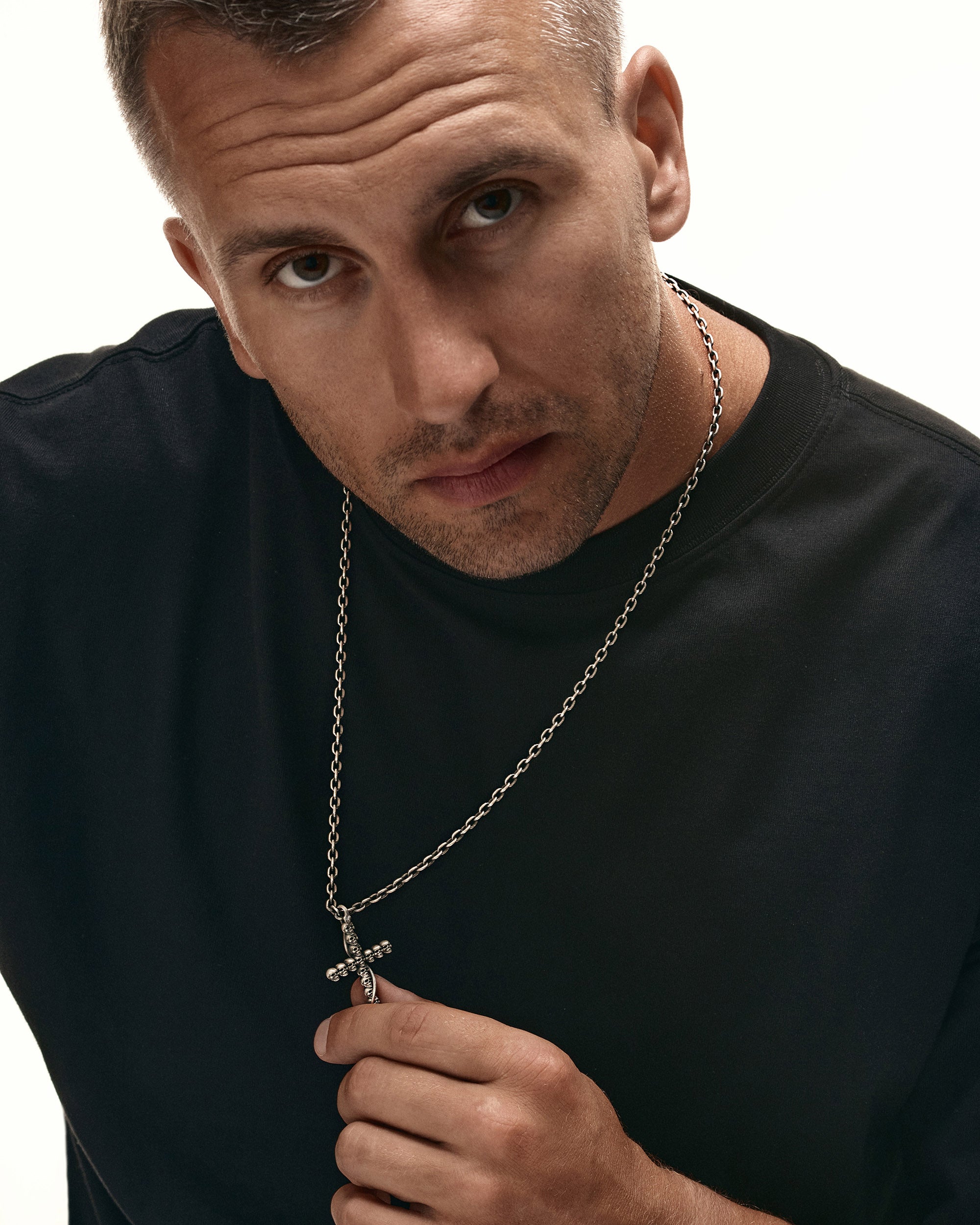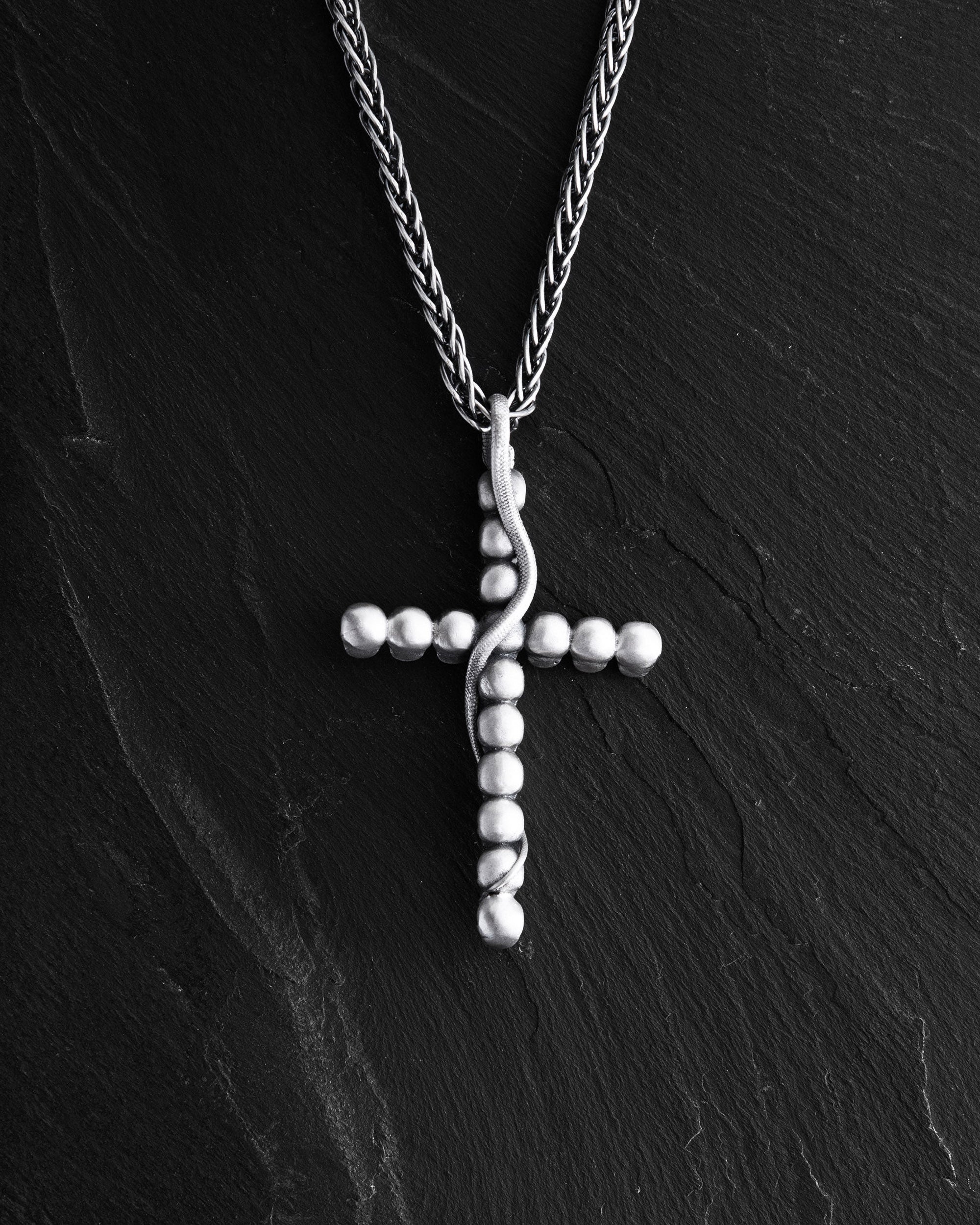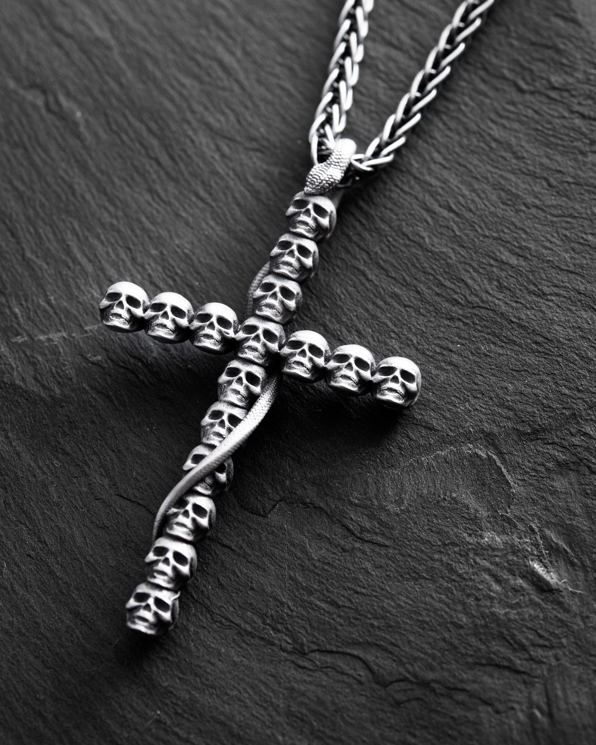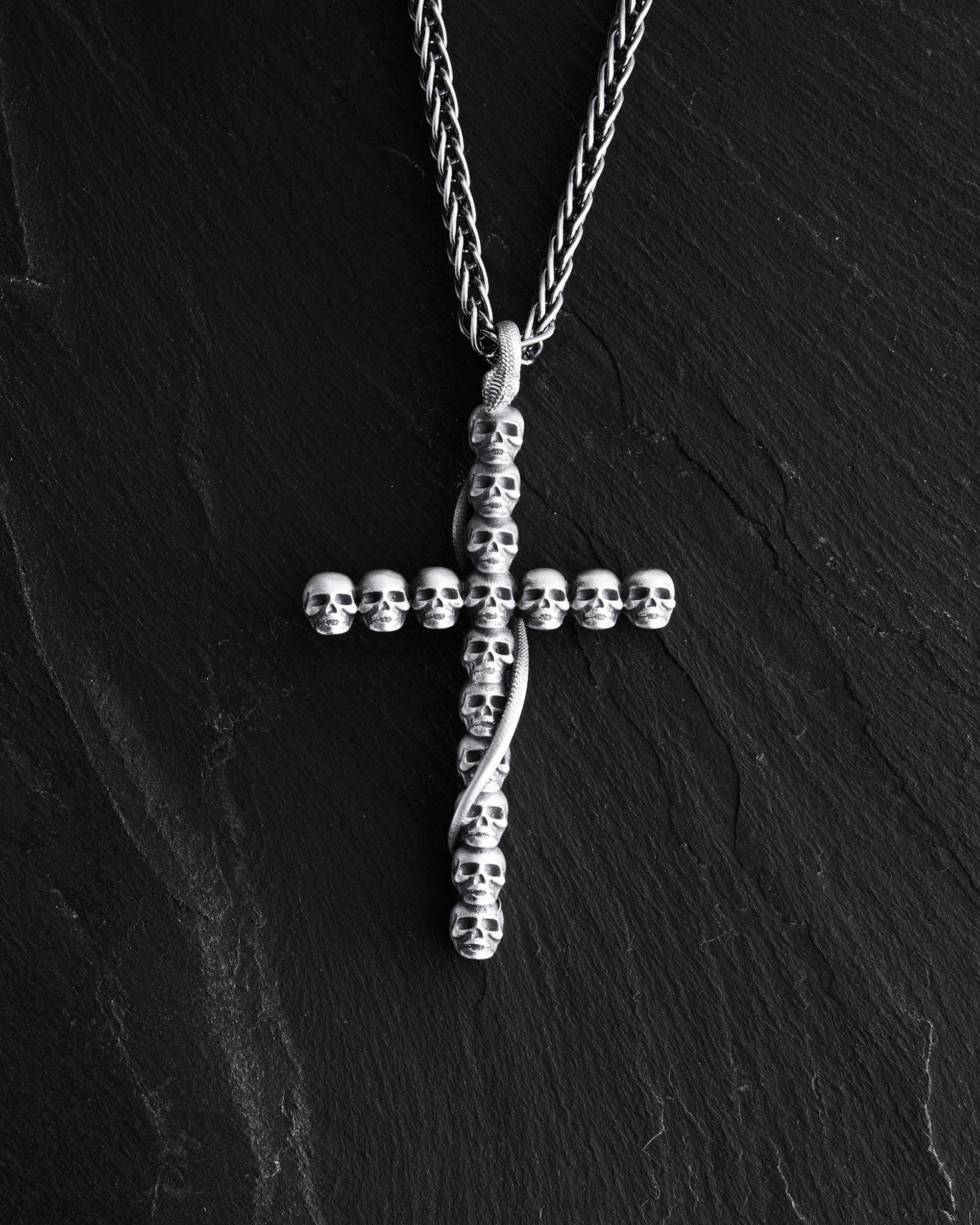 The silver pendant "GOTHIC CROSS WITH SNAKE" is a powerful symbol that combines the image of a cross made of skulls and a snake winding around it. This cross deeply embodies Gothic symbolism, where each element has its own meaning and special power. The cross, made of skulls, reminds of the inevitability of death and the fragility of life, emphasizing the importance of spiritual self-awareness and inner strength. The skulls remind of the transience of earthly life and at the same time symbolize the wisdom that comes with the awareness of one's mortality. The snake, winding around the cross, symbolizes transformation, renewal, and infinity. Combined with the cross, the snake emphasizes the idea of rebirth and constant spiritual growth. This pendant is not just an accessory, but a powerful amulet that combines the symbolism of rebirth and infinite spiritual development. It serves as a reminder of the importance of spiritual growth, the search for inner wisdom, and strength.
