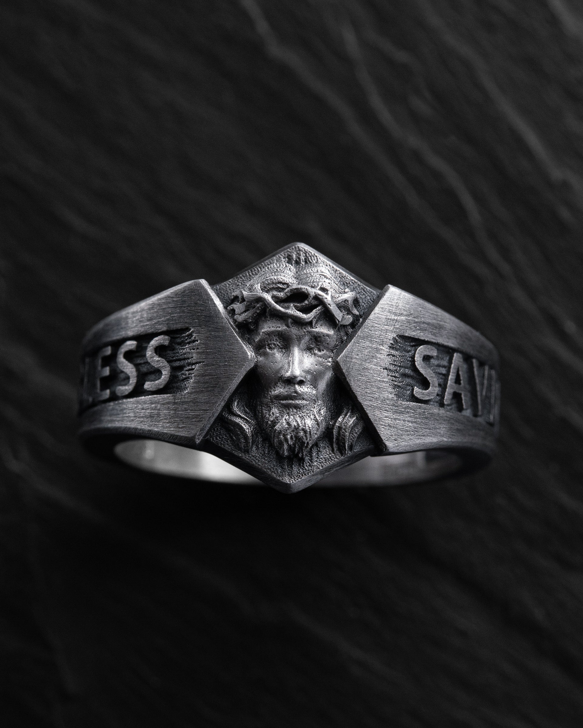 At the center of the ring is an image of Jesus Christ, embodying mercy, the power of faith, and hope. On the sides, the inscription "GOD BLESS, SAVE US" (translated from English as "God bless and save us") is engraved—a prayer that calls upon the Lord for blessing and salvation.