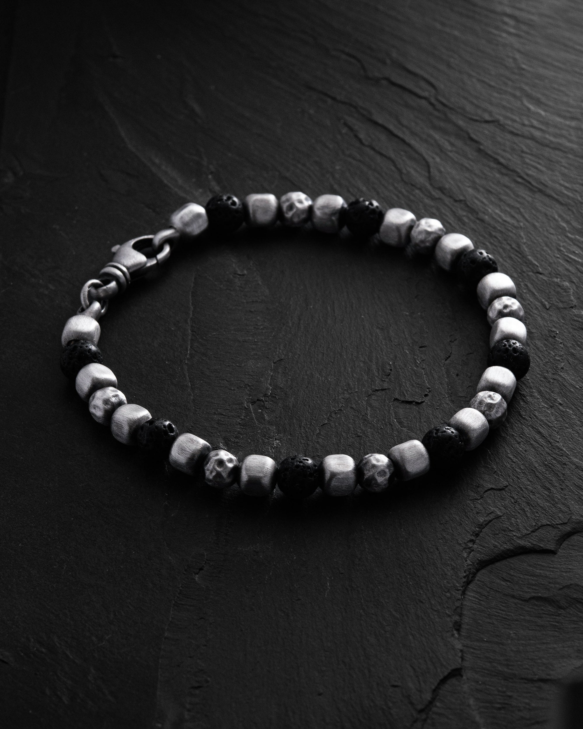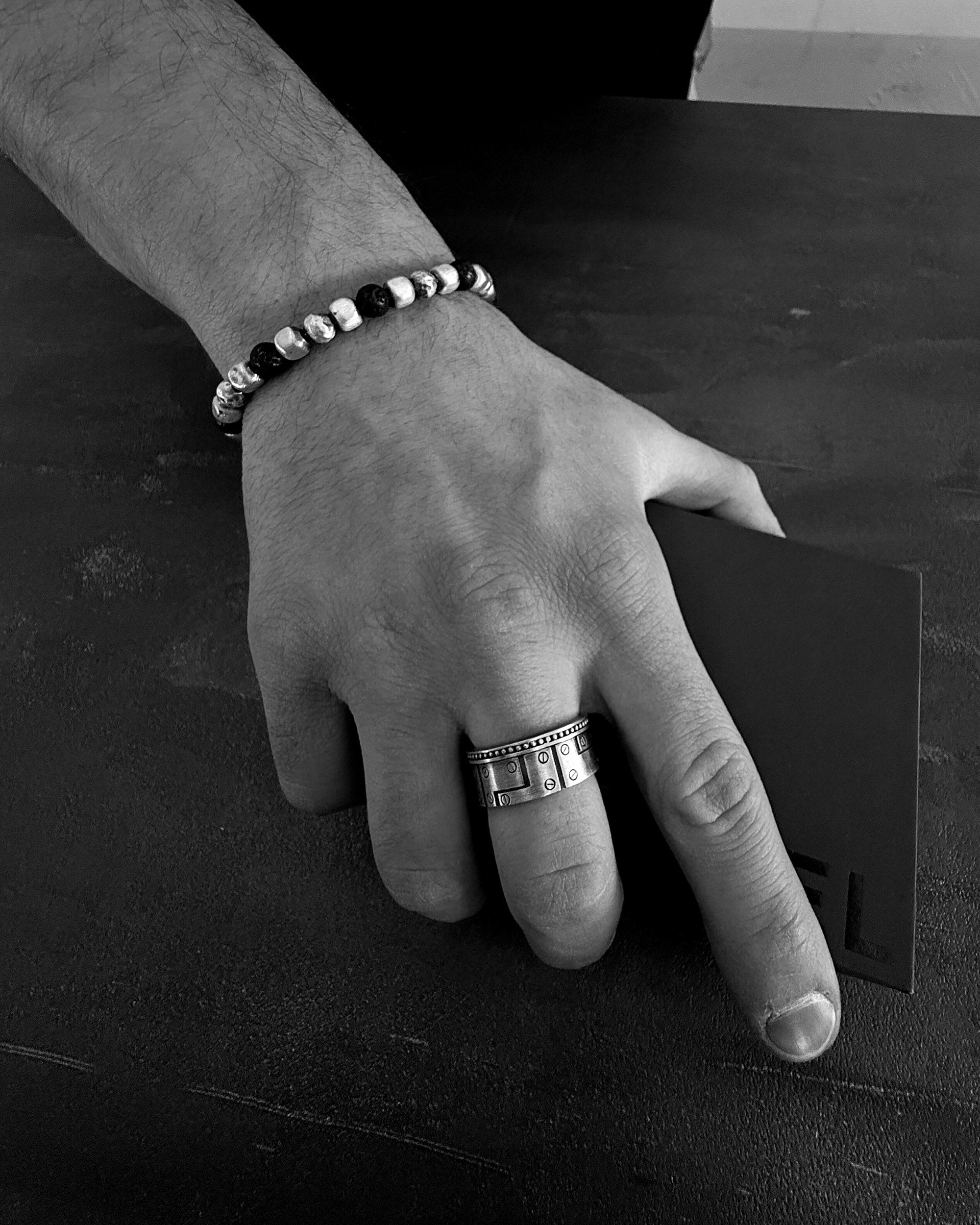 The silver bracelet CUBE. LAVA STONE is a fusion of geometric precision and elemental energy. The silver cubes symbolize structure, conscious choice, and inner order, while volcanic lava represents transformation, resilience, and strength forged in fire. The contrast in textures creates a balance between control and instinct.