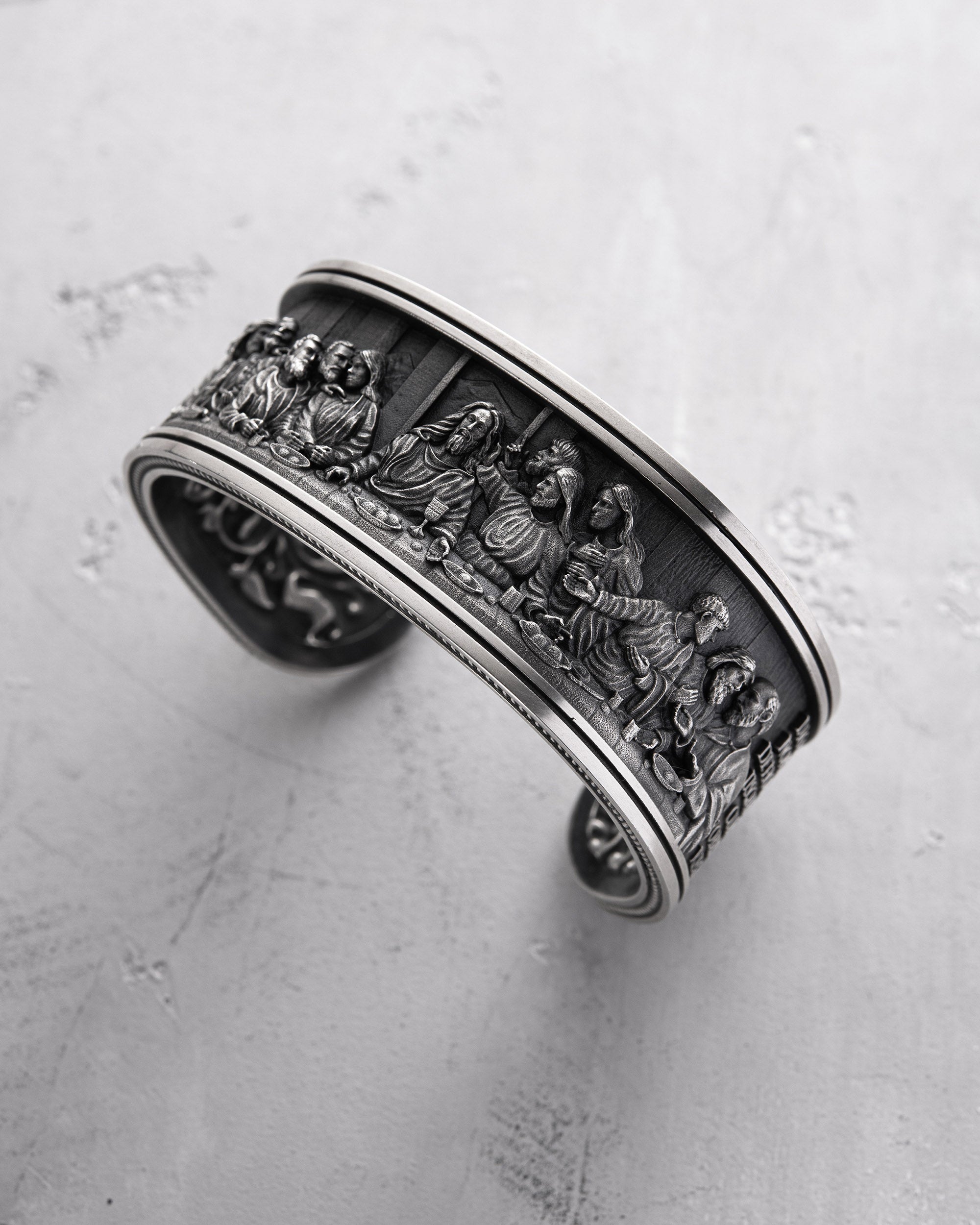 The silver cuff bracelet "THE LAST SUPPER" is a refined piece of jewelry that embodies one of the most important events in Christianity — the Last Supper. The bracelet features a detailed depiction of the scene from Leonardo da Vinci's famous painting, symbolizing Jesus Christ's final meal with his apostles before the crucifixion.