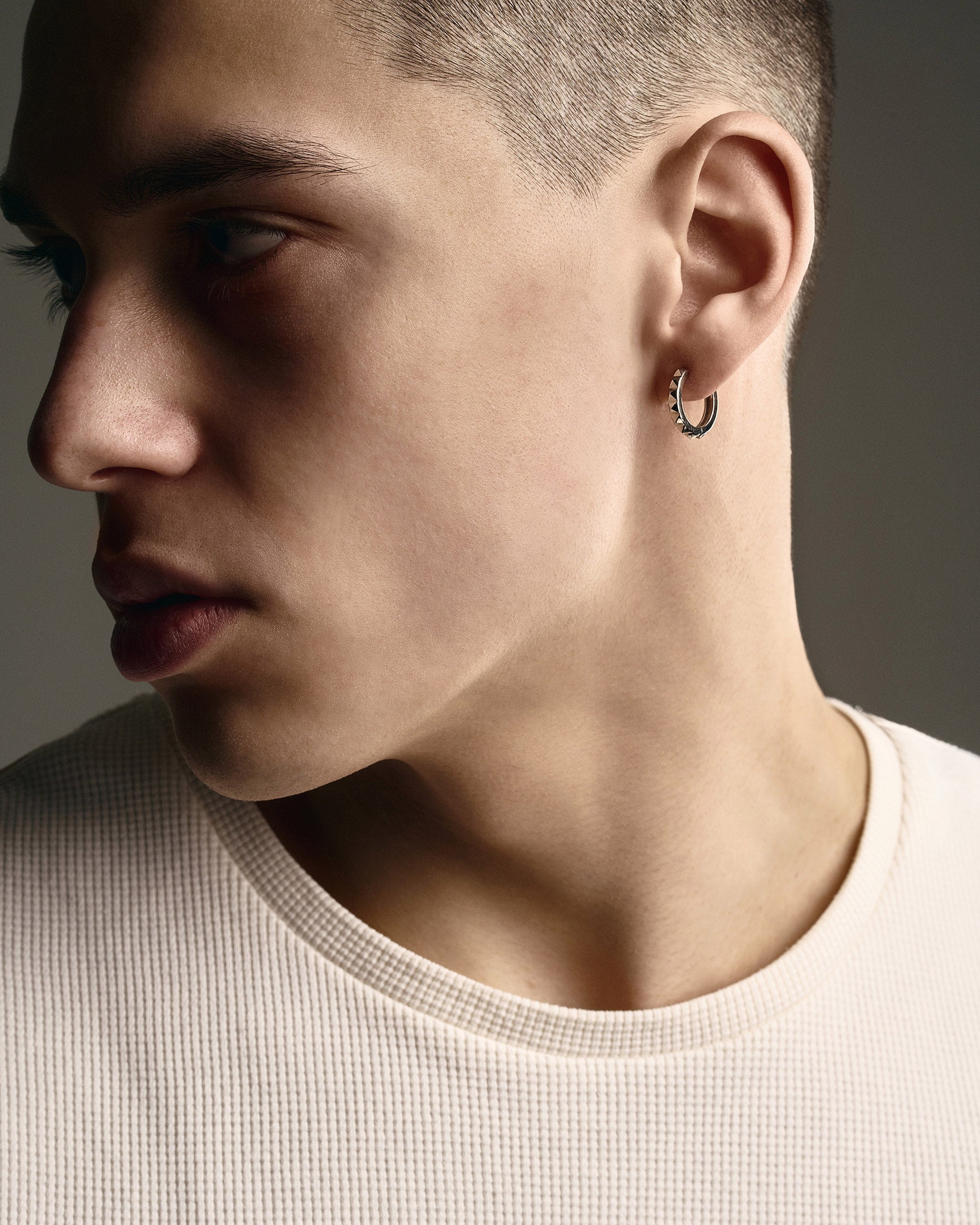 14k white gold earring-ring "HARD" is finished in a matte coating, distinguished by its unique geometry that reflects steadfastness and reliability. Symbolizing resilience and endurance, "HARD" emphasizes the importance of unbreakability in the face of challenges and trials. Wearing this earring serves as a reminder of willpower and the ability to overcome any difficulties, making "HARD" not just a fashionable addition to any look but also a symbol of the owner's personal philosophy.