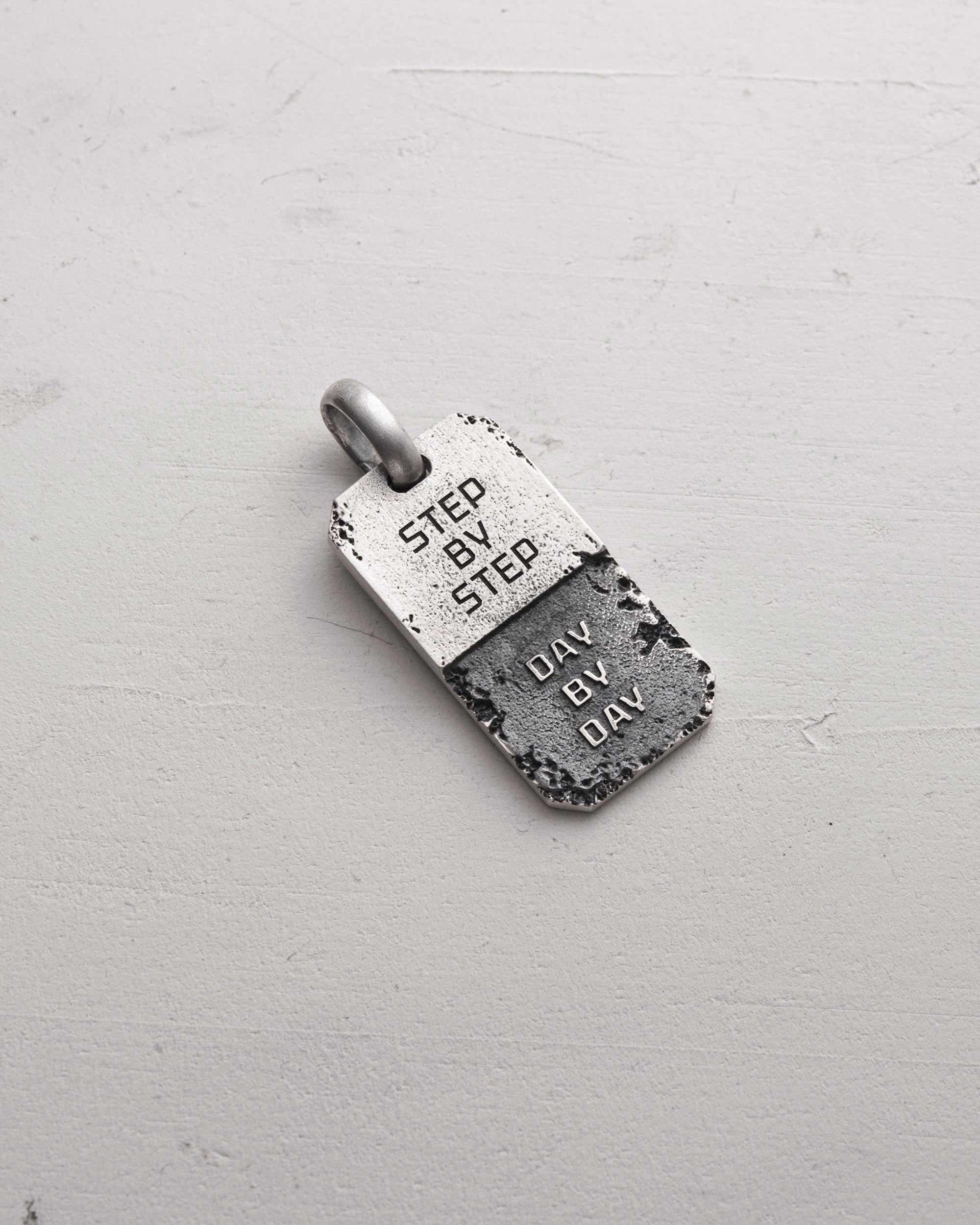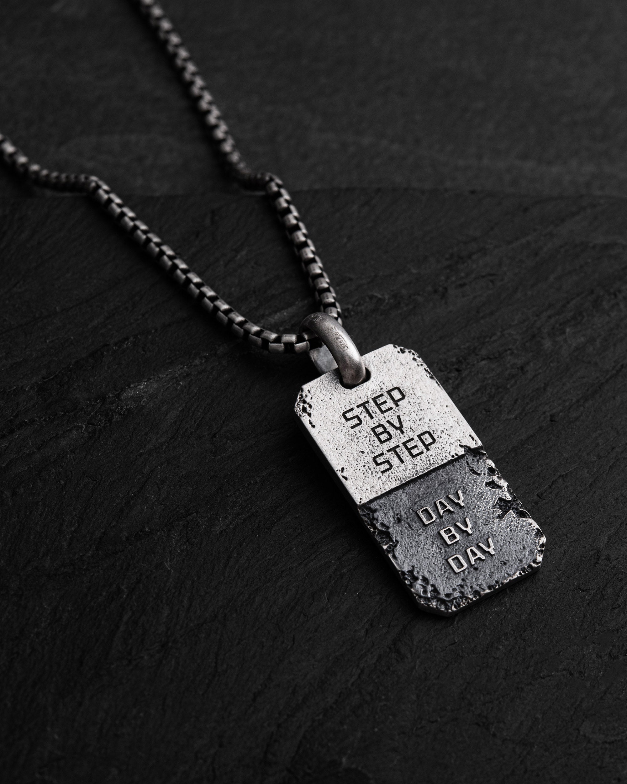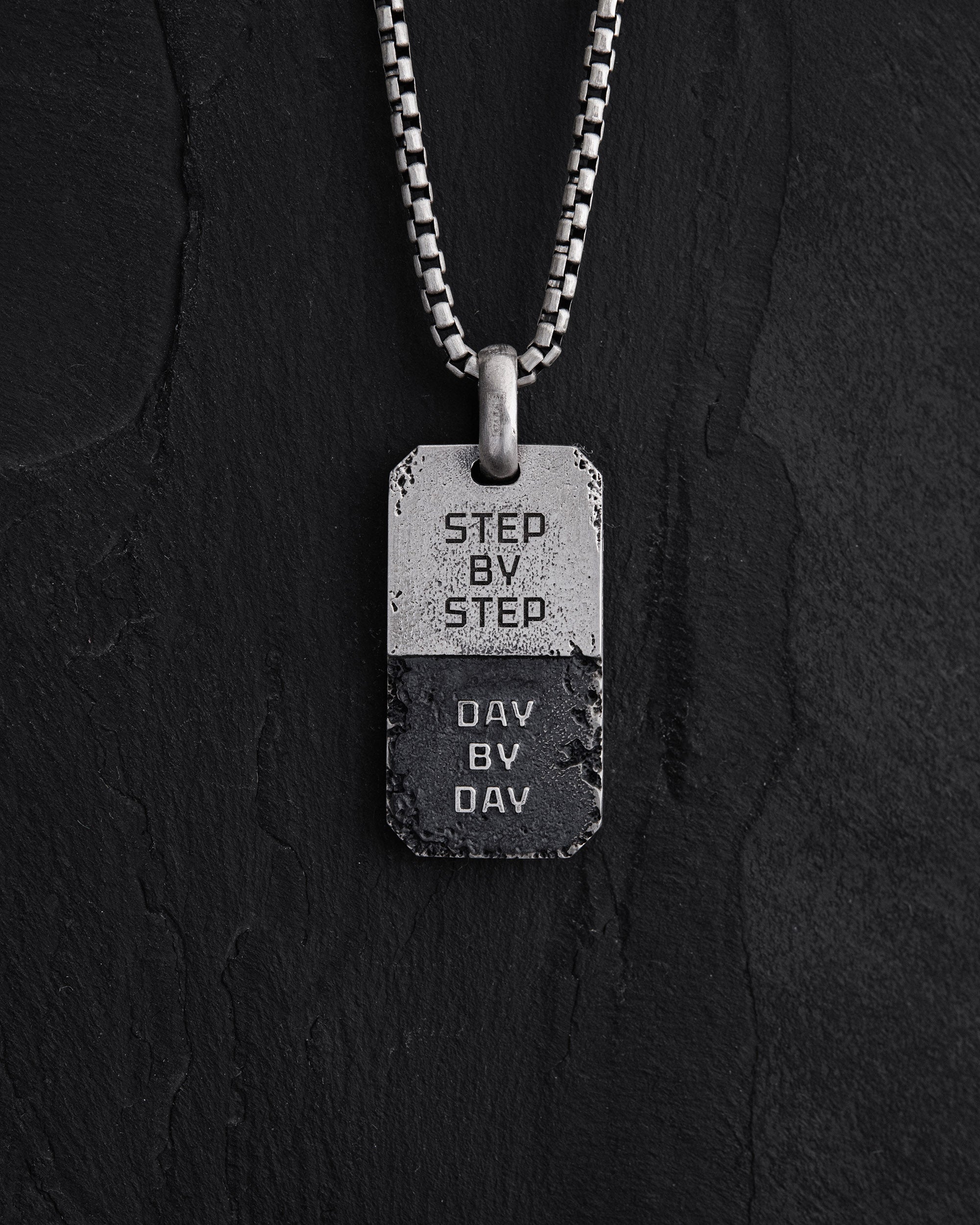 The silver pendant STEP BY STEP is about a path built through perseverance, not chance. The phrase engraved on it — “STEP BY STEP / DAY BY DAY” (“Step by step / Day by day”) — reminds us that real results come not from luck, but from steady, daily effort.