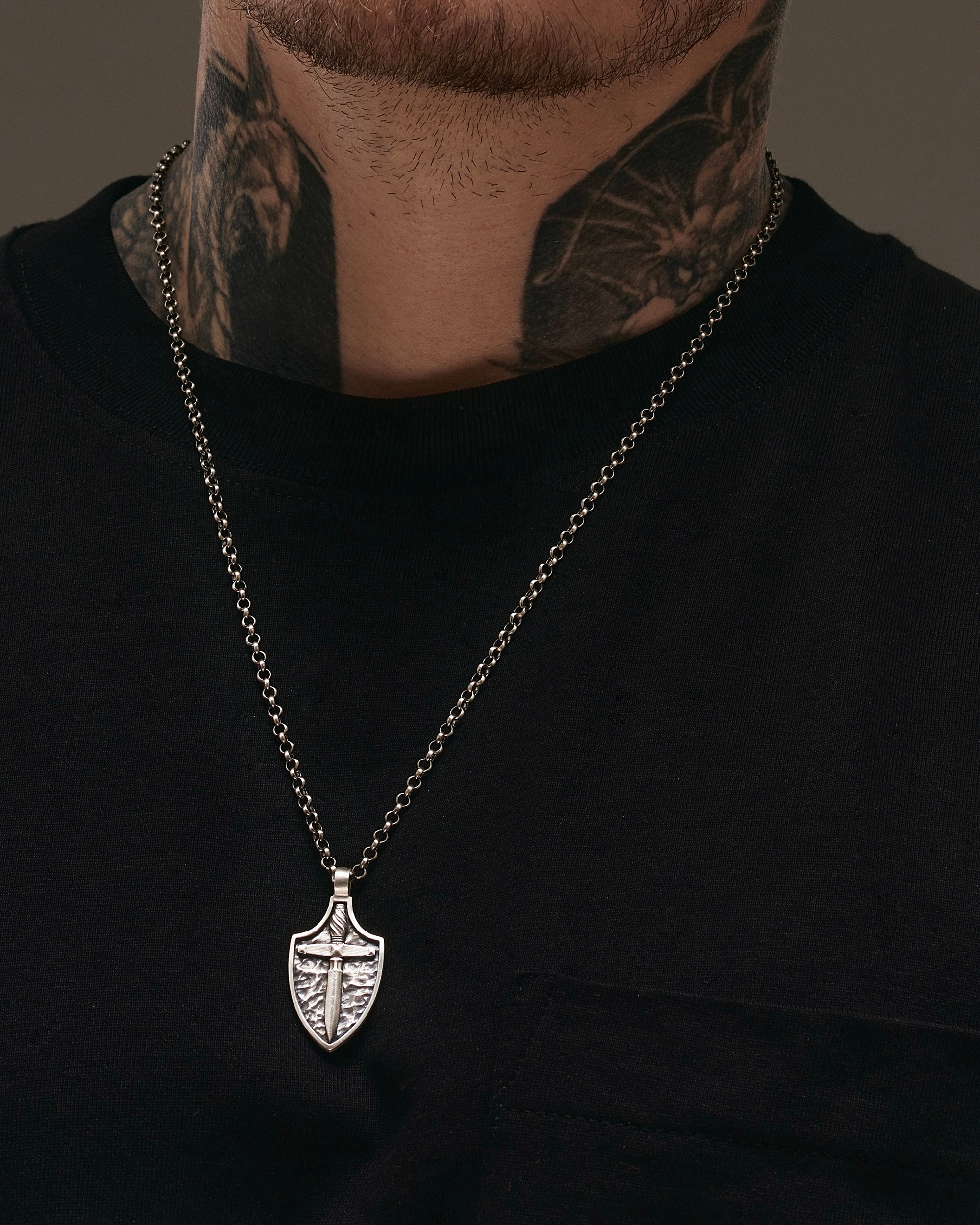 The men's silver pendant SWORD ON SHIELD is an embodiment of bravery and protection. The sword in this pendant symbolizes strength and courage, while the shield represents defense and resilience. This accessory combines the active and passive aspects of masculine energy, making it the perfect accessory for those who value determination and endurance.