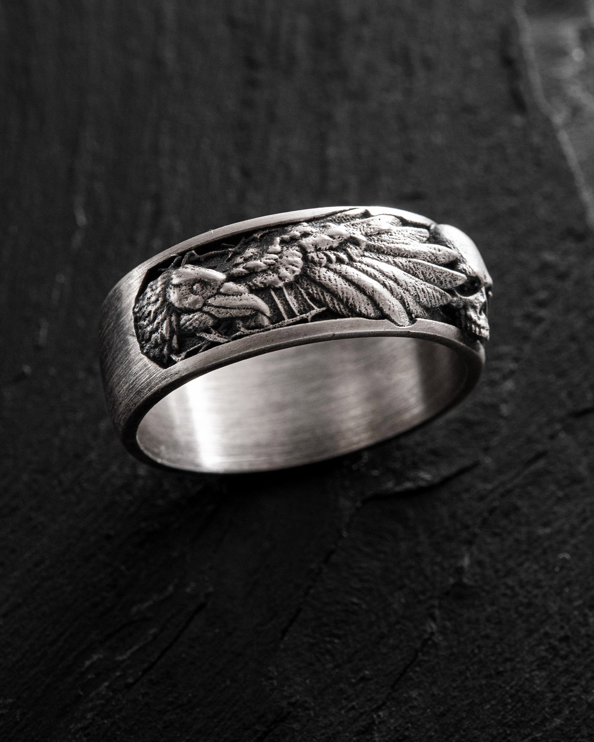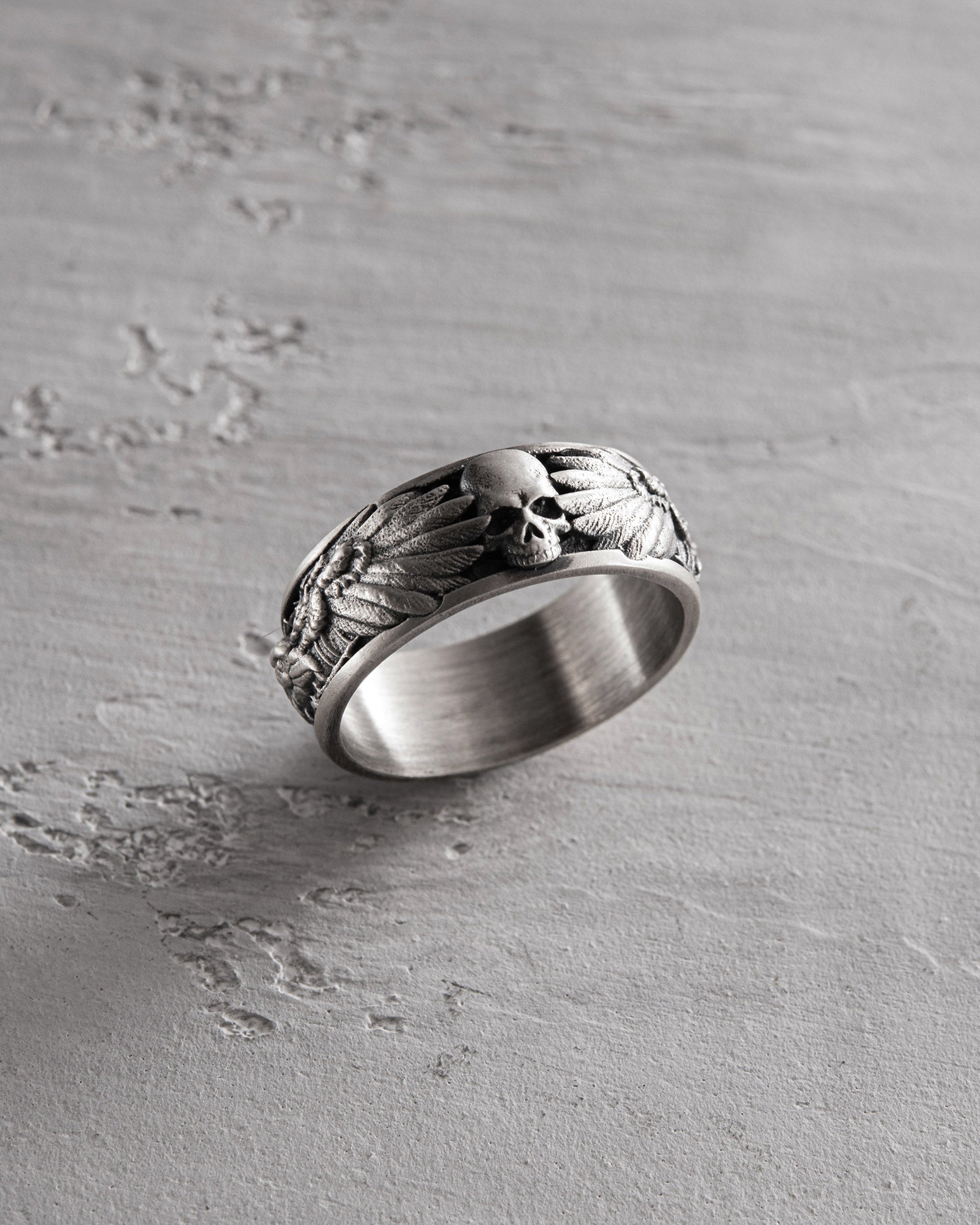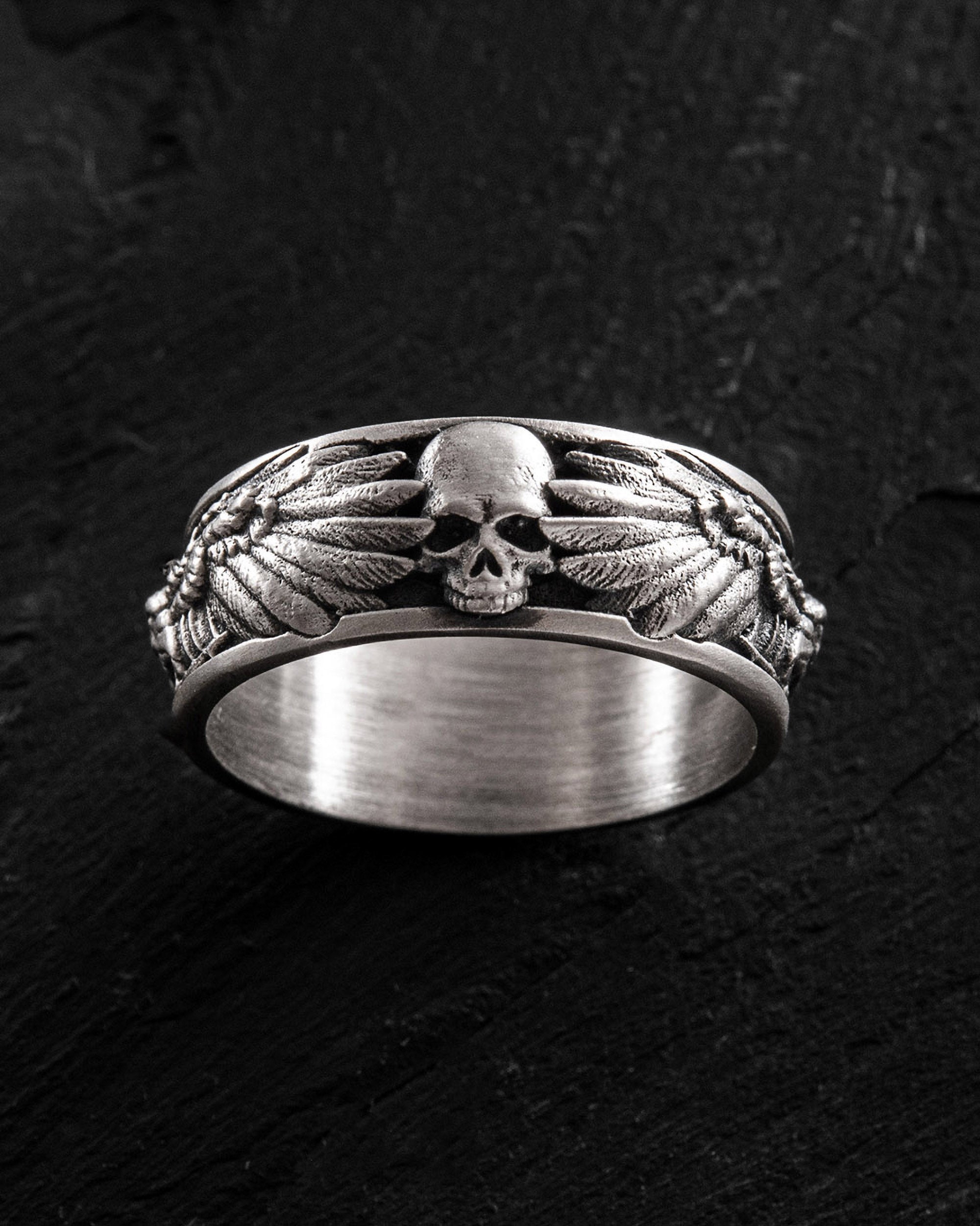 Silver ring "RENASCENTIA" (translated from Latin as "rebirth") symbolizes the process of rebirth, renewal, and new beginnings. Its design reflects the concept of renaissance, emphasizing the importance of continual self-improvement and inner growth. The central element of the ring is a skull with wings, symbolizing the transition from death to new life, highlighting transformation and liberation from the past. This ring serves as a reminder that even after the toughest challenges, there is always the potential for a fresh start and transformation. Wearing the "RENASCENTIA" ring highlights your readiness for change, strength of spirit, and aspiration for a better future. It inspires its wearer to seek new opportunities and resilience in the face of life's challenges.