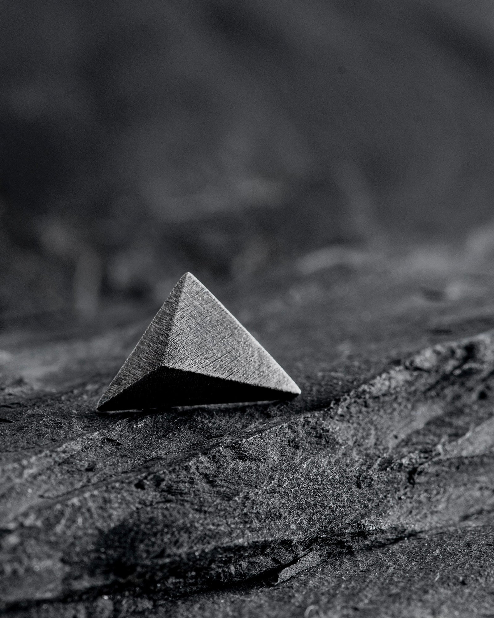 The silver single earring "PYRAMID" captivates with its geometric simplicity and symbolic meaning. This men's earring, finished in matte black, is shaped like a pyramid, symbolizing stability, strength, and eternity. The pyramid, directing energy upwards, embodies the aspiration for development and self-improvement. "PYRAMID" is the perfect choice for courageous men, reminding them of the importance of personal goals and ideals.