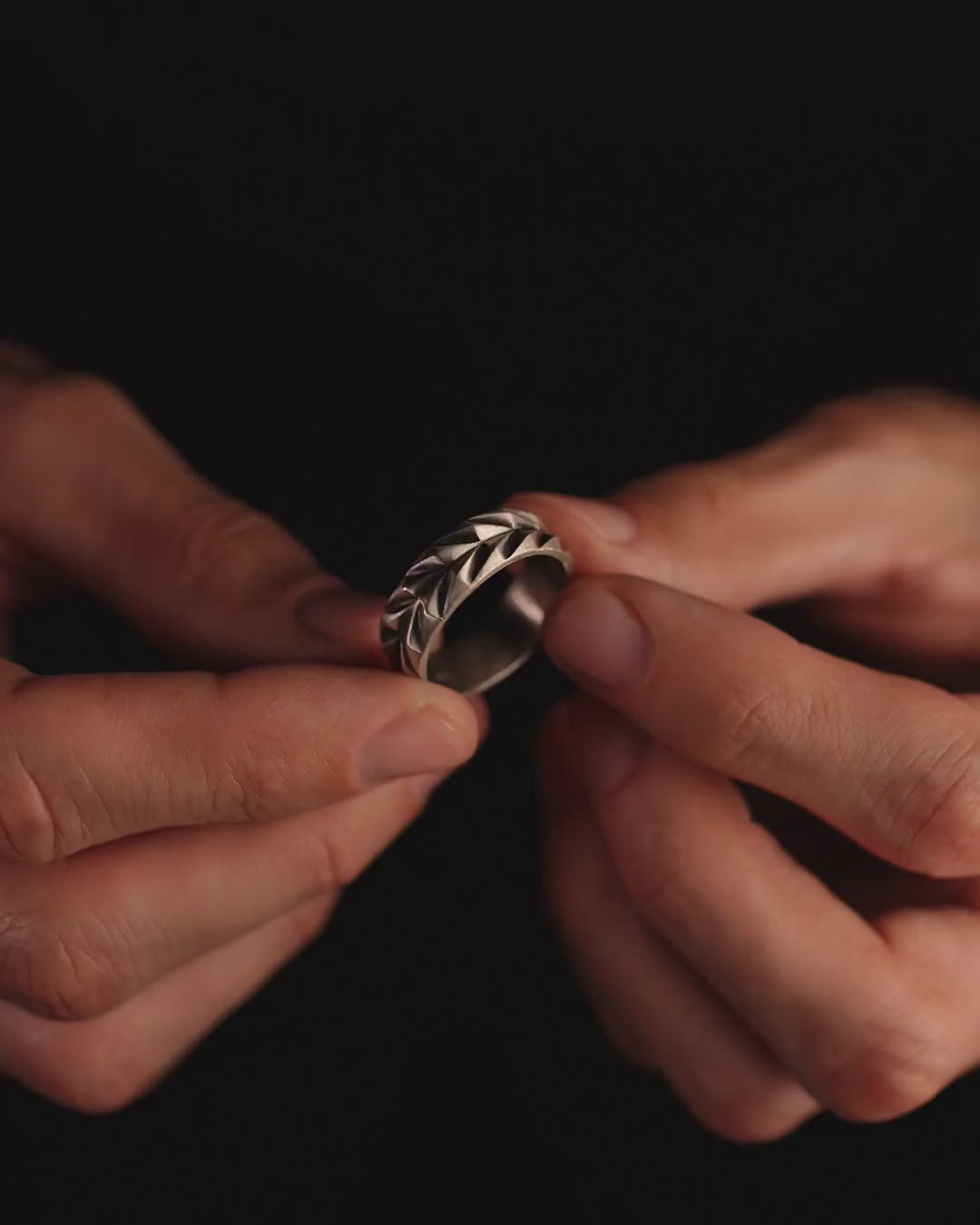 The silver ring "WHEAT EAR" is a men's accessory that combines the symbolism of fertility and prosperity with an innovative design. The geometric pattern resembling a wheat ear emphasizes the harmony between nature and technology. This men's ring symbolizes abundance, strength, and a connection to the native land, reminding of the importance of traditions and modern achievements. By choosing "WHEAT EAR," a man expresses his respect for nature and his aspiration for success and prosperity. This ring becomes an ideal accessory for those who appreciate the harmony between the past and the future.