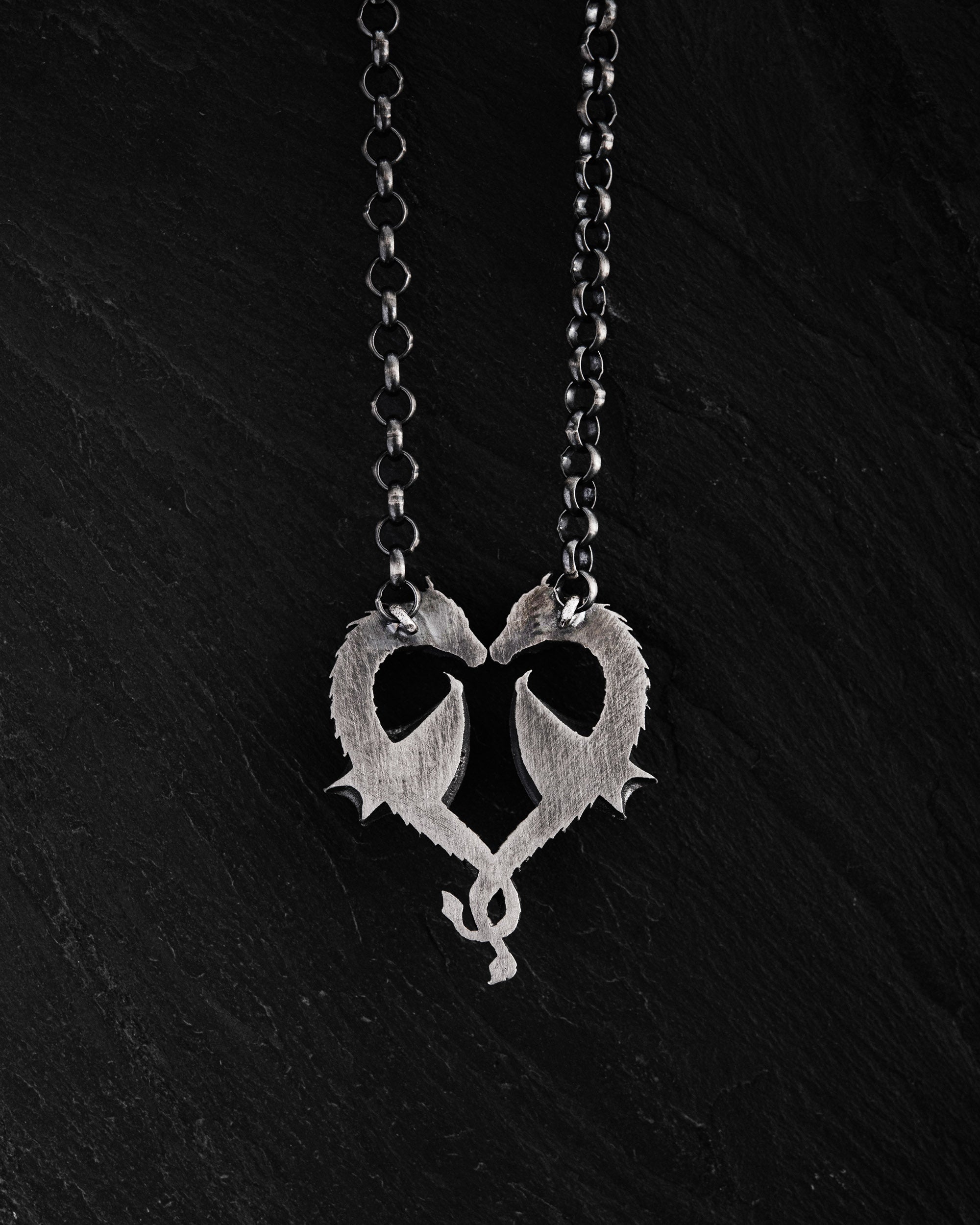 The "DRAGON HEART" pendant symbolizes loyalty and love, associated with mythical creatures. This pendant embodies the strength, wisdom, and dedication of dragons, which in many cultures are seen as guardians with unwavering will. The image of two dragons on the pendant symbolizes deep feelings that endure the trials of time and circumstance.