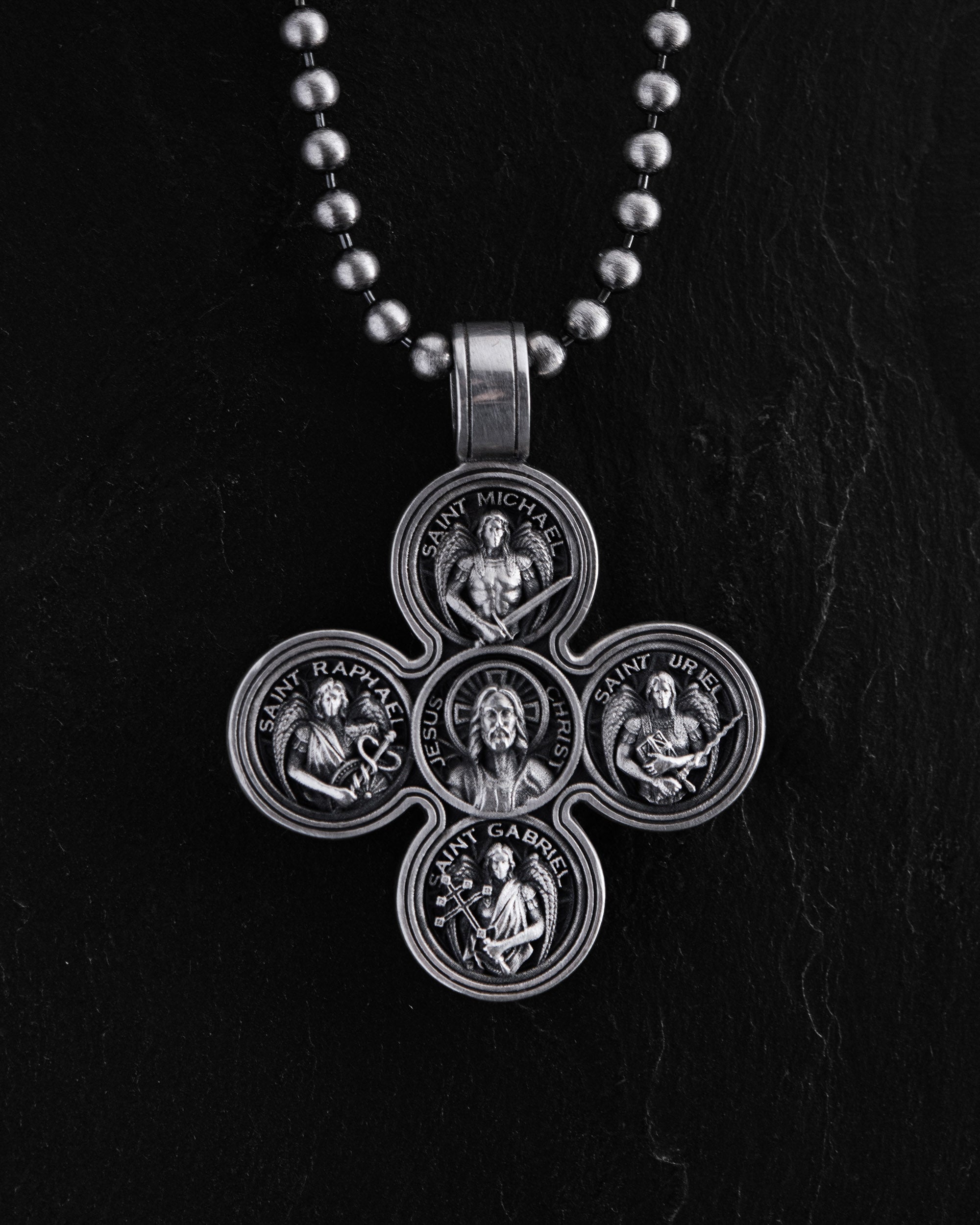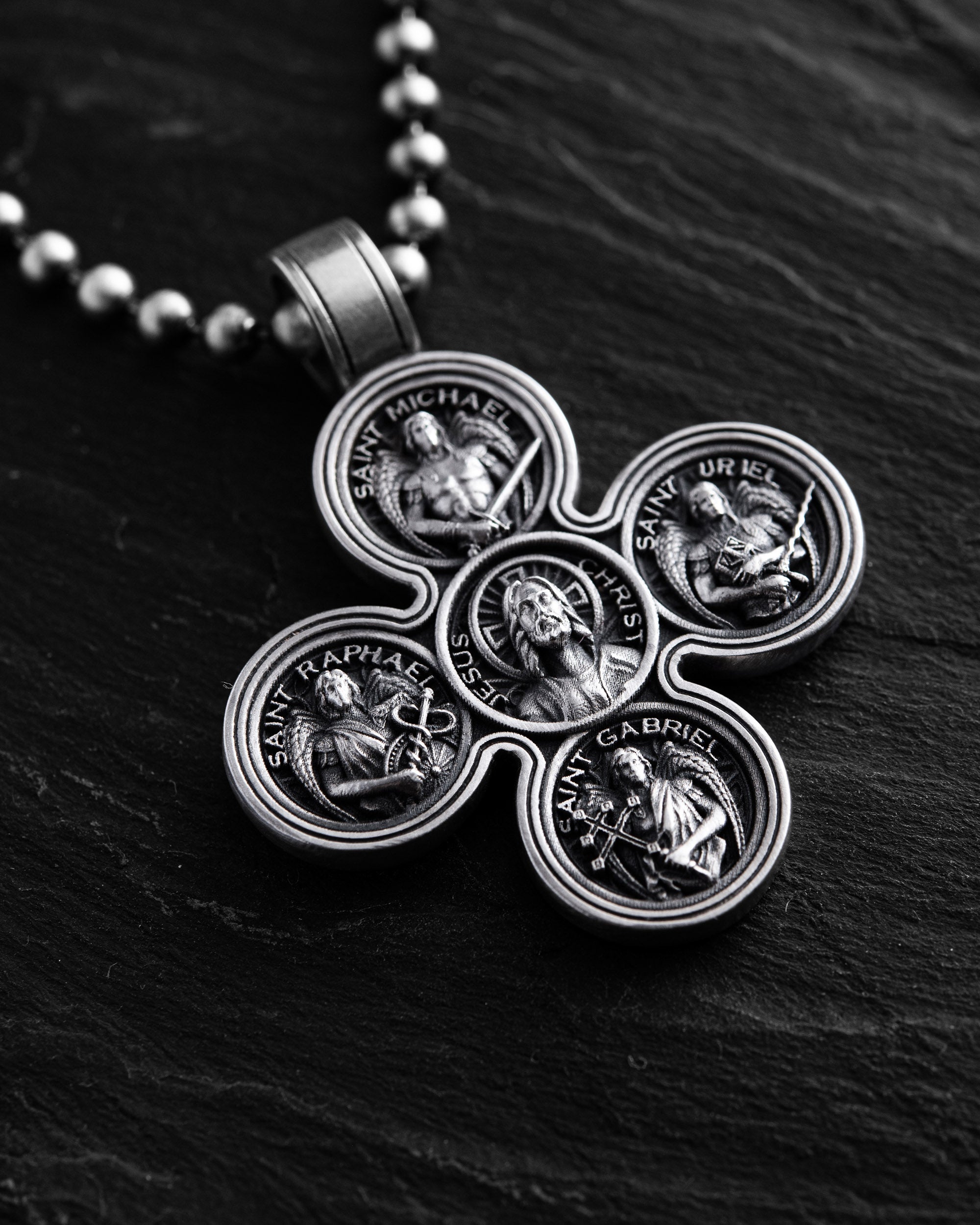 The "JESUS AND THE FOUR ARCHANGELS" silver cross is a powerful spiritual symbol of faith, protection, and divine guidance. At the center of the cross is Jesus Christ – the source of light, salvation, and infinite love. His image serves as a reminder of faith, mercy, and the power of prayer