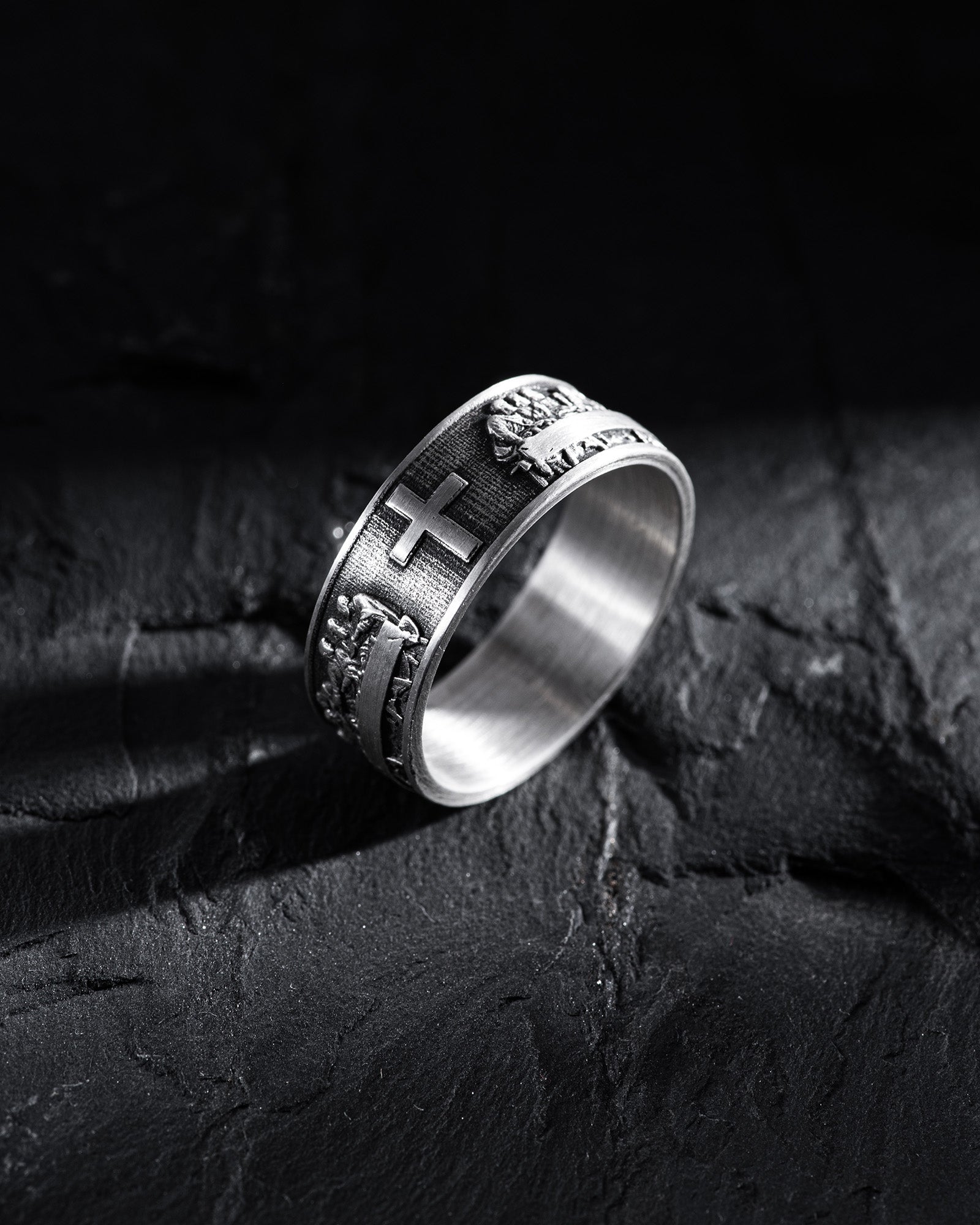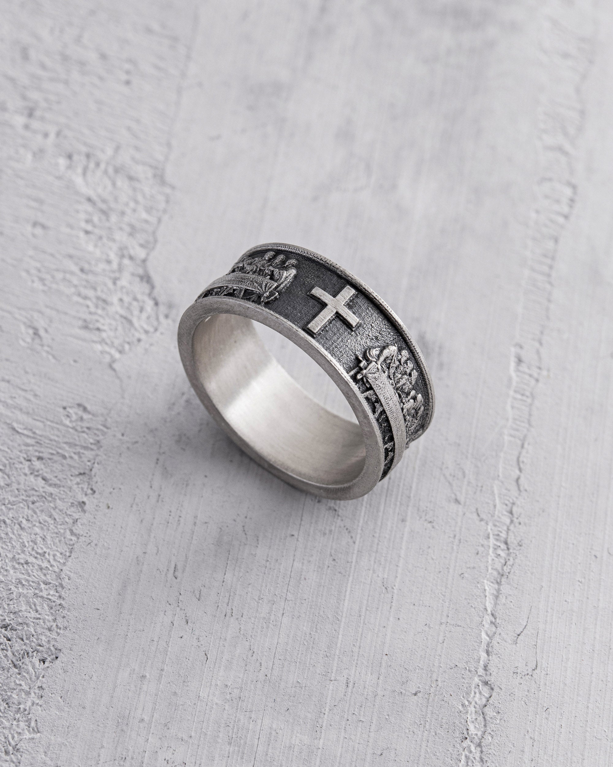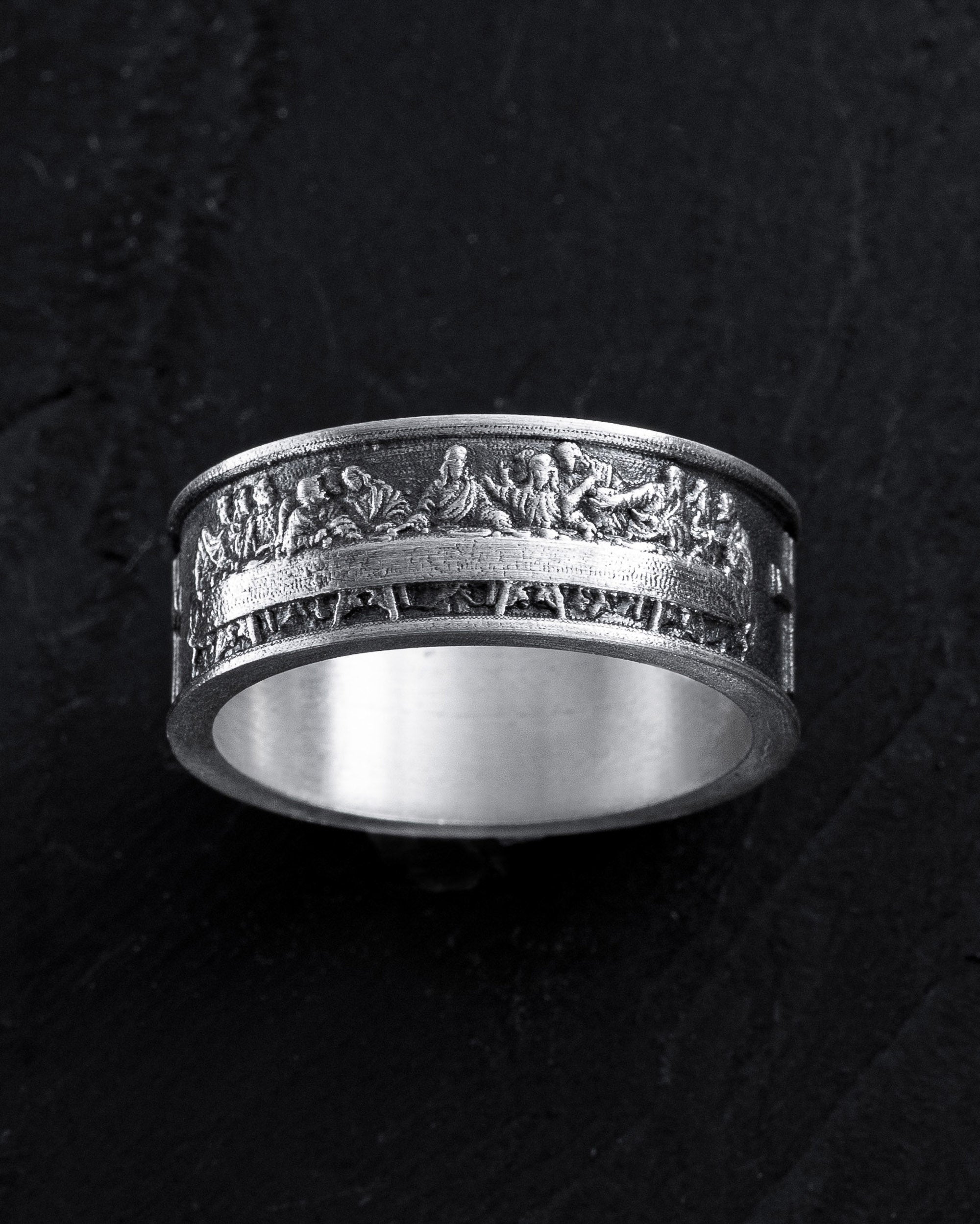 "DA VINCI HERITAGE" Silver Ring impresses with its sophistication and symbolism, depicting the scene of "The Last Supper" of Christ with his disciples. Every detail of this masterpiece is depicted on the ring, recreating the moments of Jesus' meeting with His disciples. This accessory transports to the ancient Jerusalem hall, where the dramatic story of salvation and betrayal unfolds. Wearing this ring is not only a tribute to Da Vinci's creativity but also a way to carry on oneself an eternal symbol of faith, salvation, and human relations.