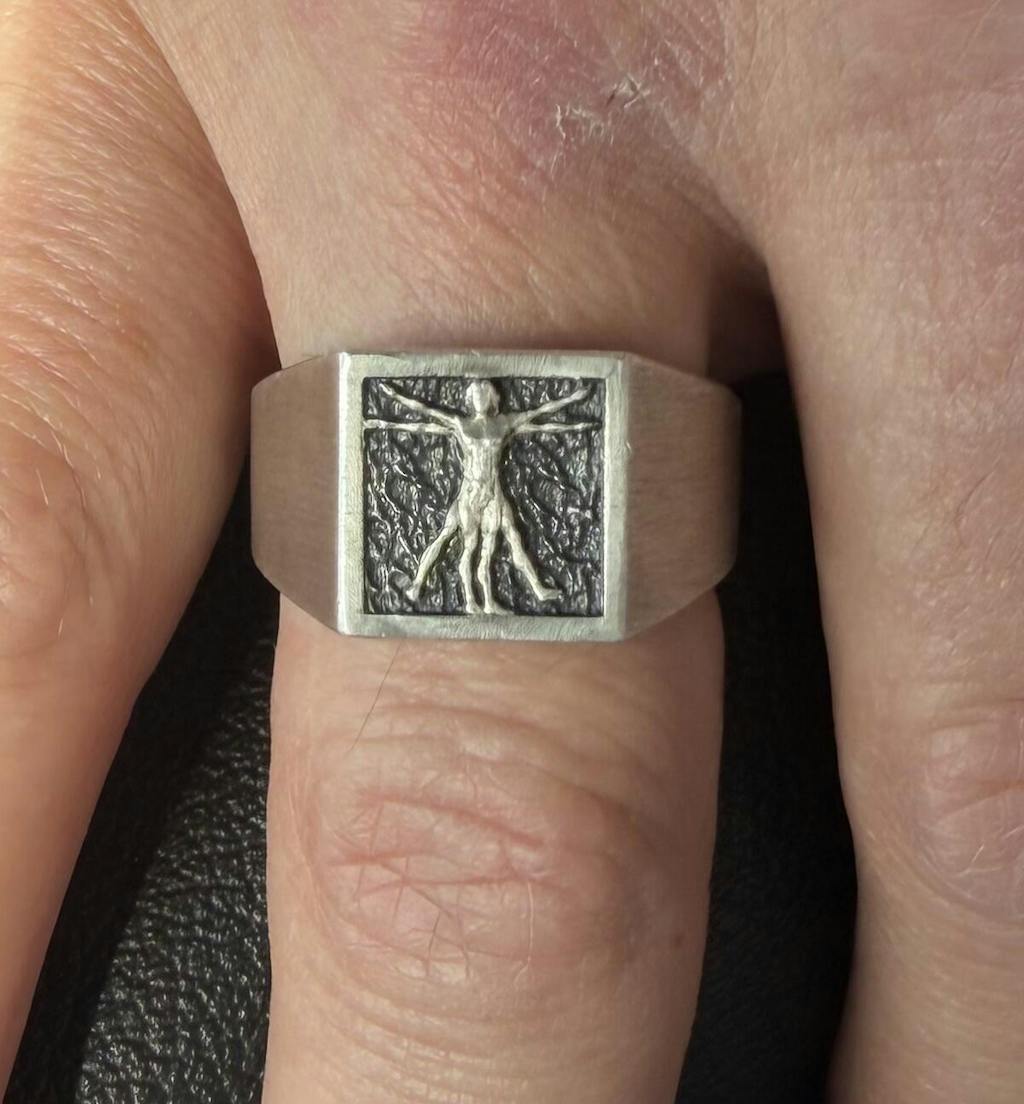 I recently purchased the VITRUVIAN MAN silver ring, and I couldn't be more thrilled with my choice! The craftsmanship is exceptional, showcasing intricate details that truly capture the essence of the Vitruvian Man design. The silver has a brilliant shine, and the ring feels sturdy yet comfortable to wear daily. I've received numerous compliments on its unique and sophisticated look. This piece is not just a ring; it's a work of art that adds a touch of elegance to any outfit. Highly recommend to anyone looking for a bold, stylish accessory!