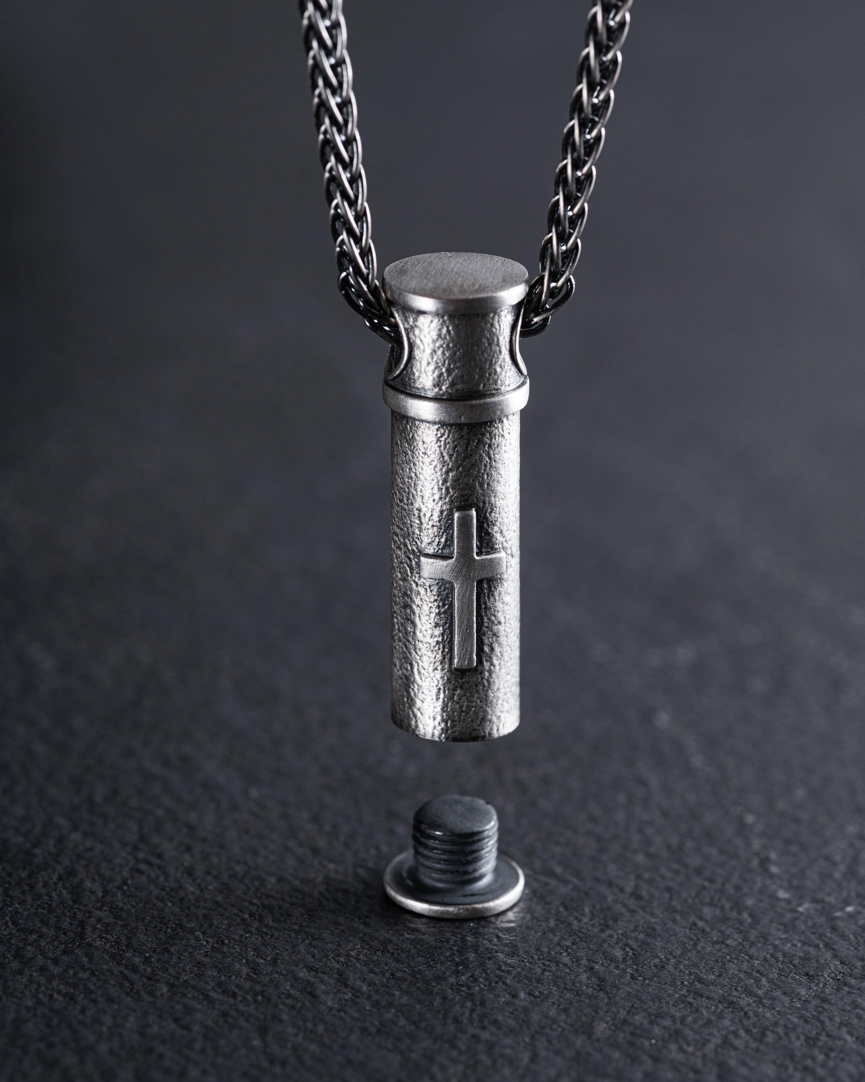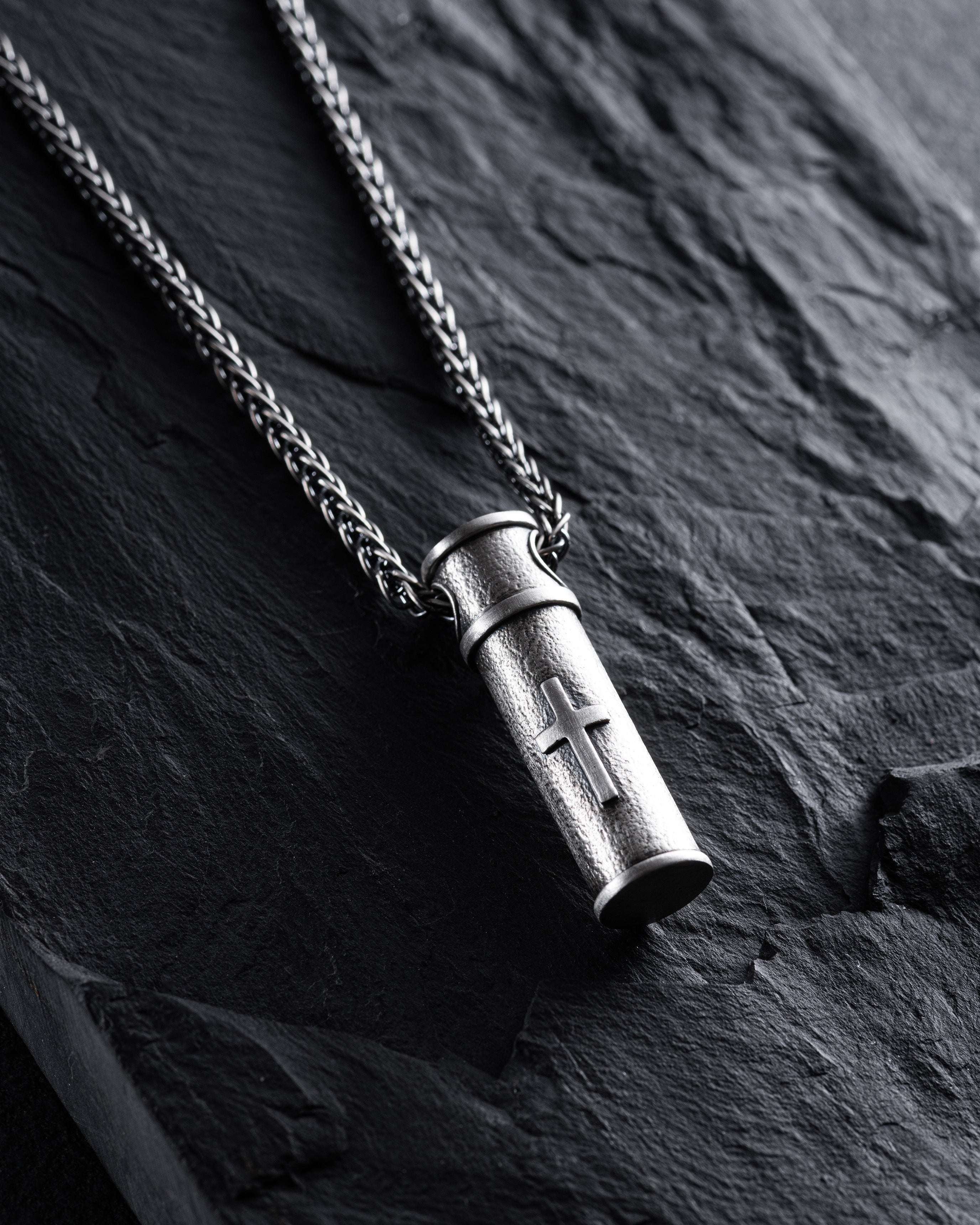 The silver pendant "Reliquary with the Cross" combines the symbolism of faith and a practical element for storing relics or sacred items. It unscrews from the bottom, allowing the placement of small relics, holy soil, or prayer notes inside. The engraved cross on it serves as a reminder of protection and blessing, turning the pendant not just into an ornament but into a talisman.