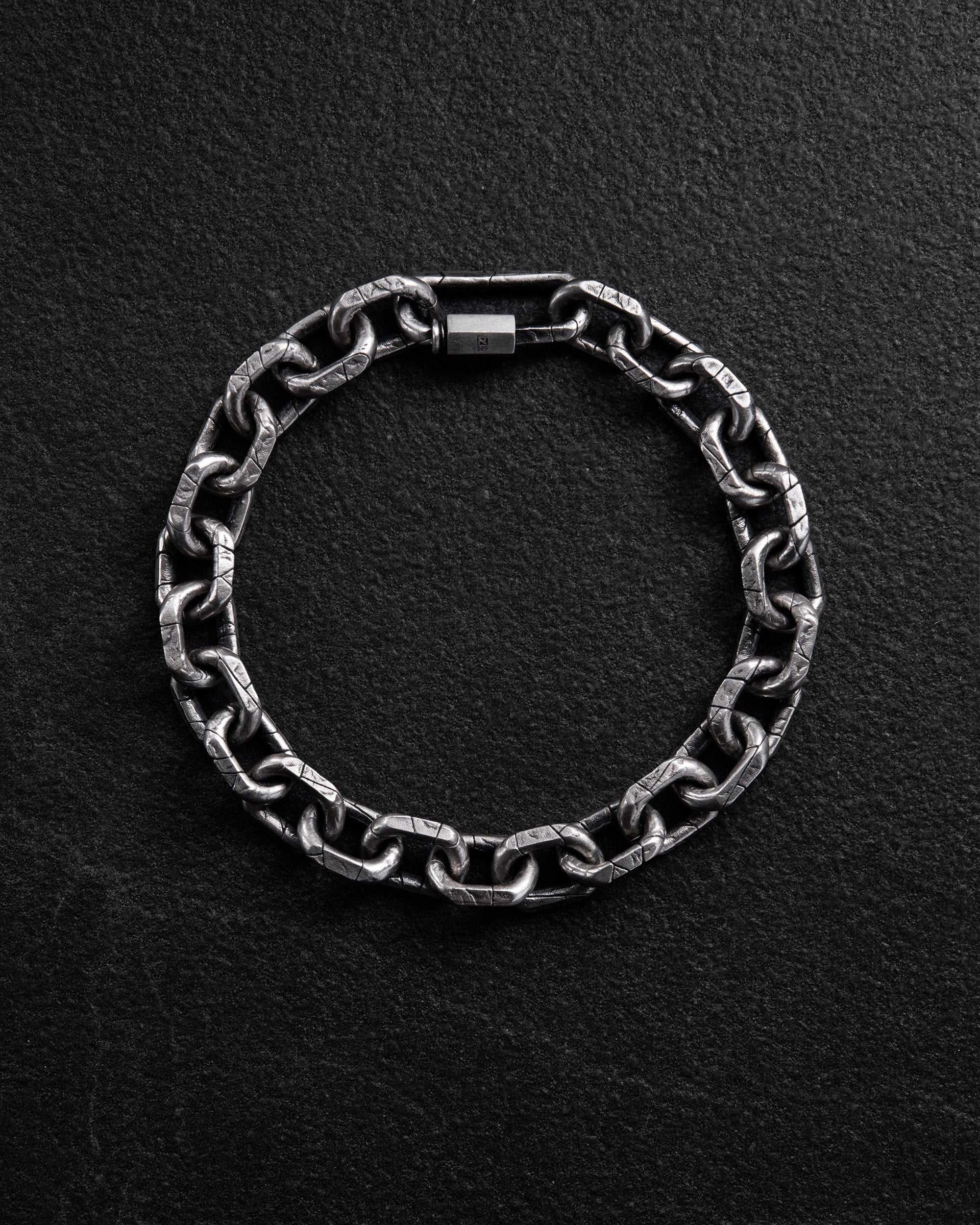 La texture de chaque maillon évoque les marques du temps sur le métal — comme ces moments qui restent à jamais gravés en nous, transformant l'imperfection en force.