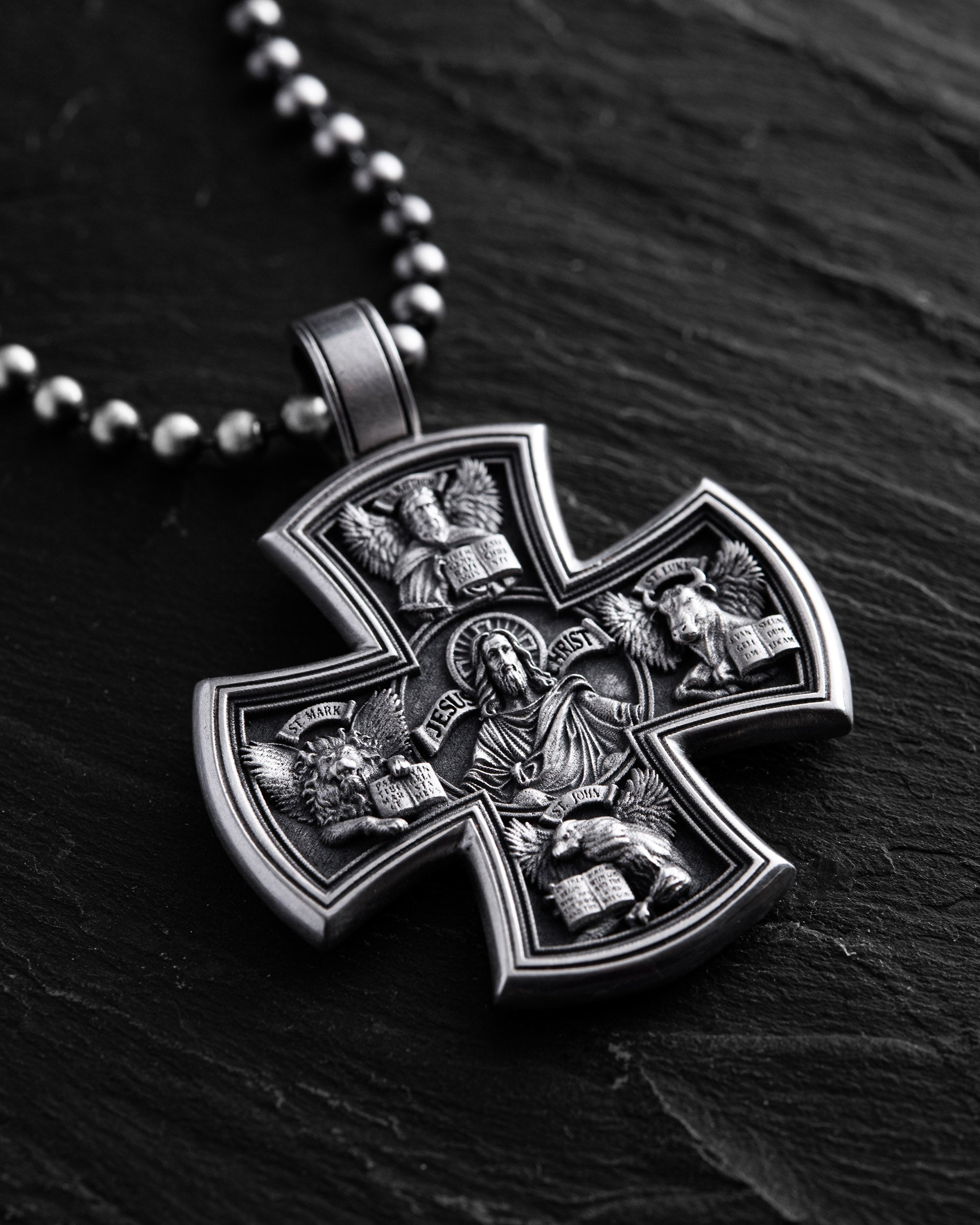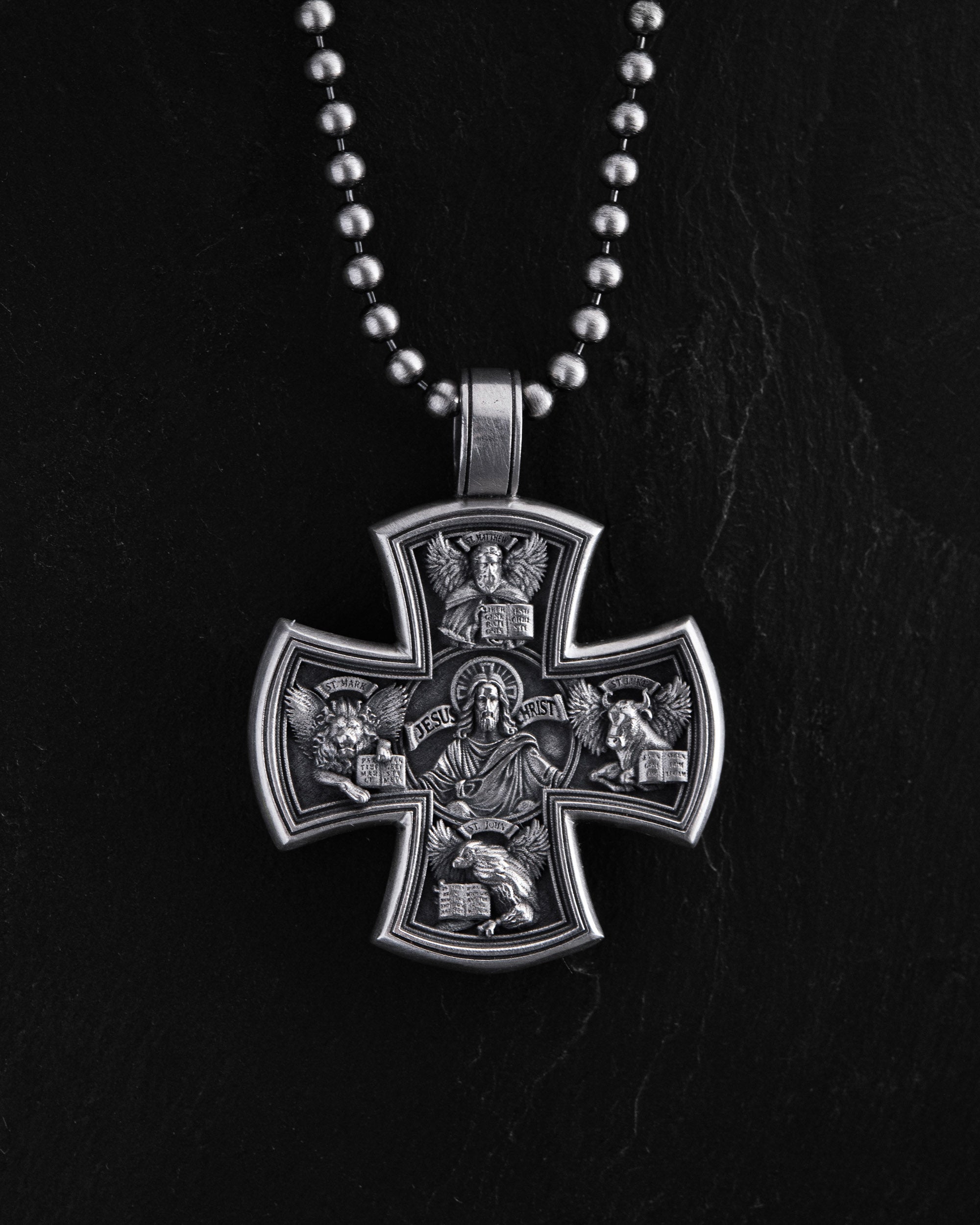 La croix en argent « MARC, LUC, JEAN ET LES QUATRE ÉVANGÉLISTES » est un symbole de foi, de direction spirituelle et de puissance de la Parole de Dieu. Elle est dédiée aux quatre évangélistes – Matthieu, Marc, Luc et Jean – qui ont apporté la Bonne Nouvelle du Christ au monde.