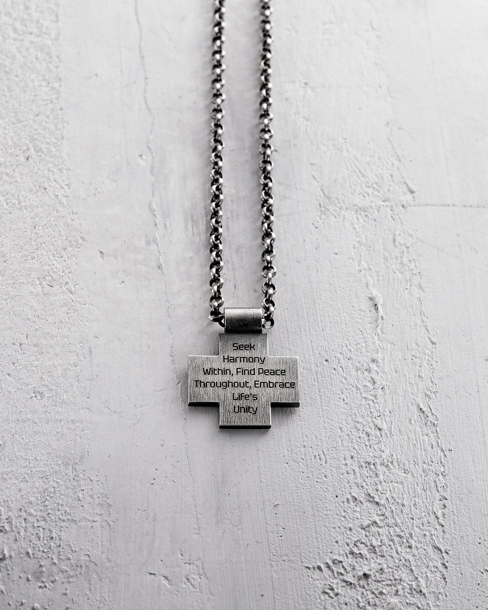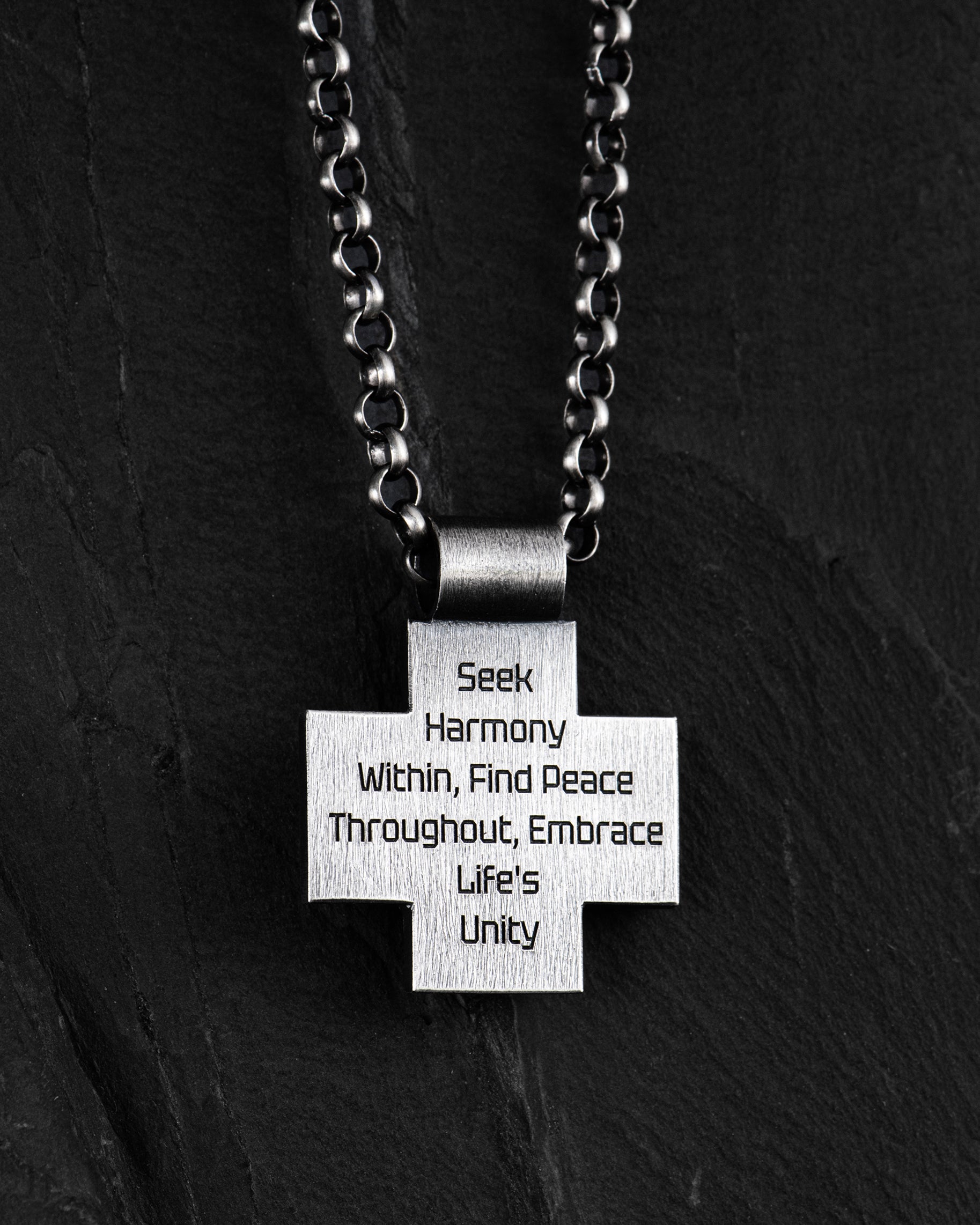 La croix d'argent « HARMONY » incarne la quête d'harmonie et de paix. Gravée sur la croix, la phrase « Rechercher l'harmonie intérieure, trouver la paix intérieure, embrasser l'unité de la vie » nous rappelle l'importance de trouver l'équilibre intérieur, clé de la paix et de l'unité extérieures.