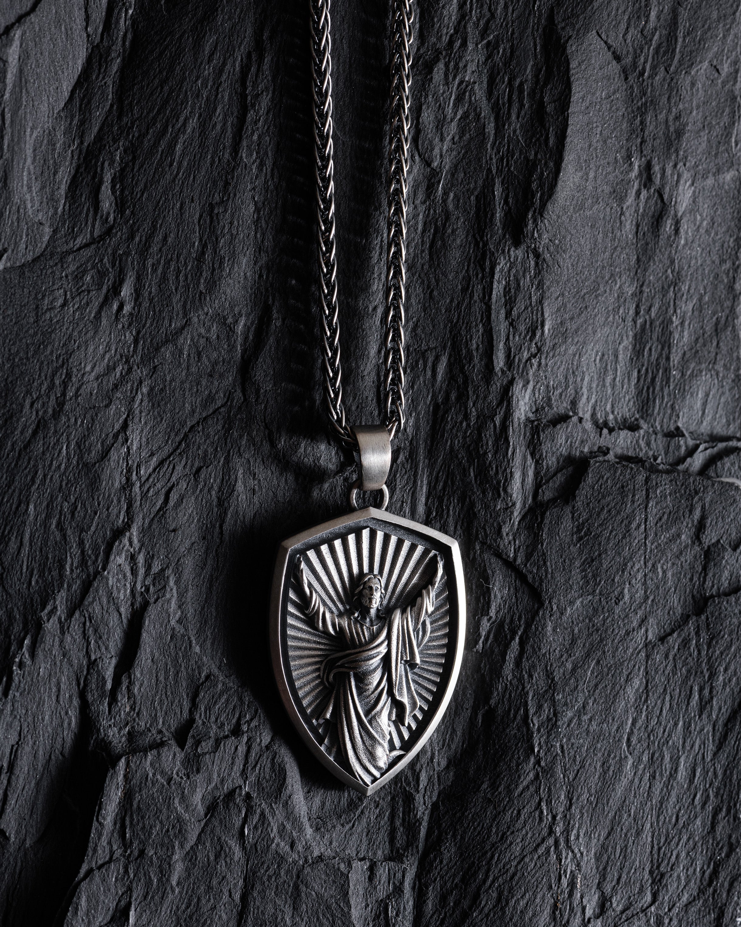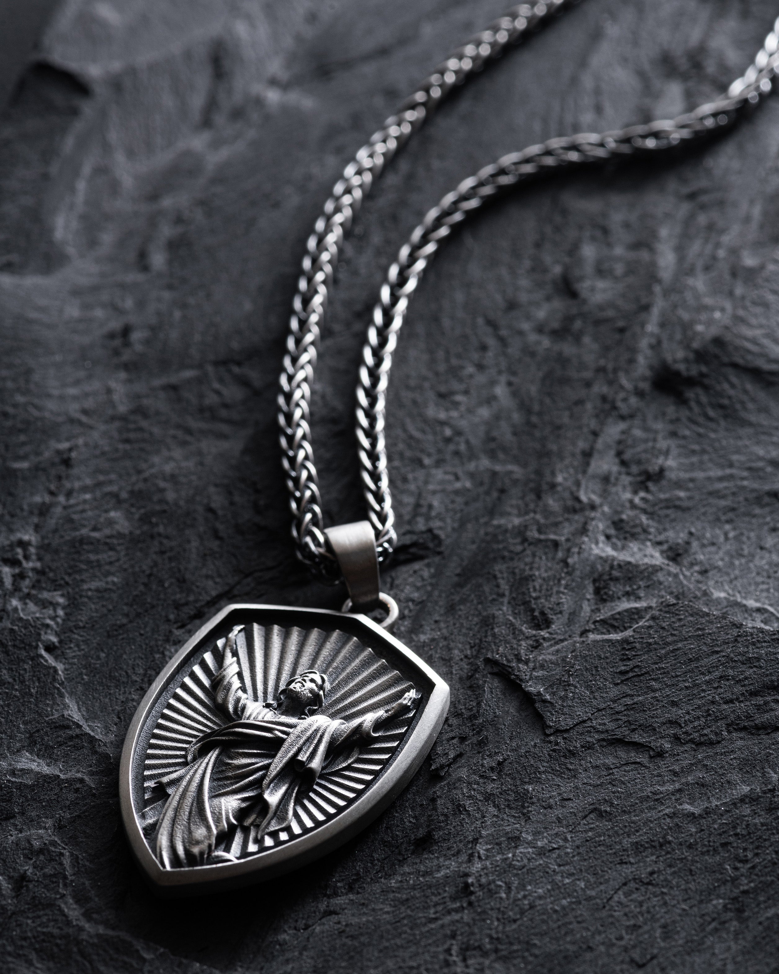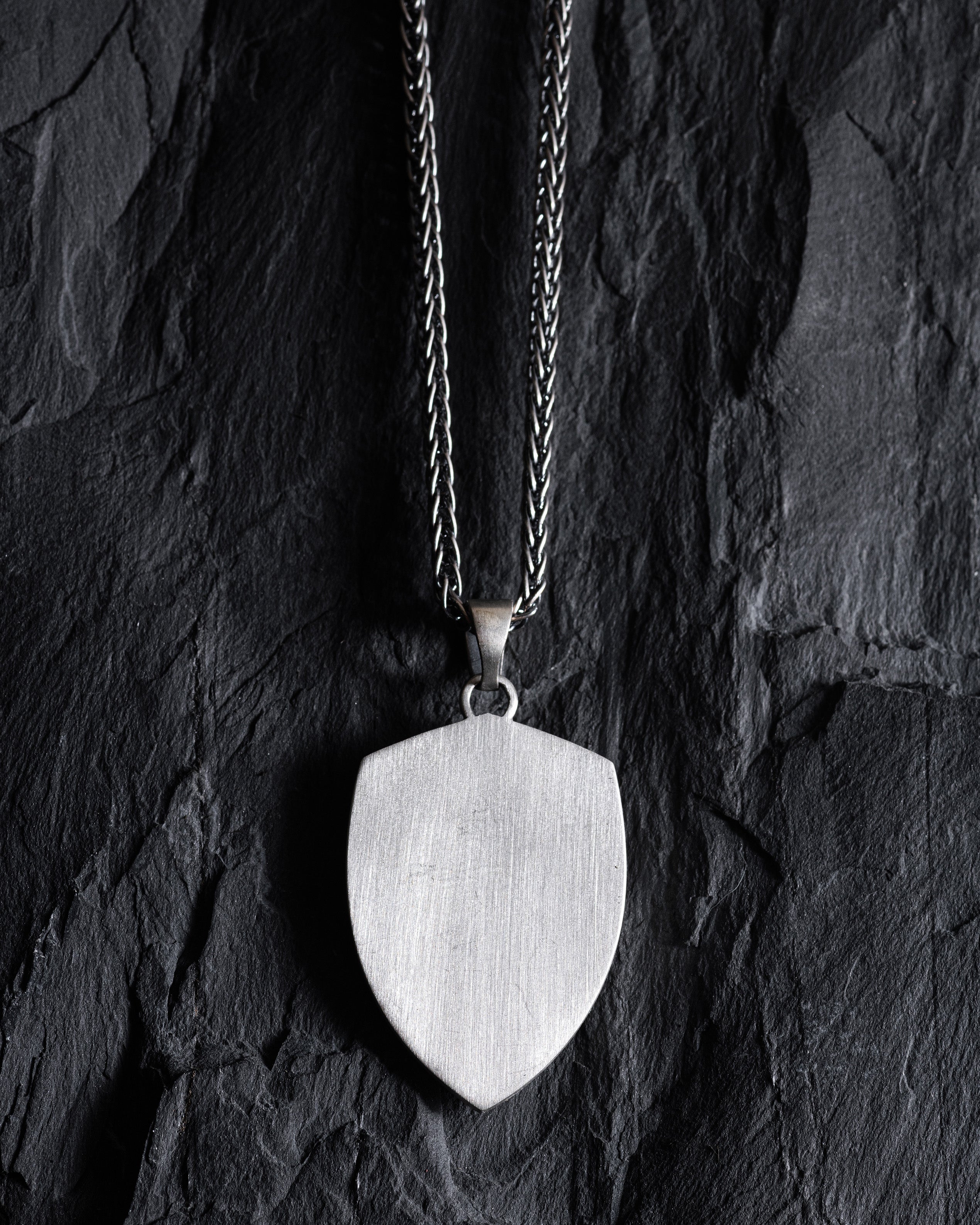 Le pendentif en argent en forme de bouclier, « ÉCLAIRCISSEMENT », symbolise la protection, la sagesse et l'éveil spirituel. Cet ornement incarne la quête de vérité et le désir d'harmonie entre les mondes spirituel et matériel.