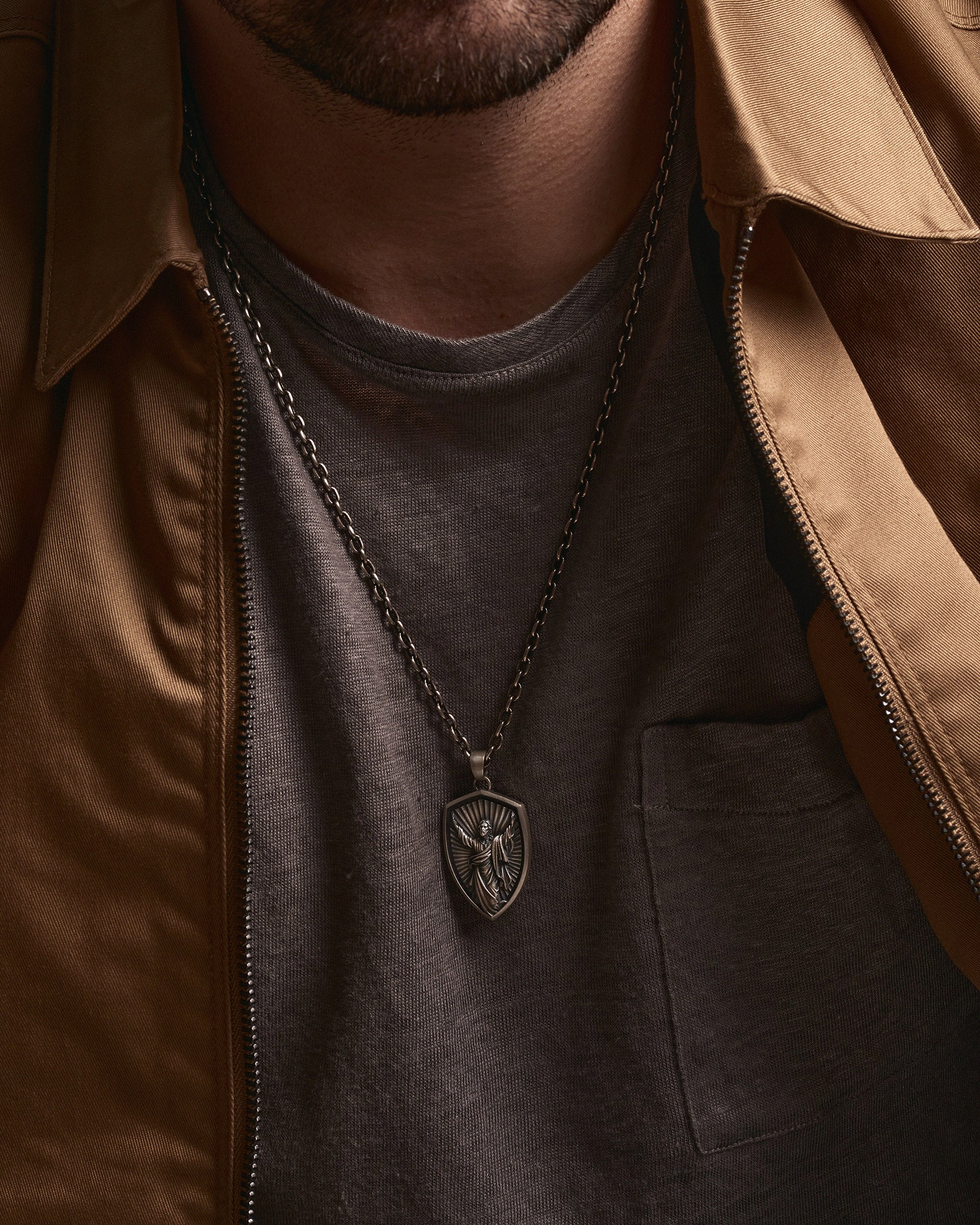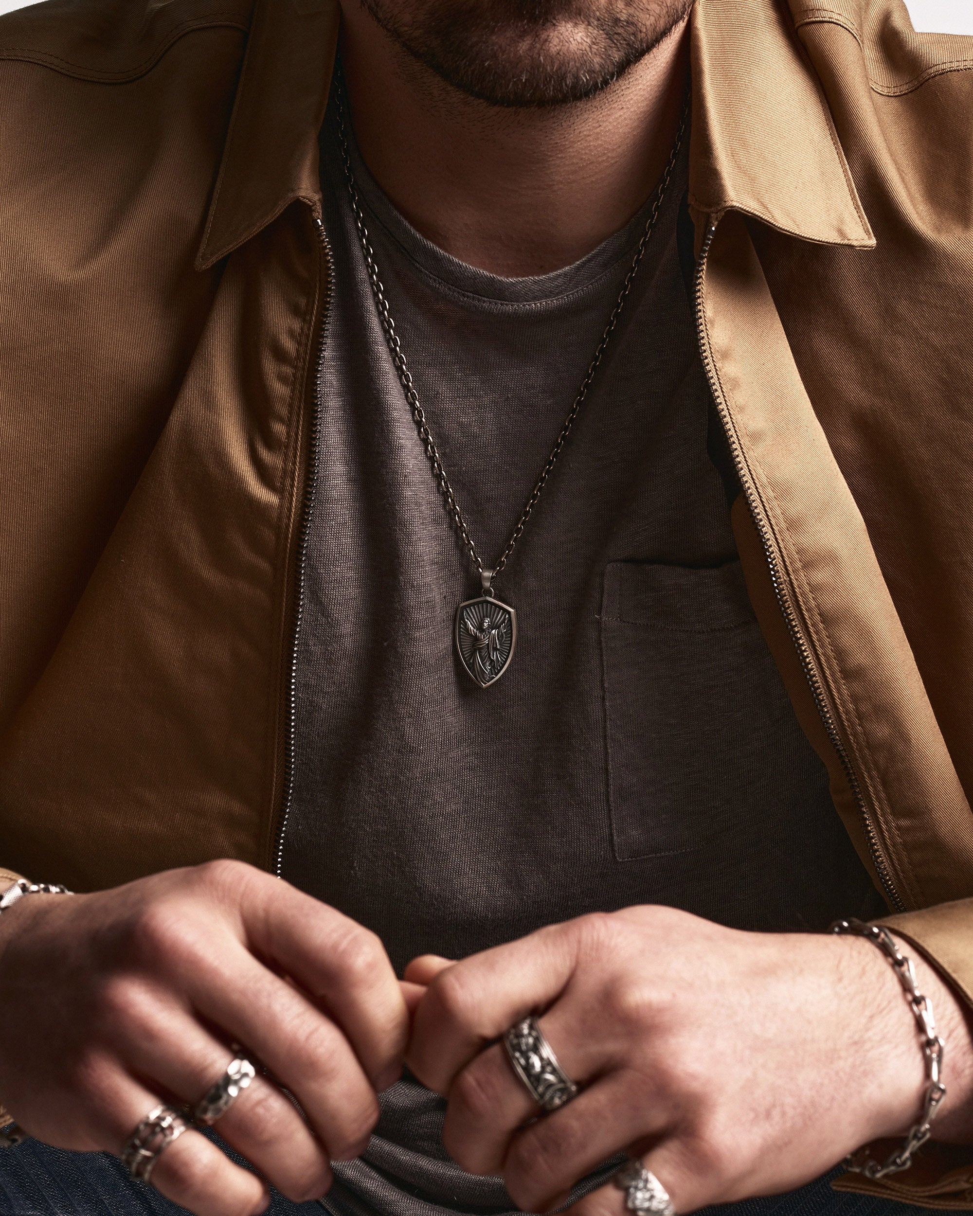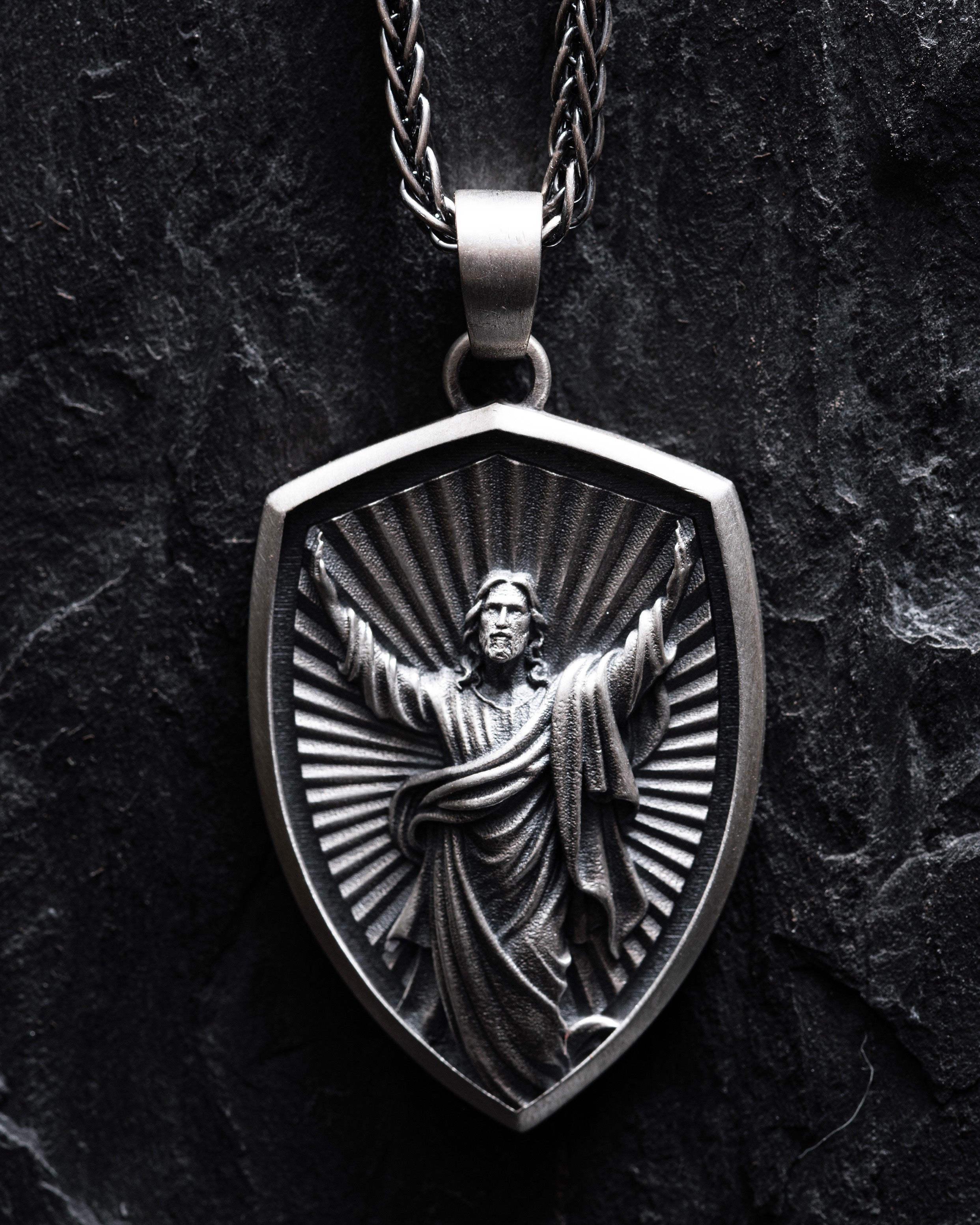 Le pendentif en argent en forme de bouclier, « ÉCLAIRCISSEMENT », symbolise la protection, la sagesse et l'éveil spirituel. Cet ornement incarne la quête de vérité et le désir d'harmonie entre les mondes spirituel et matériel.