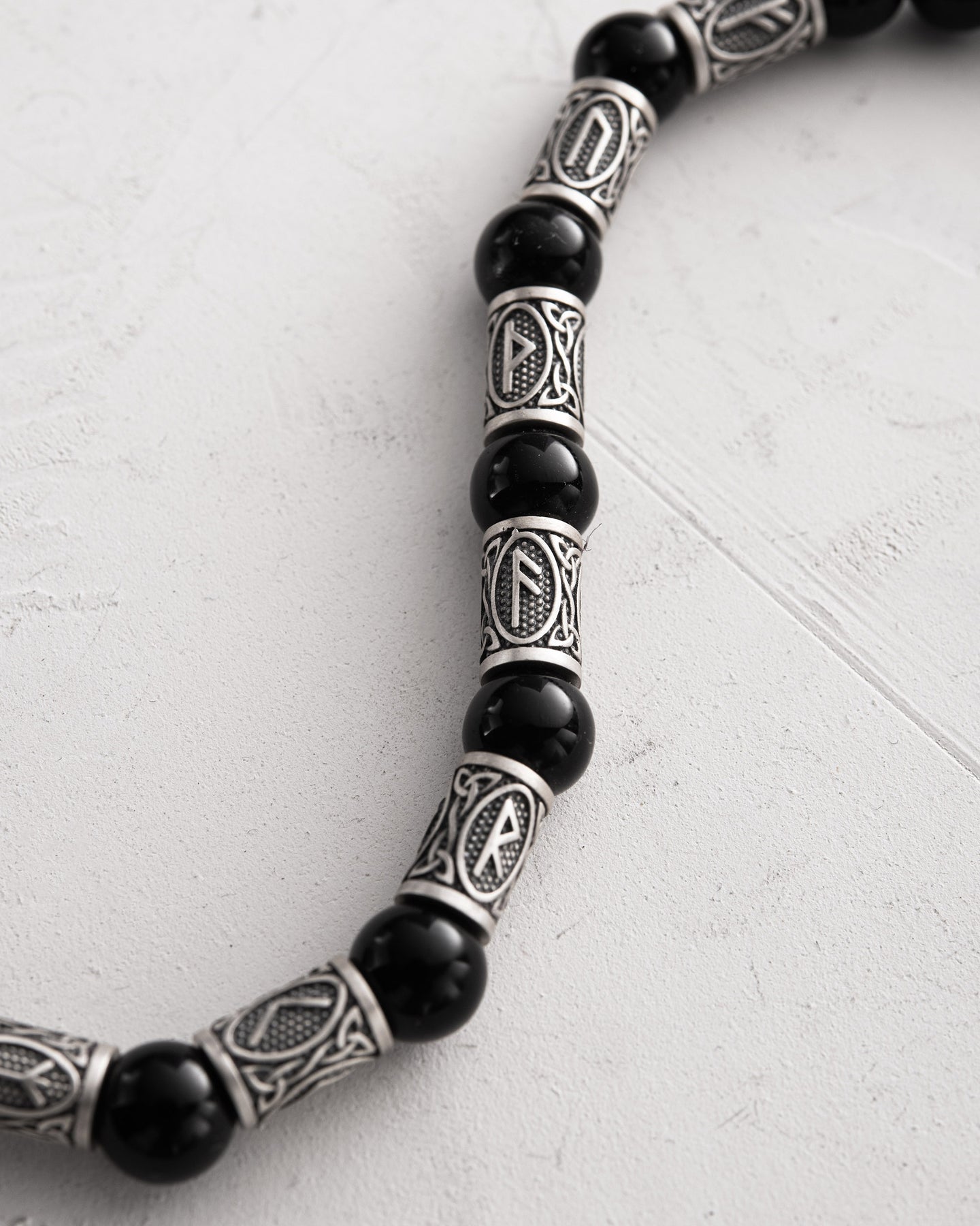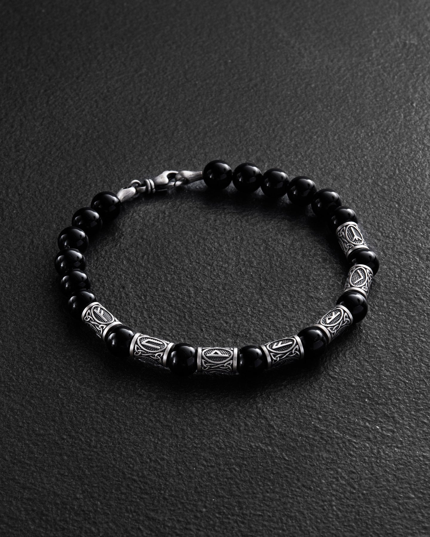Le bracelet homme RUNES en argent sterling allie une finition milanaise à l'onyx, alliant symbolisme ancien et style contemporain. Chaque rune gravée sur le bracelet est porteuse d'une signification profonde, offrant soutien, protection et énergie pour le développement personnel.