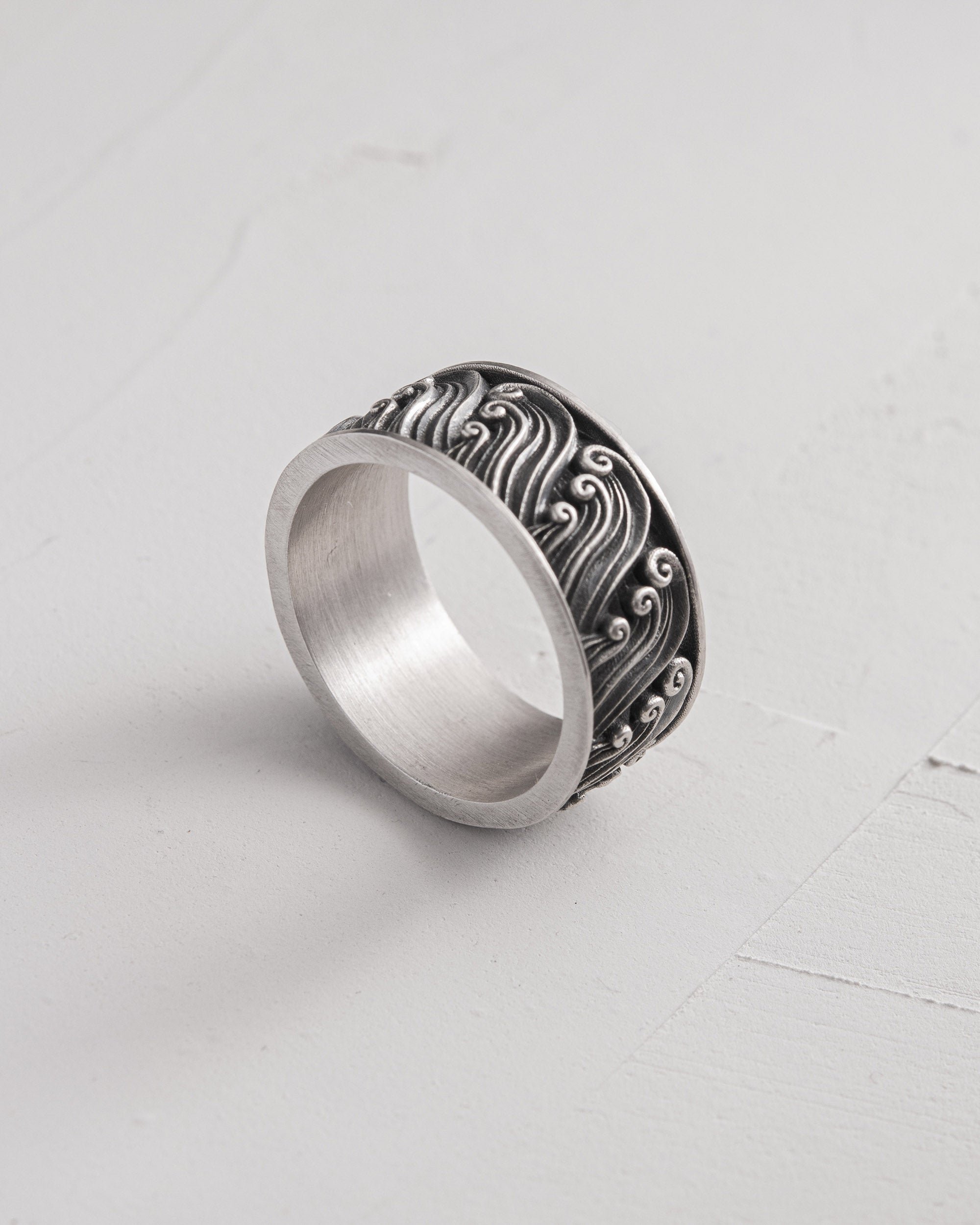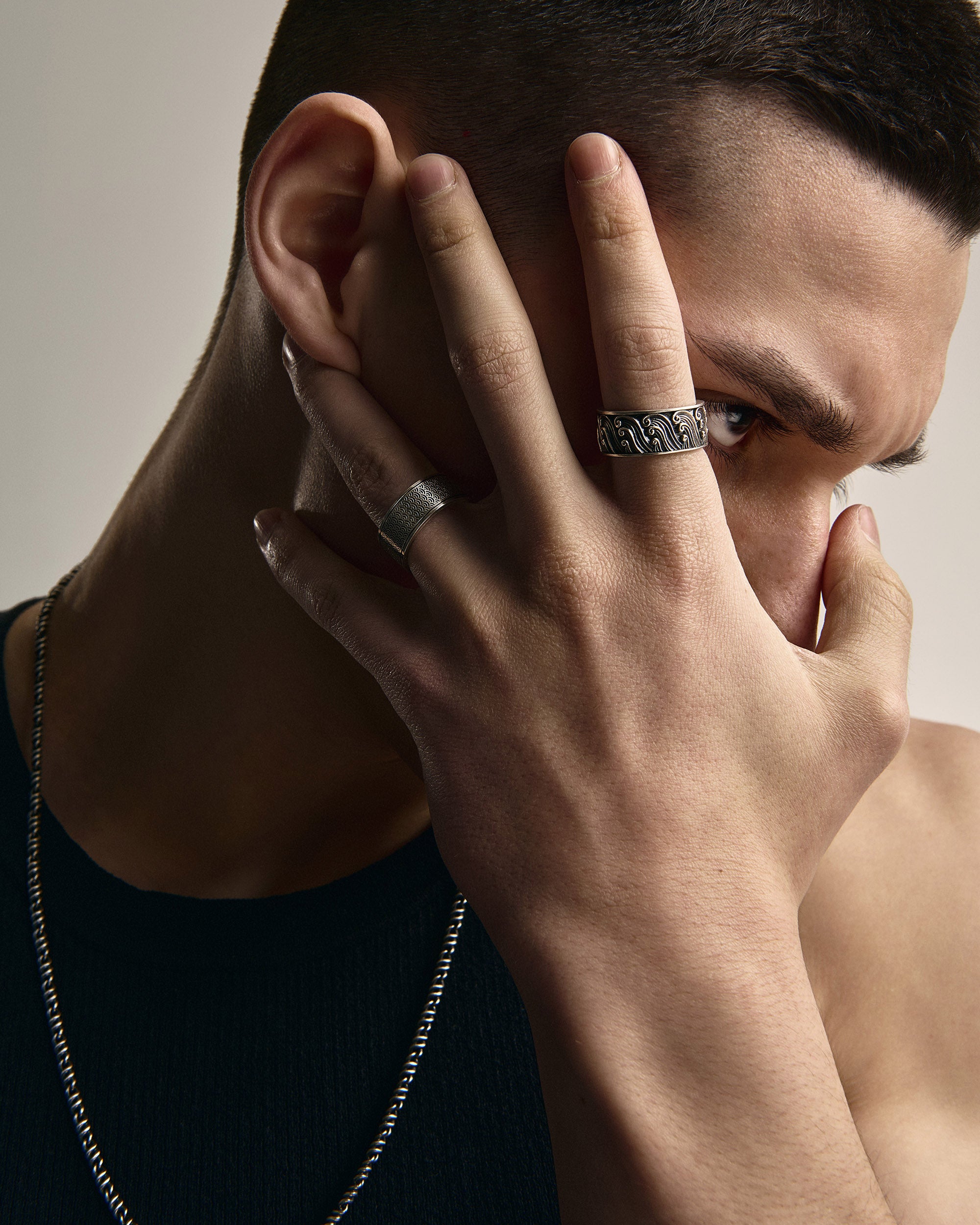 L'anello in argento GOLVEN incarna forza, movimento e calma interiore, ispirato all'estetica delle onde giapponesi. Il nome "GOLVEN", che significa "onde" in olandese, evidenzia la natura dinamica di questo pezzo. L'incisione, ispirata ai modelli tradizionali giapponesi, simboleggia i cicli della vita, la profondità emotiva e la capacità di adattarsi al cambiamento mantenendo l'equilibrio interiore. Questo anello è la scelta perfetta per gli uomini che uniscono determinazione e armonia e vanno avanti con sicurezza, come un'onda attraverso tutte le cose.