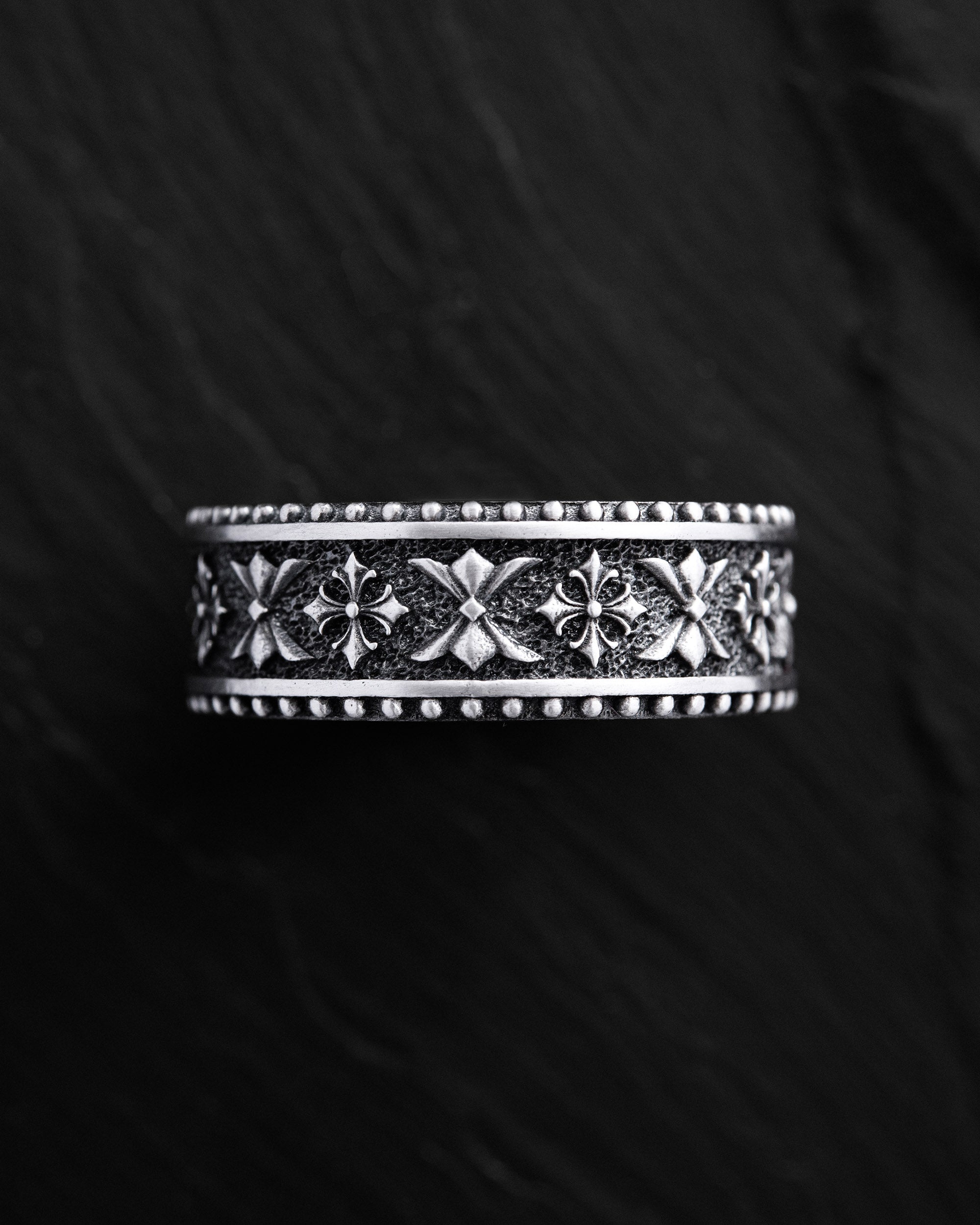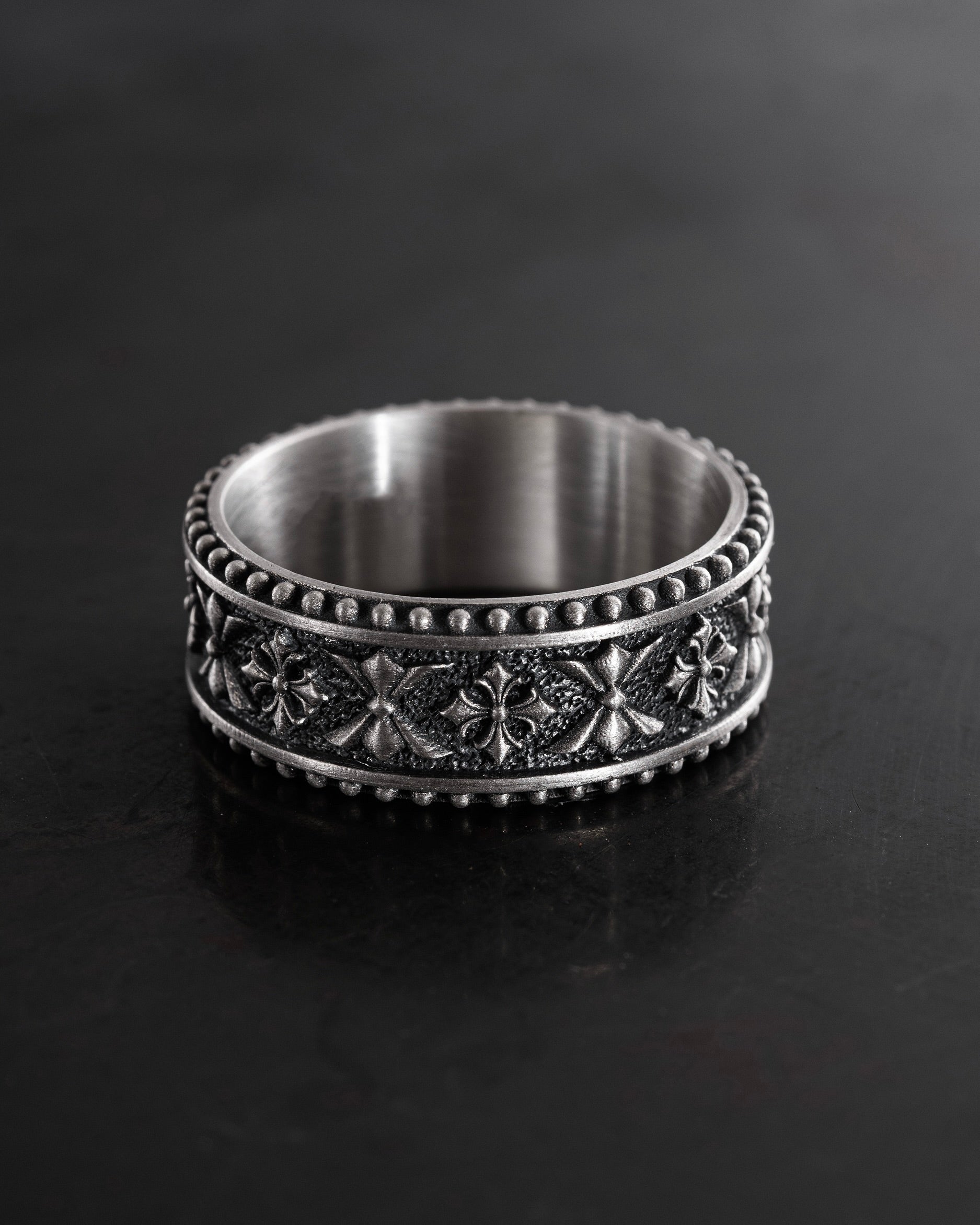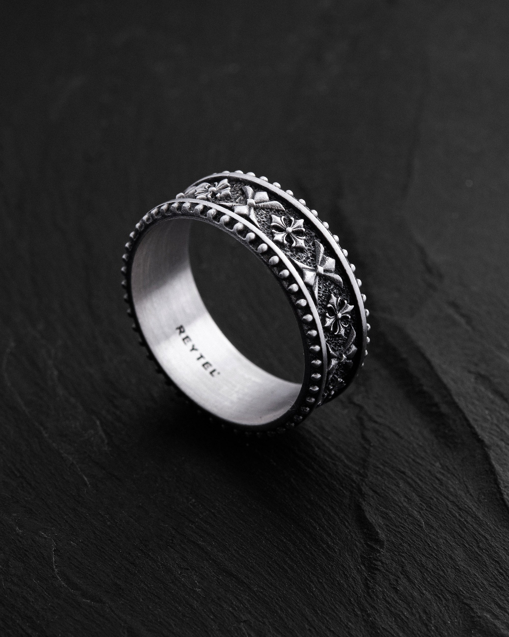 L'anello in argento CELTIC KNIGHT PATTERN è un pezzo che combina il simbolismo della forza, dell'onore e dell'eredità spirituale. L'ornamento in rilievo con motivi celtici evoca l'immagine di guerrieri che difendevano non solo la terra, ma anche i valori: lealtà, coraggio e saggezza. I motivi ripetuti formano un cerchio continuo, a simboleggiare la forza dello spirito sempre presente nel cuore di un uomo. Ogni dettaglio è come una parte di uno scudo, a guardia di chi lo indossa.