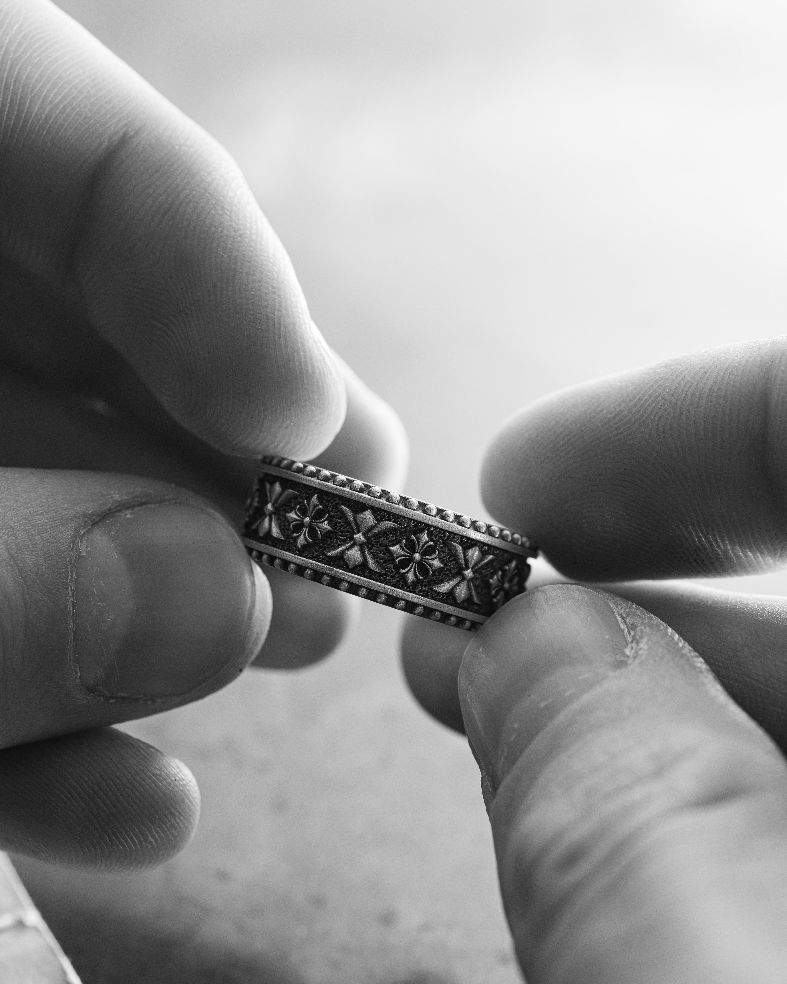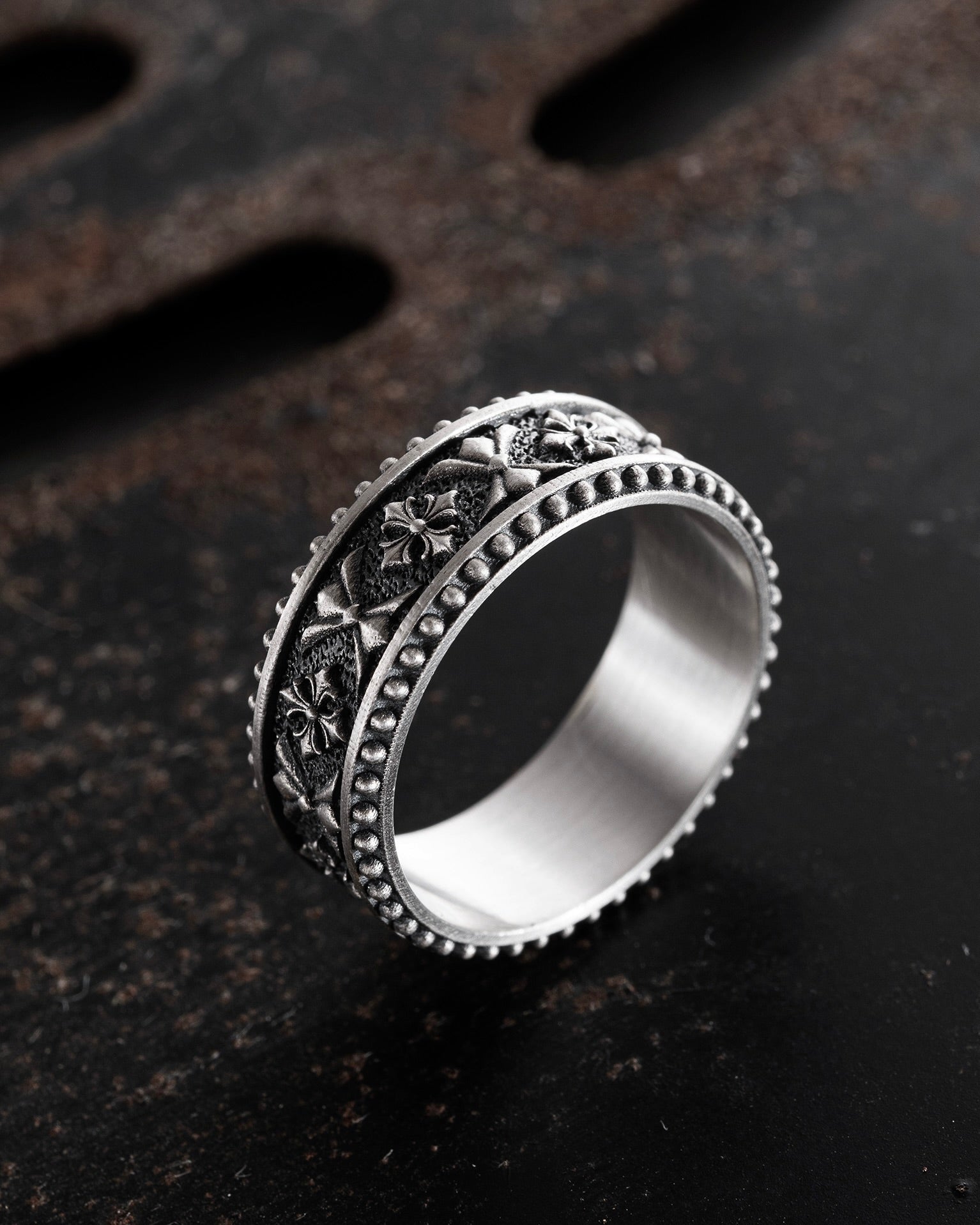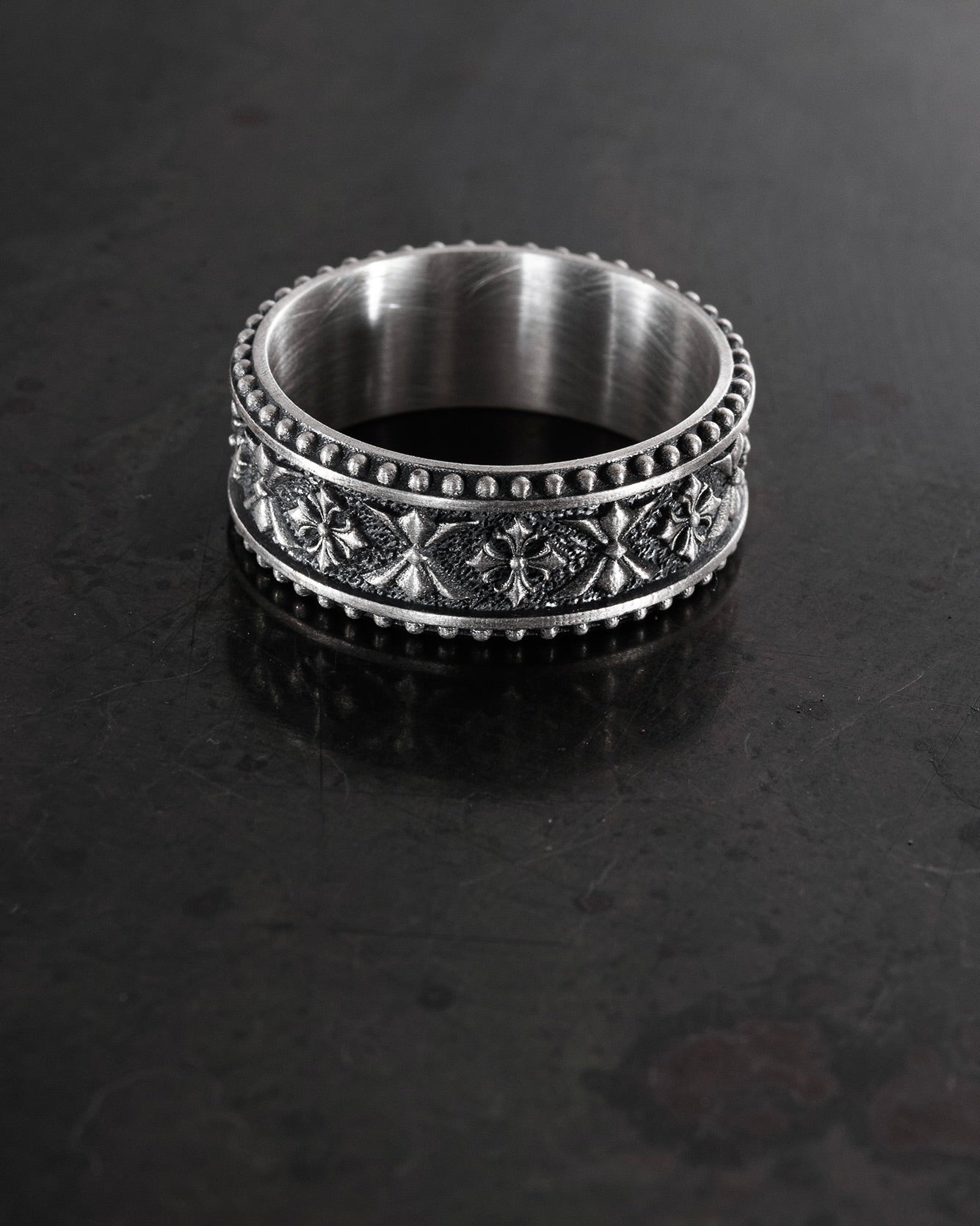L'anello in argento CELTIC KNIGHT PATTERN è un pezzo che combina il simbolismo della forza, dell'onore e dell'eredità spirituale. L'ornamento in rilievo con motivi celtici evoca l'immagine di guerrieri che difendevano non solo la terra, ma anche i valori: lealtà, coraggio e saggezza. I motivi ripetuti formano un cerchio continuo, a simboleggiare la forza dello spirito sempre presente nel cuore di un uomo. Ogni dettaglio è come una parte di uno scudo, a guardia di chi lo indossa.