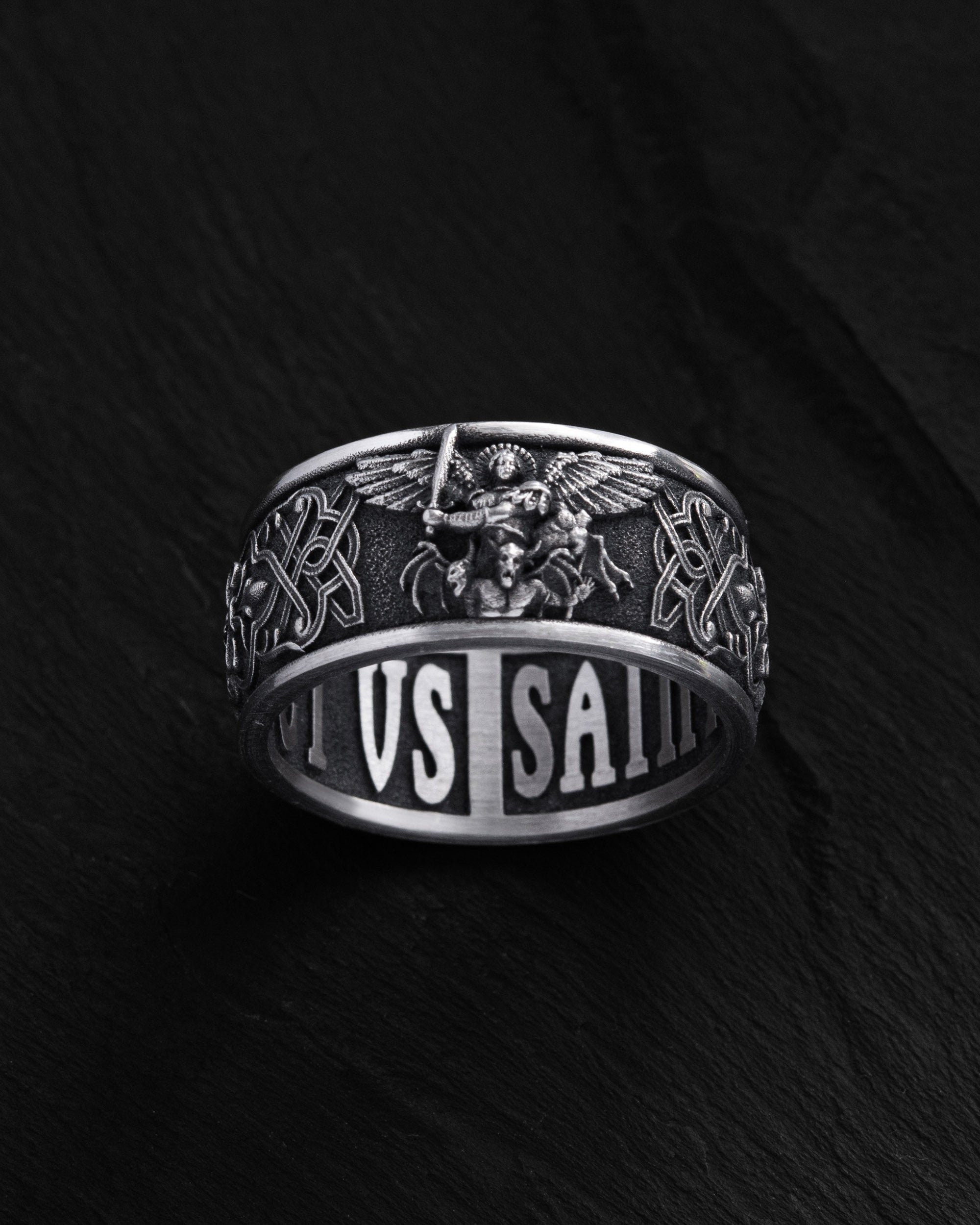 L'incisione interna SAINT MICHAEL PROTECT US conferisce all'anello un profondo significato personale, come una preghiera rivolta a un guardiano celeste. Questo è più di un semplice accessorio: è un'armatura per l'anima. Per un uomo che sta dalla parte della luce e non teme alcuna battaglia.
