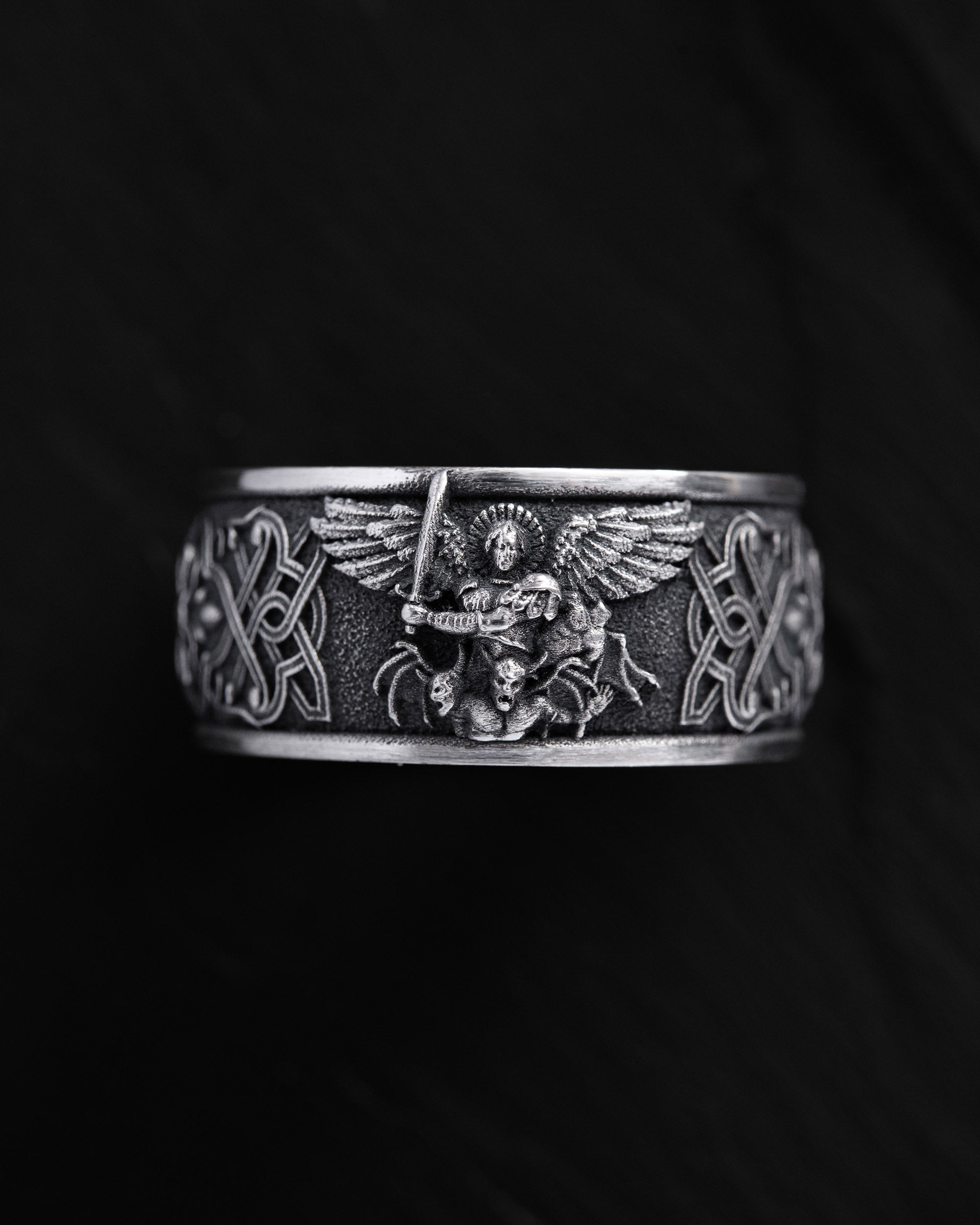 L'anello in argento SAN MICHELE è un pezzo simbolico dedicato all'Arcangelo Michele, il guerriero della luce, protettore del bene e della giustizia. L'immagine in rilievo dell'Arcangelo con la spada in piedi sul male sconfitto incarna il trionfo dello spirito, della fede e della forza sull'oscurità.