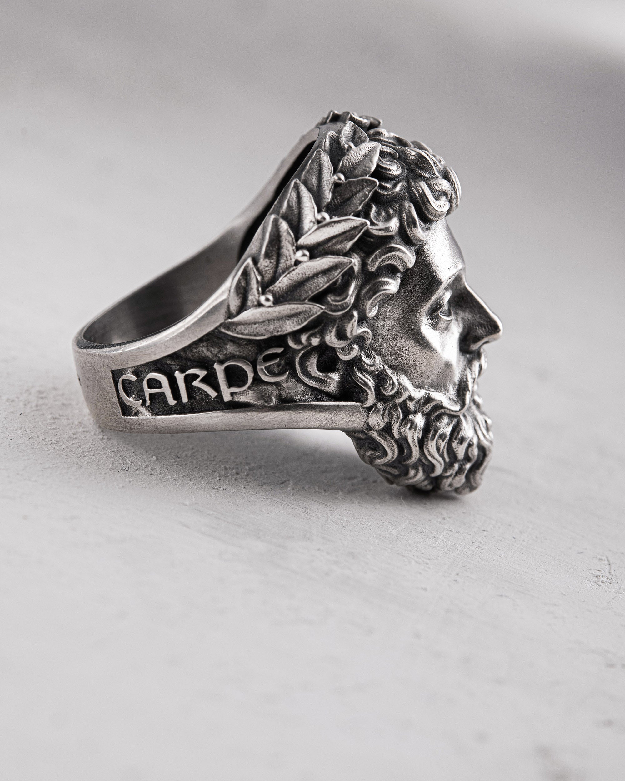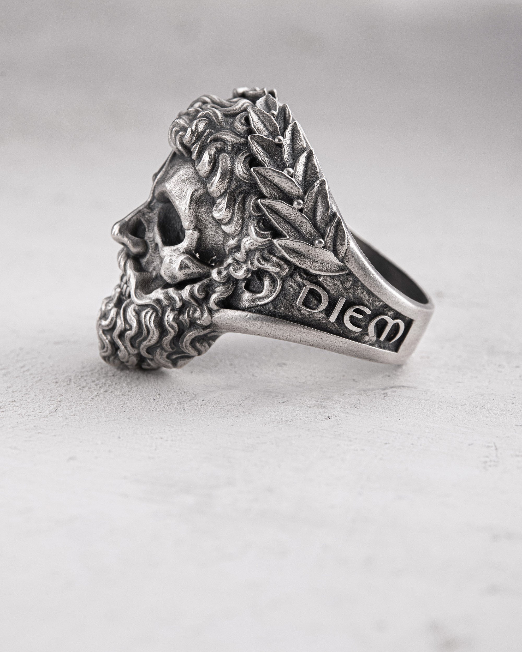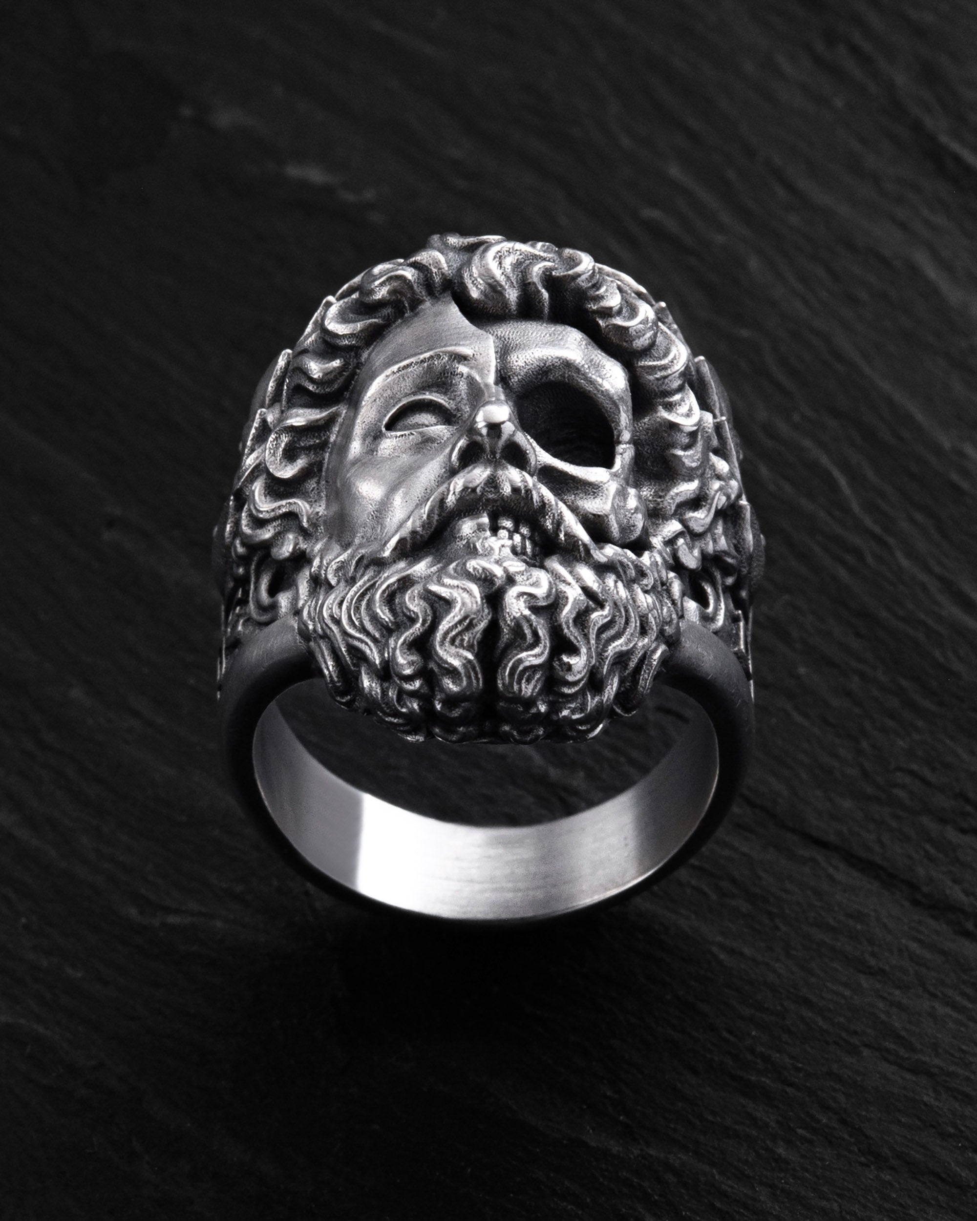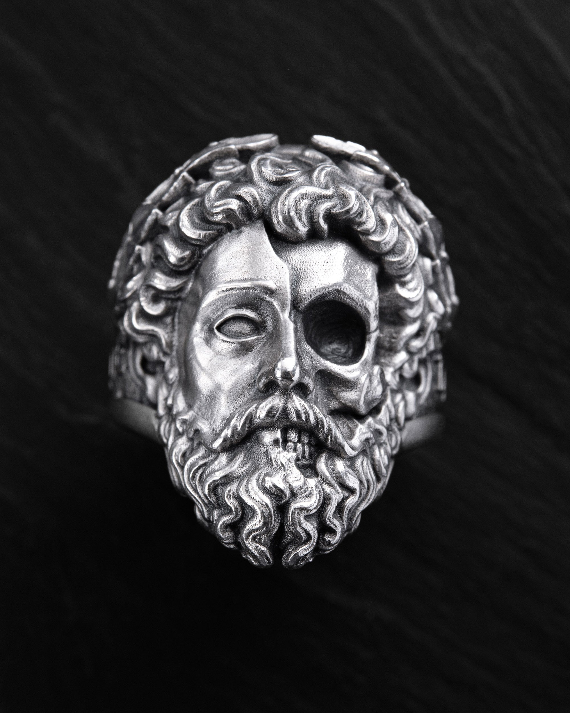 L'anello in argento "ZEUS. MEMENTO MORI" è una combinazione unica di potere divino e ricordo della caducità della vita. L'immagine di Zeus, il dio supremo dell'antico pantheon greco, incarna la forza, l'autorità e l'ordine nel mondo. Il suo maestoso volto è diviso in due metà: da un lato rappresenta la grandezza e l'immortalità, dall'altro un teschio, che simboleggia l'inevitabilità del tempo e della mortalità.