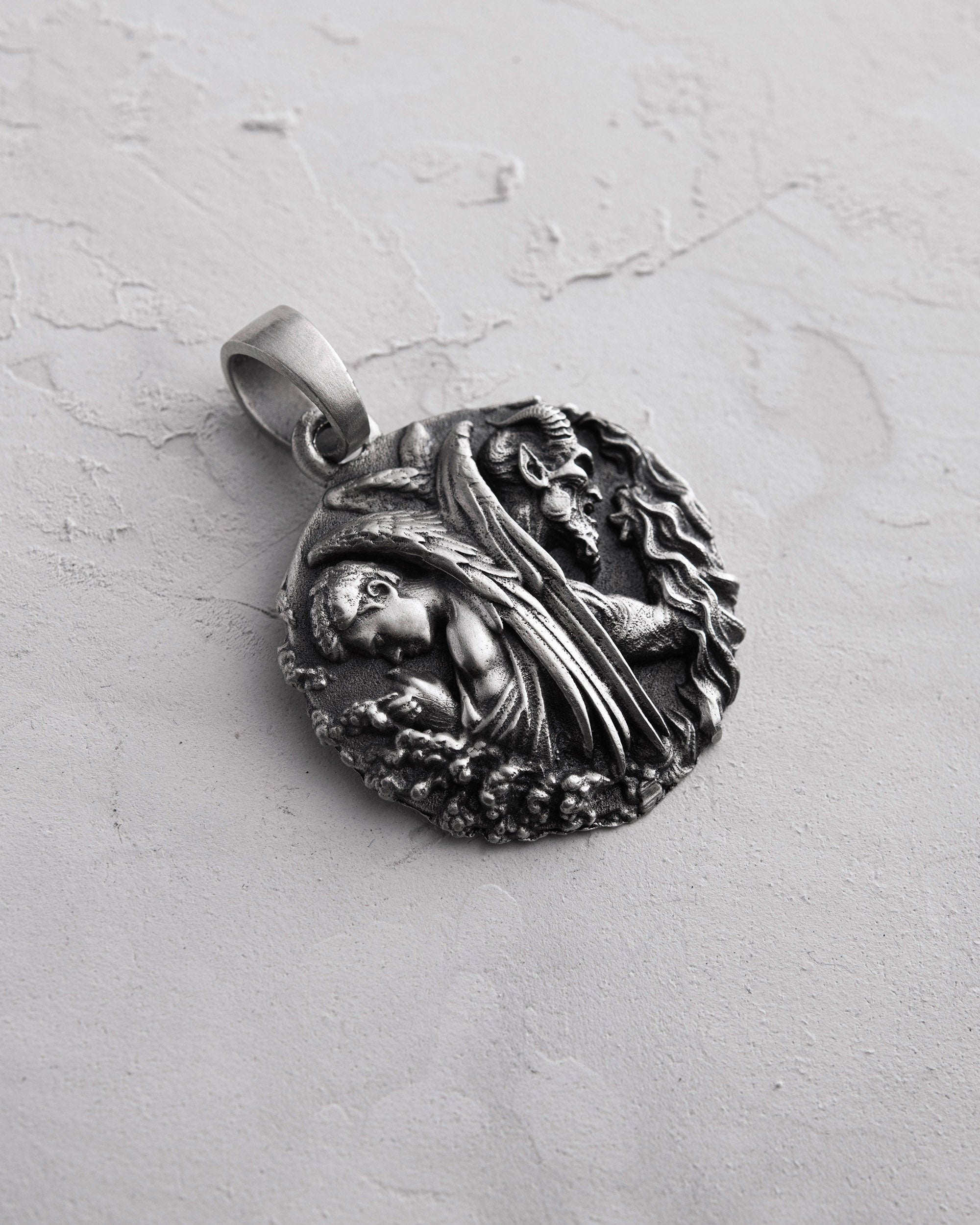 Questo ciondolo raffigura l'eterna opposizione tra luce e ombra, bene e male, forze che esistono dentro ognuno di noi. L'angelo simboleggia la purezza, la forza morale e l'aspirazione verso qualcosa di più alto, mentre il demone rappresenta la tentazione interiore, la lotta con la debolezza e i confini della natura umana. La loro presenza insieme su un medaglione non è una coincidenza, ma ricorda che l'armonia è possibile solo attraverso l'equilibrio.