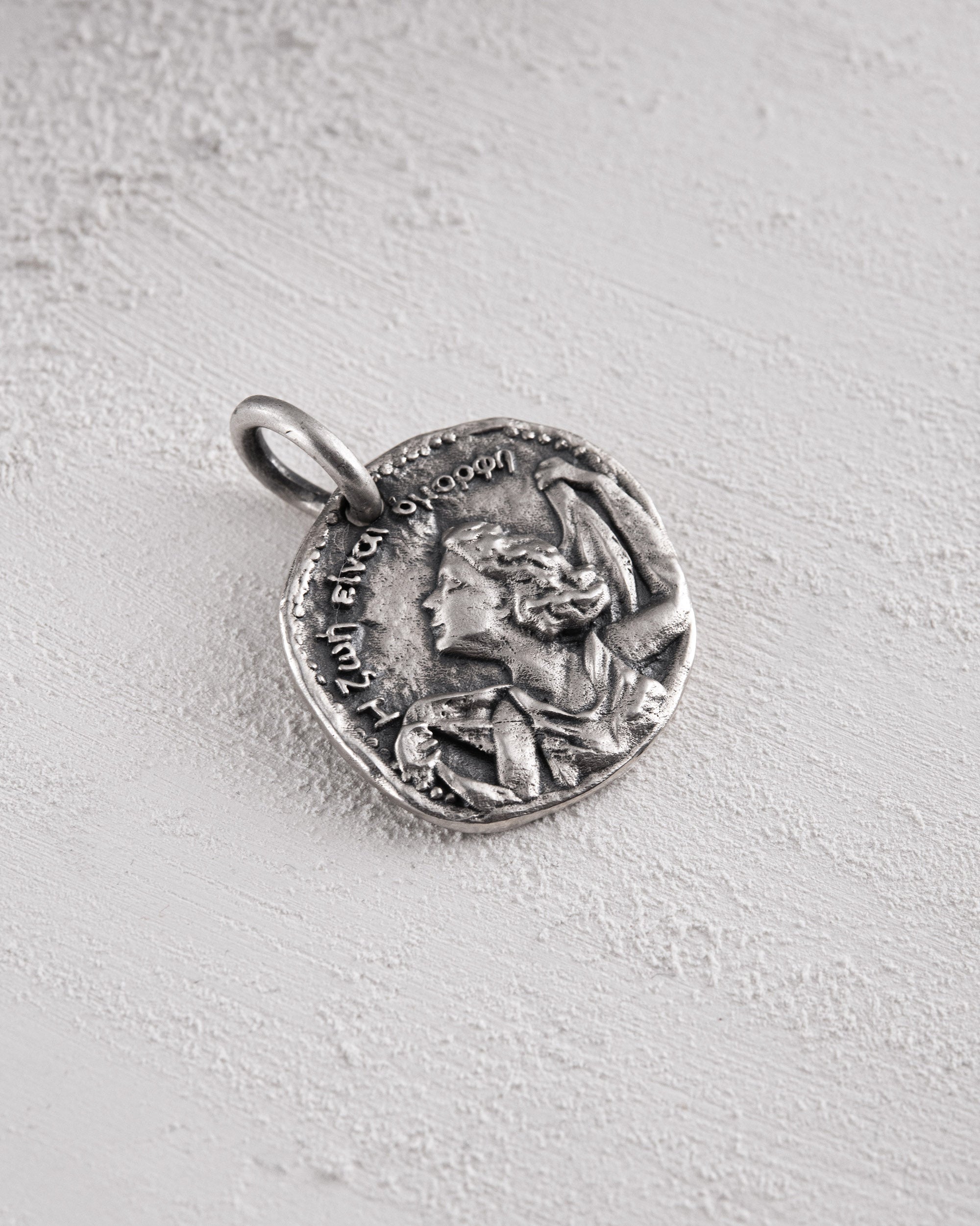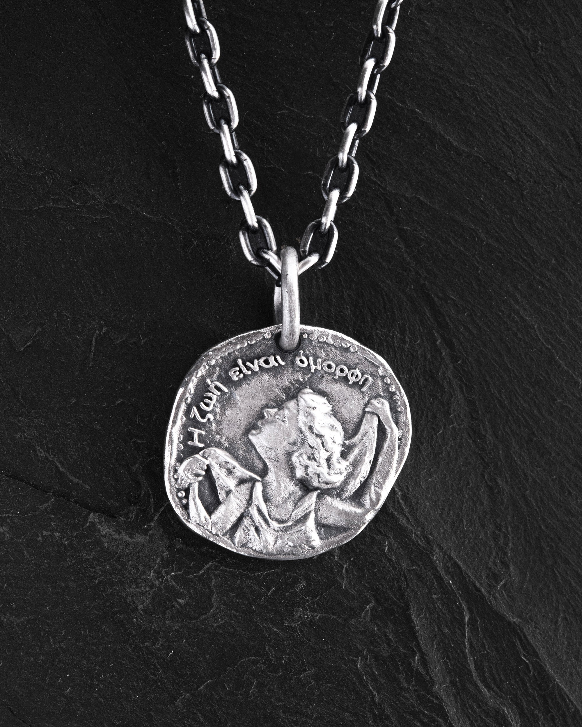 Il ciondolo in argento "Η ζωή είναι όμορφη" (tradotto dal greco come "La vita è bella") è un raffinato simbolo di ispirazione, armonia e arte. Il design si ispira alle antiche monete greche che immortalavano scene culturali e mitologiche significative.