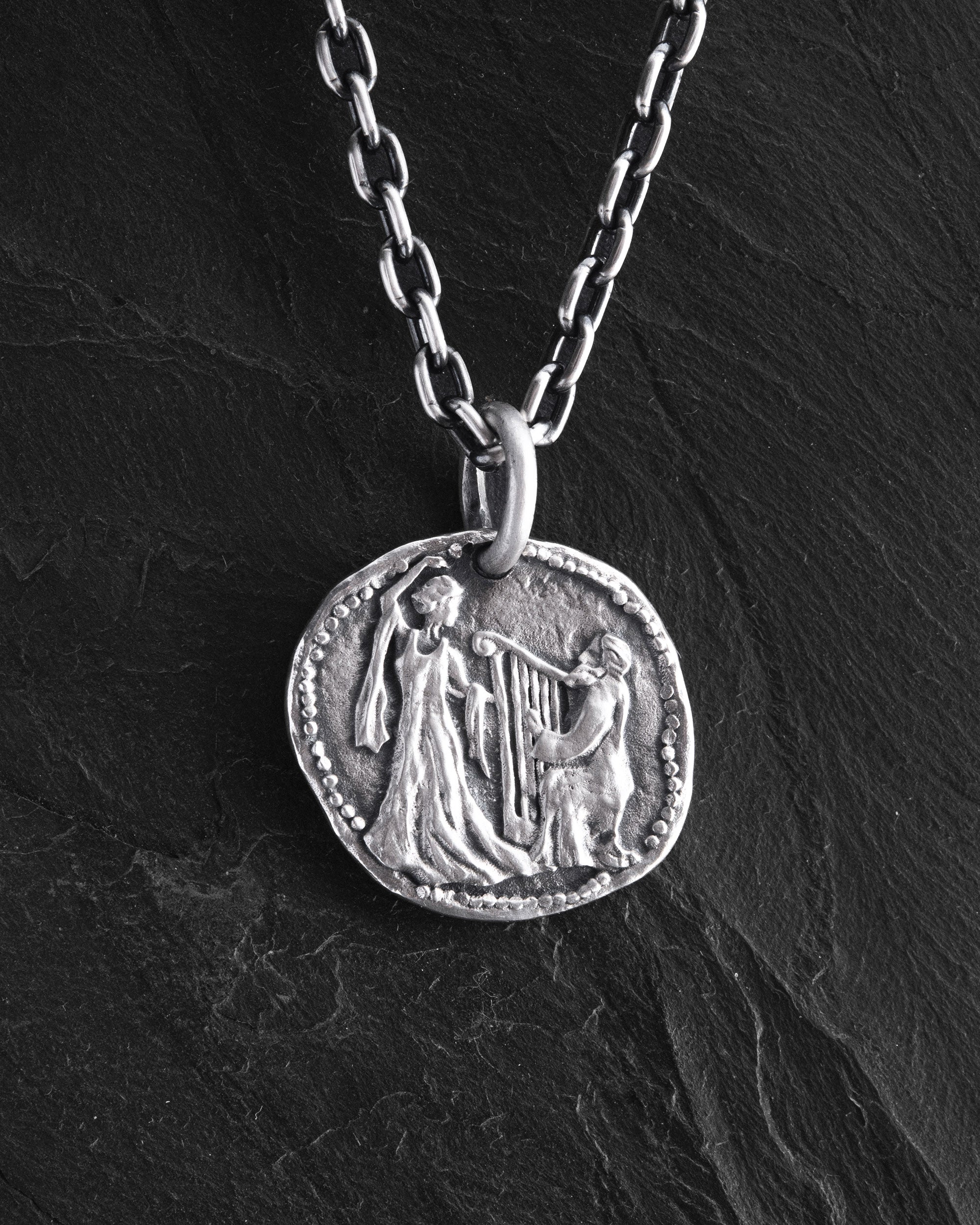 Su un lato del pendente, una donna che danza simboleggia la libertà, la gioia e l'energia della vita. Dall'altro, un musicista con l'arpa rappresenta l'arte, la creatività e l'armonia dell'anima. Queste due immagini si fondono, ricordandoci che la vita è una danza tra le emozioni e la melodia del cuore.