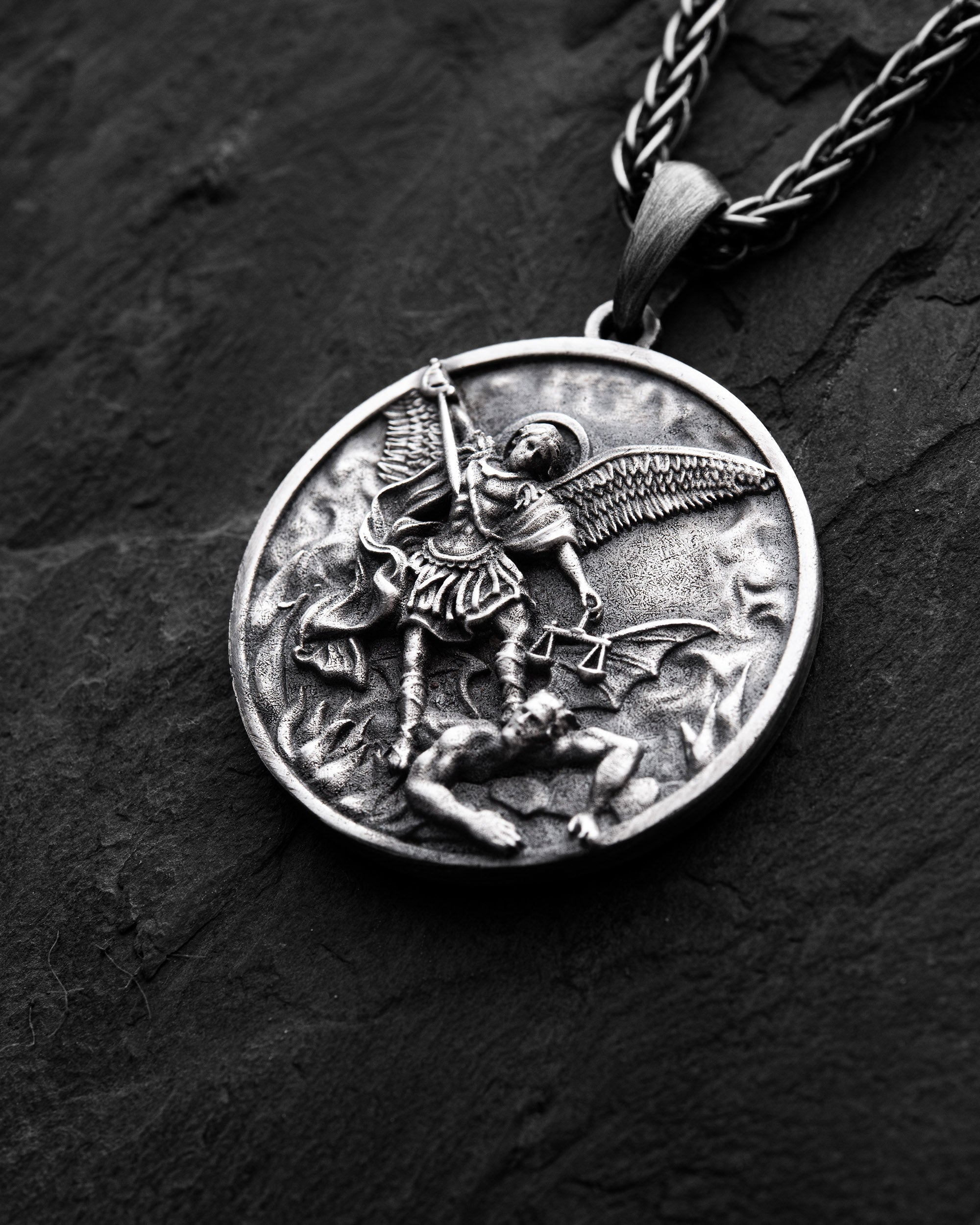 Il ciondolo in argento "SAN MICHELE" è un accessorio da uomo che simboleggia forza, protezione e determinazione. San Michele, conosciuto come l'arcangelo guerriero, rappresenta un protettore celeste che lotta contro il male e l'ingiustizia. Questo ciondolo serve a ricordare l'importanza del coraggio, della fede e del coraggio nel superare le sfide della vita. Scegliendo il ciondolo "SAN MICHELE", un uomo esprime la sua disponibilità a difendere i propri valori e a lottare per la giustizia con incrollabile determinazione. Questo accessorio diventa simbolo di forza interiore e sostegno spirituale.
