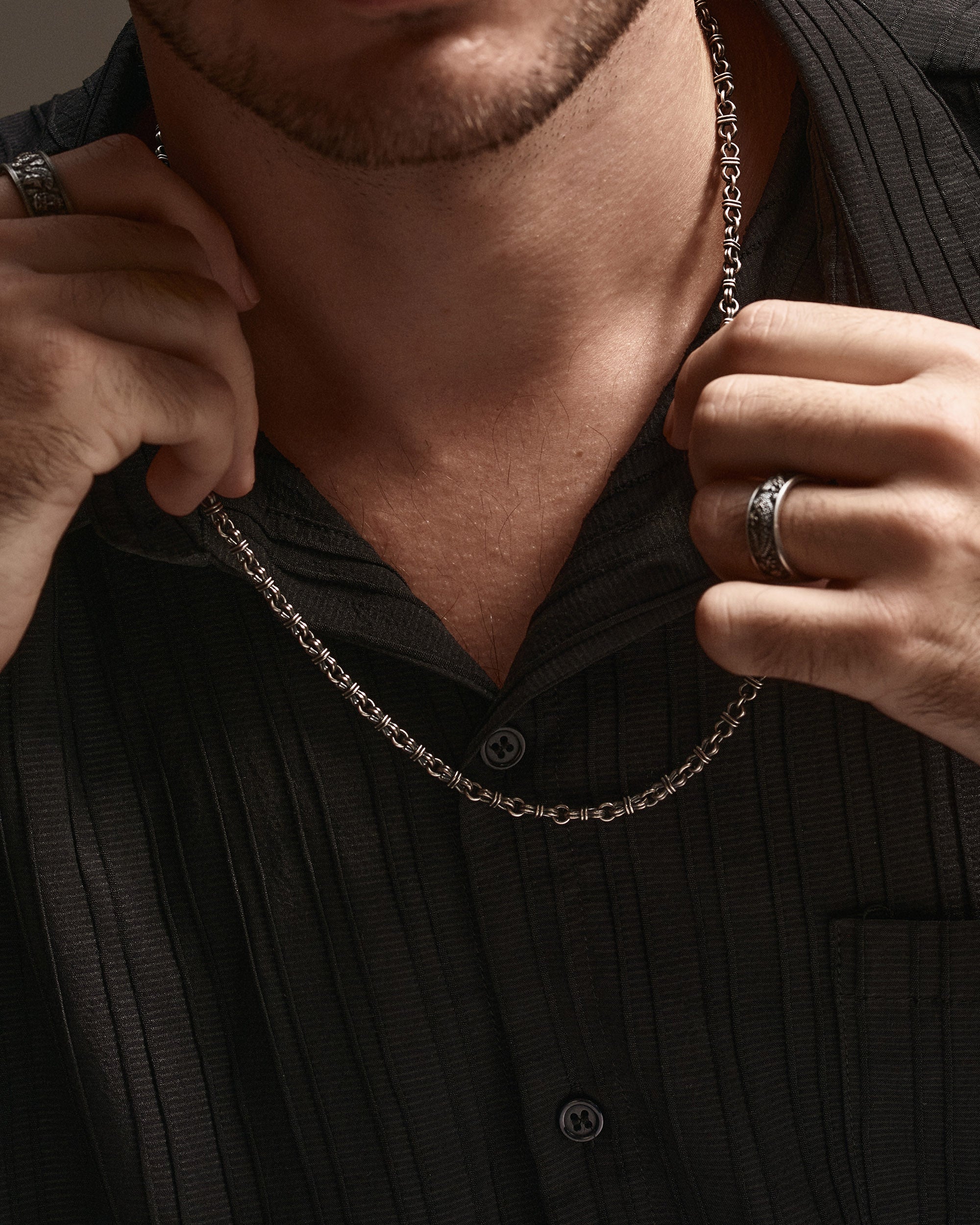 Catena TAU in Argento – un’audace dichiarazione di forza e raffinatezza. Progettata per gli uomini che apprezzano sia la durabilità che l'eleganza, questa catena in argento sterling fonde perfettamente l'artigianato classico con l'estetica moderna.