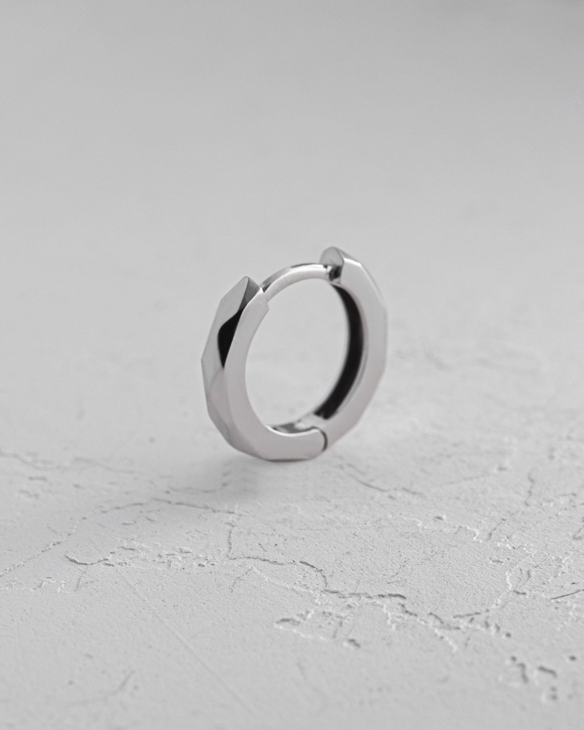 L'orecchino in oro bianco 14k "FLASH" affascina con la sua geometria unica e il design moderno. Questo orecchino singolo da uomo, rifinito in opaco, si distingue tra gli altri per i suoi bordi sfaccettati che simboleggiano velocità, dinamismo e risposta fulminea, ricordandoci momenti che hanno un significato decisivo nella vita.